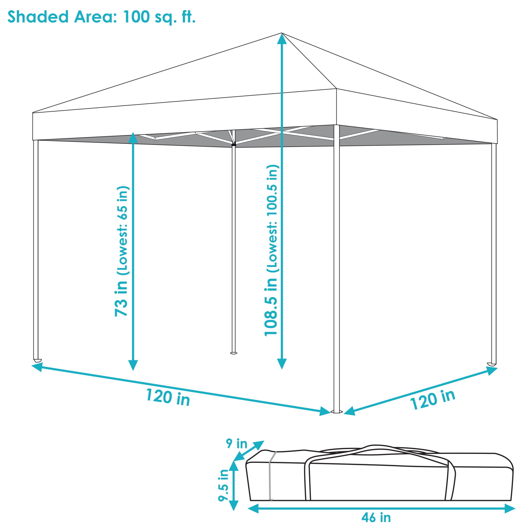 ADJUSTABLE HEIGHT: This pop up tent measures 120″ L x 120″ W and weighs 32.2 lbs. It can be adjusted to a choice of three heights 100″ H, 104″ H, or 108″ H. It folds down to 45.5″ L x 7.25″ W x 7.25″ H. The clearance height is 65″ H (shortest setting), 69″ H (middle setting), and 73″ (tallest setting). It provides 100 square feet of shade coverage. The legs are 1″ square with 3″ long feet with 3 holes for stakes. The carrying bag measures 46″ L x 9″ W x 9.5″ H and weighs 1.0 lb. HEAVY-DUTY CANOPY: This weather-resistant pop-up canopy tent features a durable white powder-coated steel frame for lasting strength with a heavy-duty PU-coated 150D Oxford fabric canopy roof to resist water and the outdoor elements. INCLUDES CONVENIENT CARRYING BAG: This shade canopy includes 1 canopy, 4 ropes, 8 stakes and 1 durable carrying bag for easy transportation. SHELTER FROM THE ELEMENTS: This outdoor canopy can be used to provide refreshing shade and shelter during the next outdoor party, sport event, camping trip, or farmers market. WORRY-FREE PURCHASING: Sunnydaze Decor backs its products with a 1-year manufacturer’s warranty.