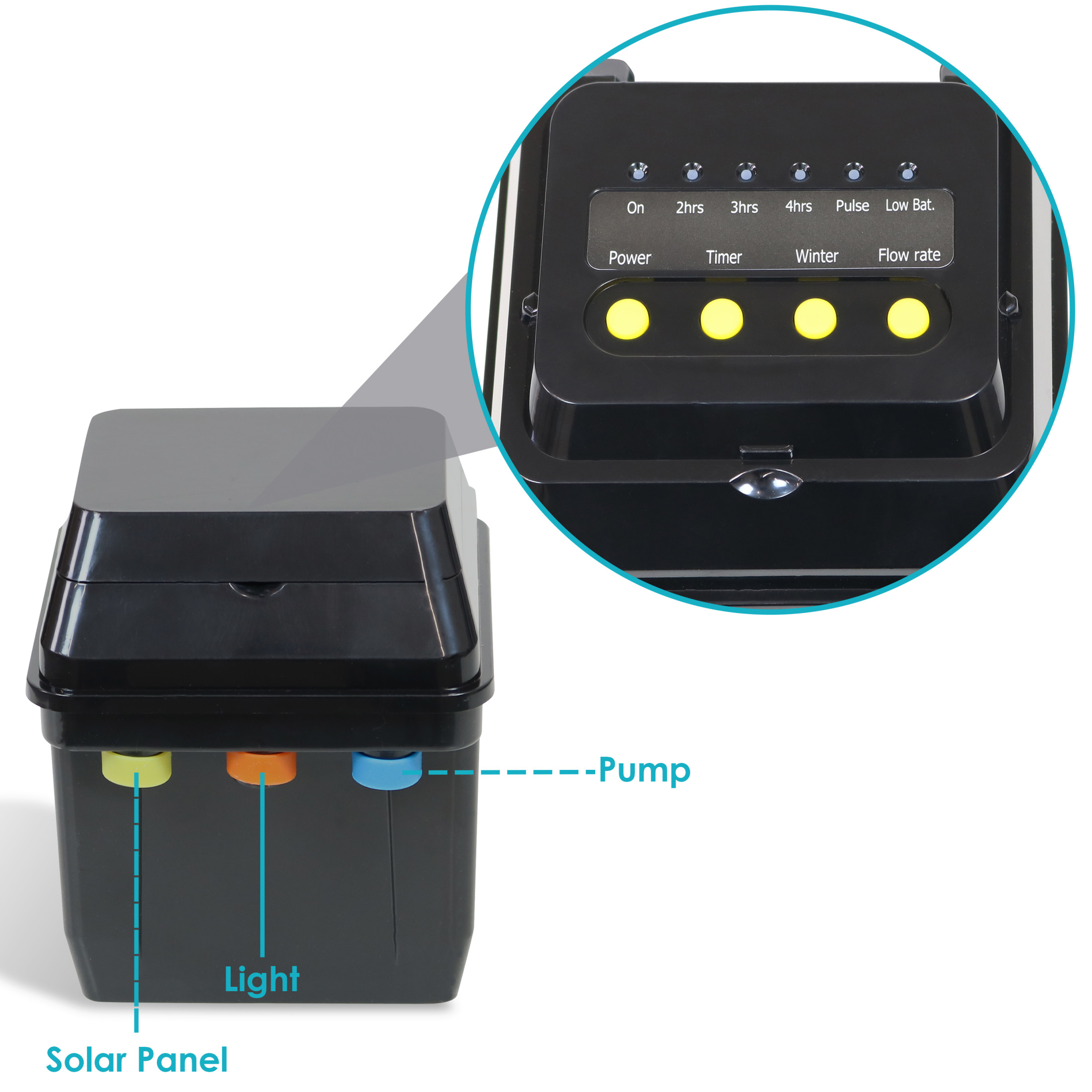 Sunnydaze 132 GPH Solar Pump for Outdoor Fountains with Battery and Light This solar-operated pump, panel, and battery backup kit comes with everything needed to set up a DIY outdoor fountain experience, sure to brighten, uplift, and draw attention. It features a flow rate of 132 gallons of water per hour and a lift of up to 56 inches high when 1/2-inch tubing is connected. When the power button is on, the pump will run via solar power when the panels are in direct sunlight. When the sun goes down the battery pack will operate for up to 4 hours on a full charge. To use the battery pack on this continual use mode, simply press the [Power] button until the [on] indicator light illuminates. This will run the pump using the battery pack until it runs out of power. This kit includes a solar panel, a ground spike to secure the solar panel, four 3-inch extension tubes, a battery pack, a pump with four foot pads, LED lights, cables (two 16 feet, one 77 inch), and two fountain spray heads to create the feature desired.