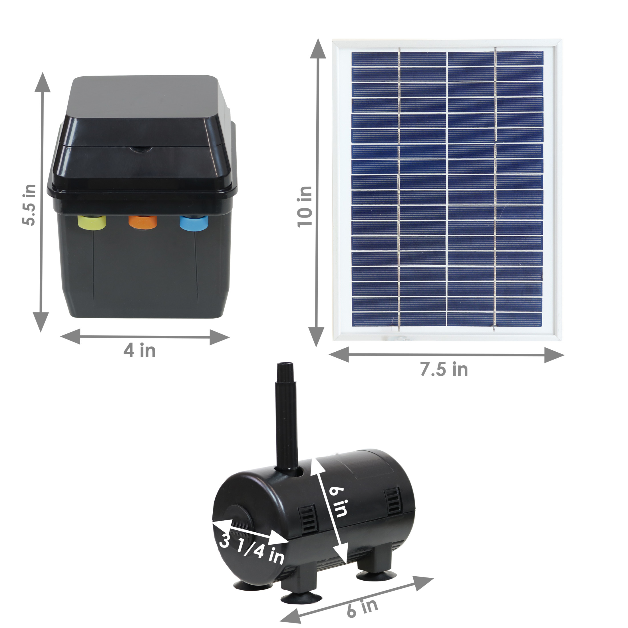 CONVENIENT SMALL SIZE: The pump measures 6″ W x 3-/14″ D x 6″ H. The solar panel measures 10″ H x 7.5″ W. The kit weighs 4.6 lbs PRACTICAL FUNCTIONS: When used in a fountain, the pump pushes or sprays water up to 56 inches high at a rate of 132 gallons per hour. When used with a spray head, the pump can push the water between 32″ to 42″ in the air. INCLUDES EVERYTHING NEEDED: This kit features a solar-powered panel, a battery pack, a ground spike for the solar panel, a 132 GPH submersible pump with four foot pads, an LED light, two 16-foot cables, a 77″ cable that connects the solar panel to the battery pack, four 3-inch extension tubes and two different fountain spray heads. SOLAR POWERED: This solar panel needs direct sunlight to run during the day and store energy in the battery pack. Fully stored energy in the battery pack will run the pump for up to 4 hours. The LED light only works at night and will turn on/off automatically. WORRY-FREE PURCHASING: Sunnydaze Decor backs its products with a 1-year manufacturer’s warranty.