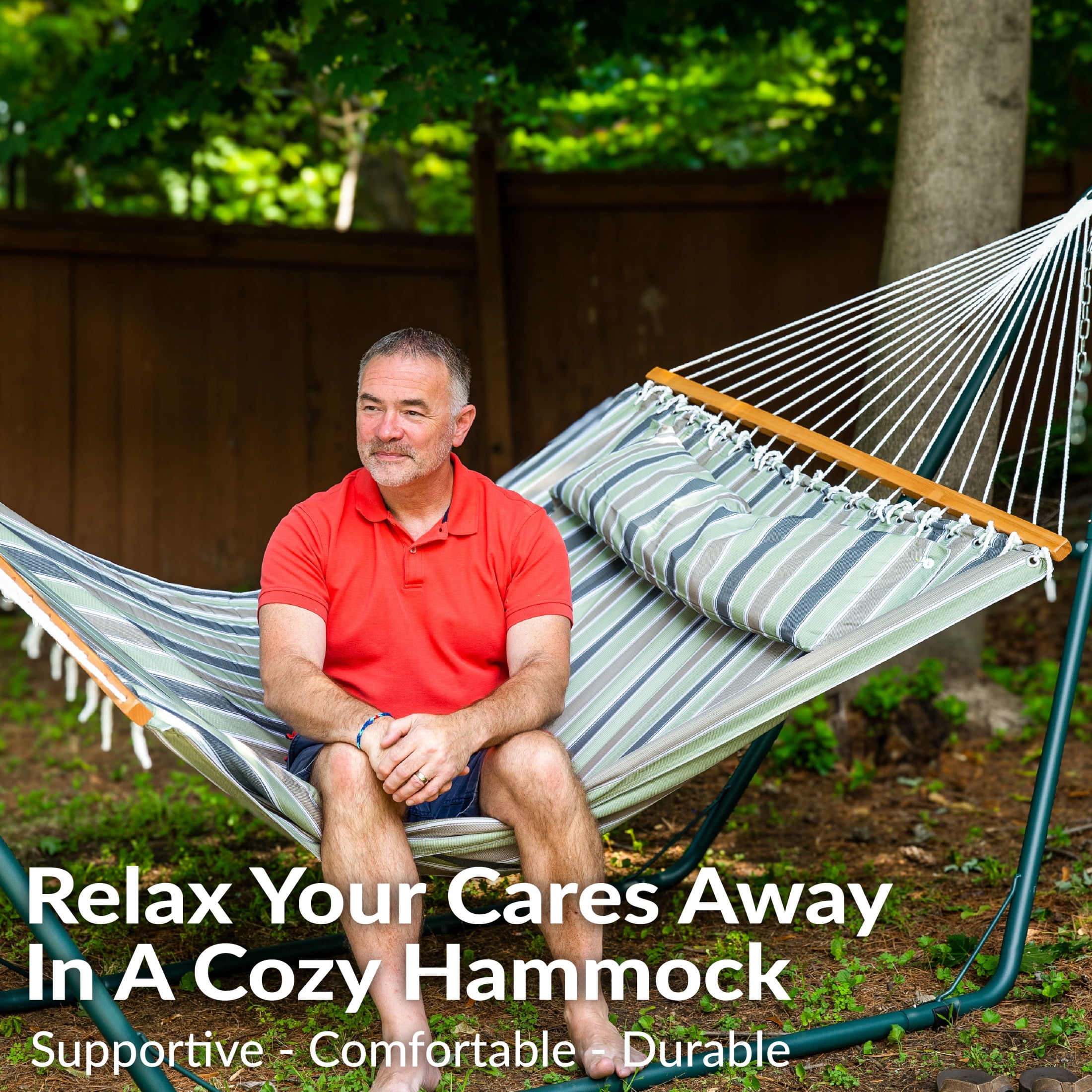 EXTRA SPACE FOR TWO PEOPLE: This spreader bar hammock is 125.5″ W from loop to loop. The bed size is 74″ W x 55″ D. It weighs 10 lbs and has a weight capacity of 450 lbs. This patio hammock provides enough space for two adults to relax comfortably side by side. COMFORTABLE AND DURABLE: This heavy-duty hammock also features hardwood spreader bars to hold its shape and make getting in and out easier. The hammock bed is made from 100% polyester with a plush polyurethane foam fill for a cozy place to relax. VIBRANT DESIGNS TO COMPLEMENT ANY DECOR: This 2-person hammock is available in a variety of colorful patterns to complement anyone’s style. Plus, the fabric has been dye-treated which provides UV resistance to help prevent fading. VERSATILE HANGING OPTIONS: The quilted hammock features attached chains for easy hanging. This two person hammock swing can be tied between trees, poles, or used with a 12′ to 15′ hammock stand (not included). It’s wonderful for a variety of indoor or outdoor locations including the backyard, campsite, patio, sunroom, or bedroom. WORRY-FREE PURCHASING: Sunnydaze Decor backs its products with a 1-year manufacturer’s warranty.