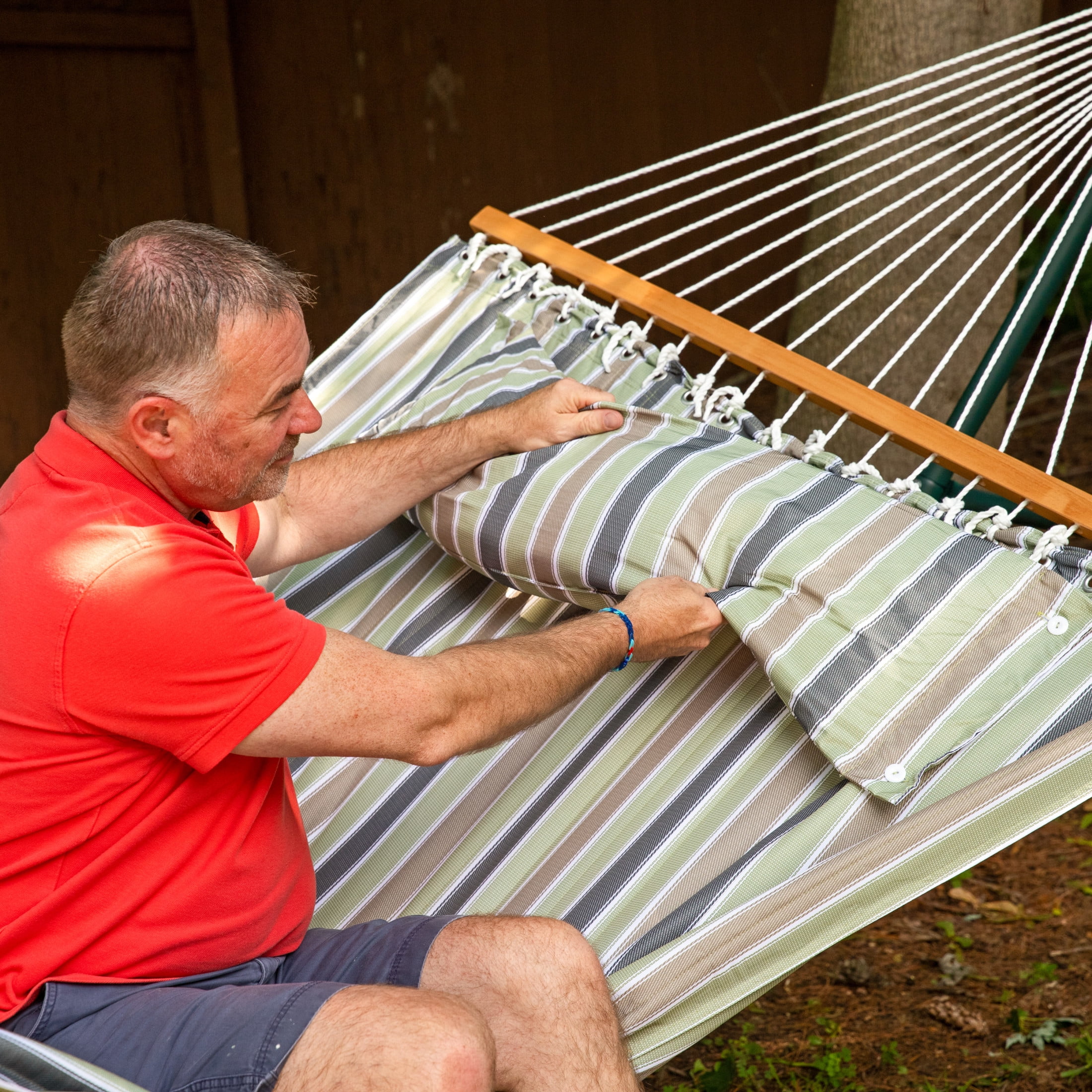 Sunnydaze 2-Person Quilted Polyester Spreader Bar Hammock, 450 lb Capacity – Khaki Stripe