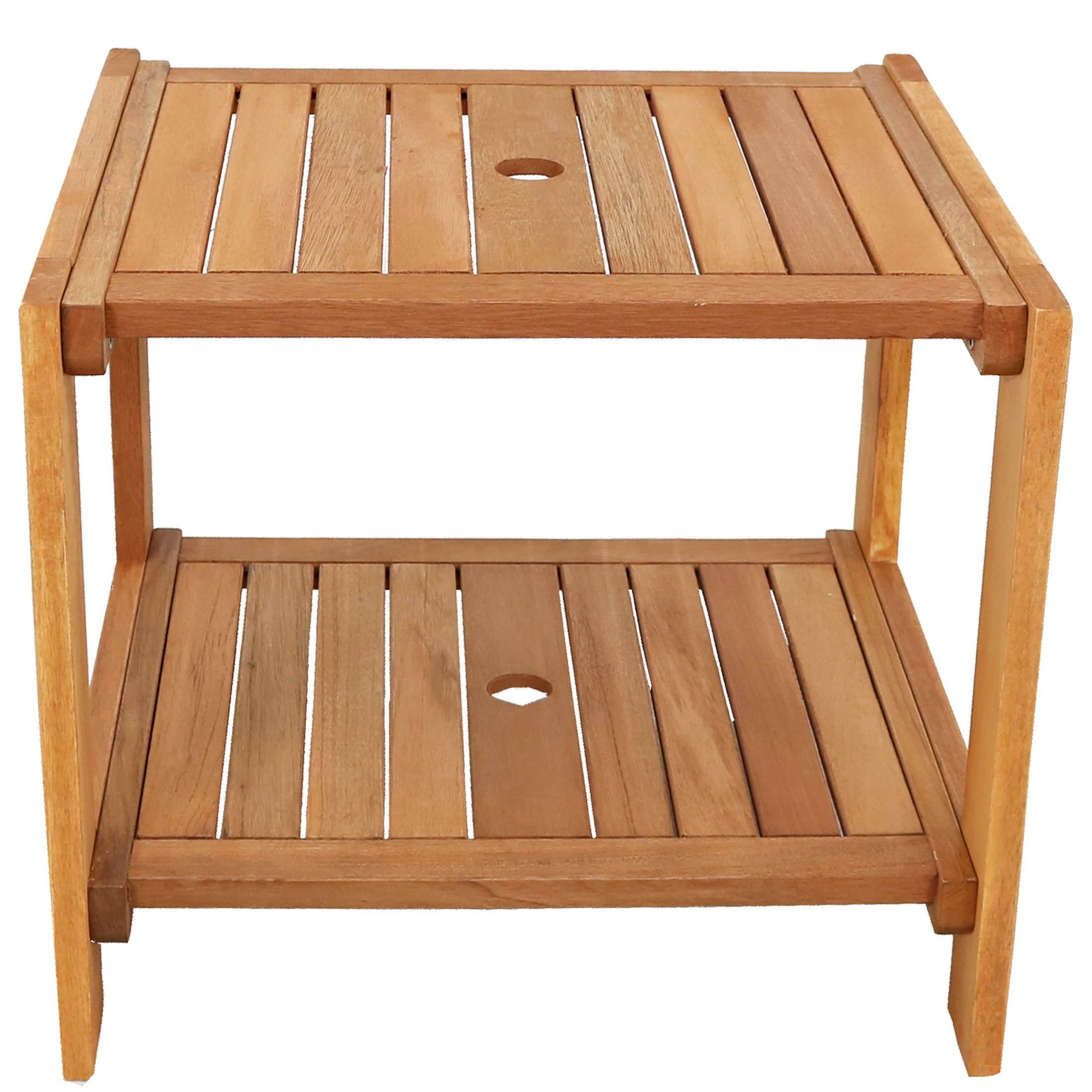 Sunnydaze 20.5″ Meranti Square Outdoor Side Table Add an extra table to any outdoor living space with the meranti wooden outdoor side table. Constructed of meranti wood, this outdoor piece of furniture features an attractive teak oil finish that enhances the natural beauty of the material and increases the durability of the wood against the outdoor elements. Still, to ensure longevity, make sure to cover this table or bring it indoors in harsh weather. This side accent table features a hole in the center to accommodate a patio umbrella for extra shade (please note, a patio umbrella is not included and must be purchased separately). It also features a bottom shelf for storing towels to dry off after swimming in the pool or keeping a cozy blanket on hand for chilly evenings on the patio. Plus, all the components, hardware, and tools are included, so this table can be assembled right out of the box.