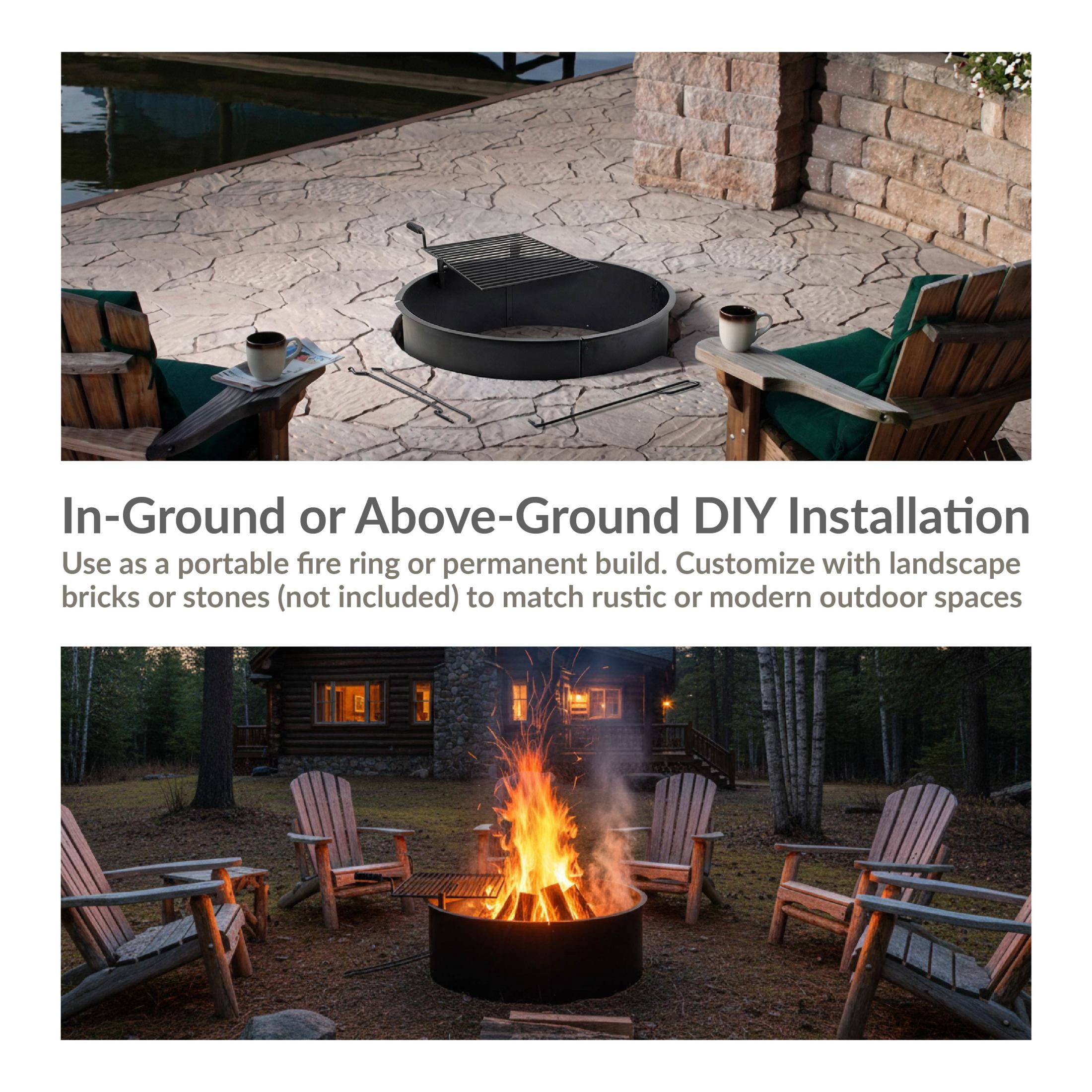 Sunnydaze 36″ Round Steel Wood-Burning Fire Ring Simple to set up and easy to use, this campfire ring is great for use in the backyard, at the campsite, at the cabin, or anywhere else a beautiful fire pit ring is desired. This outdoor firepit ring insert and rectangular 360-degree swivel cooking grate system will add warmth and function to any outdoor area. This campfire ring is sure to be a gathering space for family and friends for barbecues, reunions, smores, and hangouts during long summer nights. Each ring and cooking grate set features a durable steel construction with a black high-temperature paint finish that will ensure it lasts through many seasons. The simple 4-piece design comes with everything needed to have a great fire right out of the box. Each set includes a rectangular detachable cooking grate, a 4-piece campfire ring, a poker to safely maneuver firewood, 2 anchors to secure the ring to the ground, and a handle to easily swivel the cooking grate away from or towards the flames.