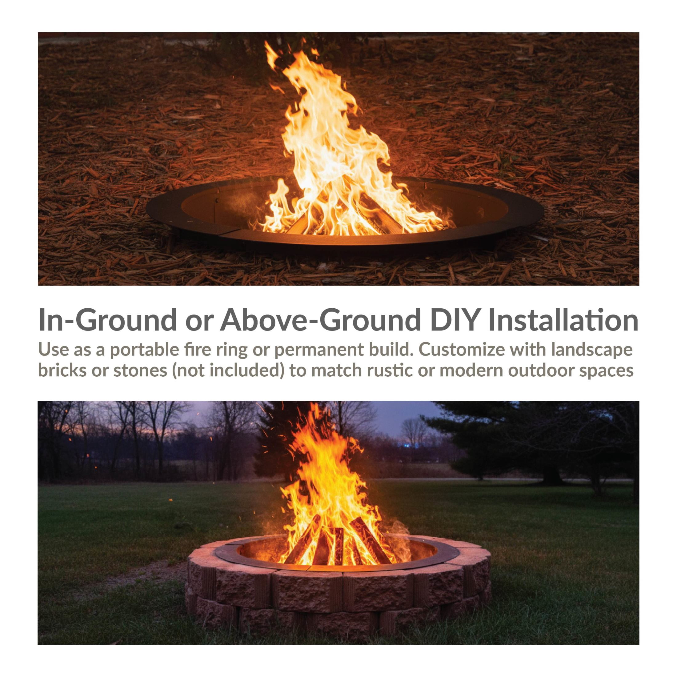 GREAT SIZE FOR GATHERINGS: This outdoor fire pit ring is large enough for many people to gather around a fire in the backyard or campground. It measures 39″ inner diameter (45″ outer diameter) x 10″ H and weighs 32 lbs, making it easy to move around the yard. BUILT FOR SAFETY AND STABILITY: This round heavy-duty fire pit insert is made of sturdy steel and finished with a high-temperature paint to ensure long-lasting quality and functionality for all weather types and higher resistance to rust. EASY TO ASSEMBLE: This large 4-piece metal fire pit liner insert is easy to put together and assembles in minutes (NOTE: There is no bottom to this fire pit liner). VERSATILE AND CUSTOMIZABLE: Whether building a rustic stone fire ring or a sleek modern setup, this fire pit kit provides a solid foundation. Because it can either be used in-ground or above-ground, it seamlessly fits a DIY or pre-built design, providing complete creative freedom for the ultimate backyard upgrade. Add a personal touch by placing landscape pavers (not included) around the fire ring. WORRY-FREE PURCHASING: Sunnydaze Decor backs its products with a 1-year manufacturer’s warranty.