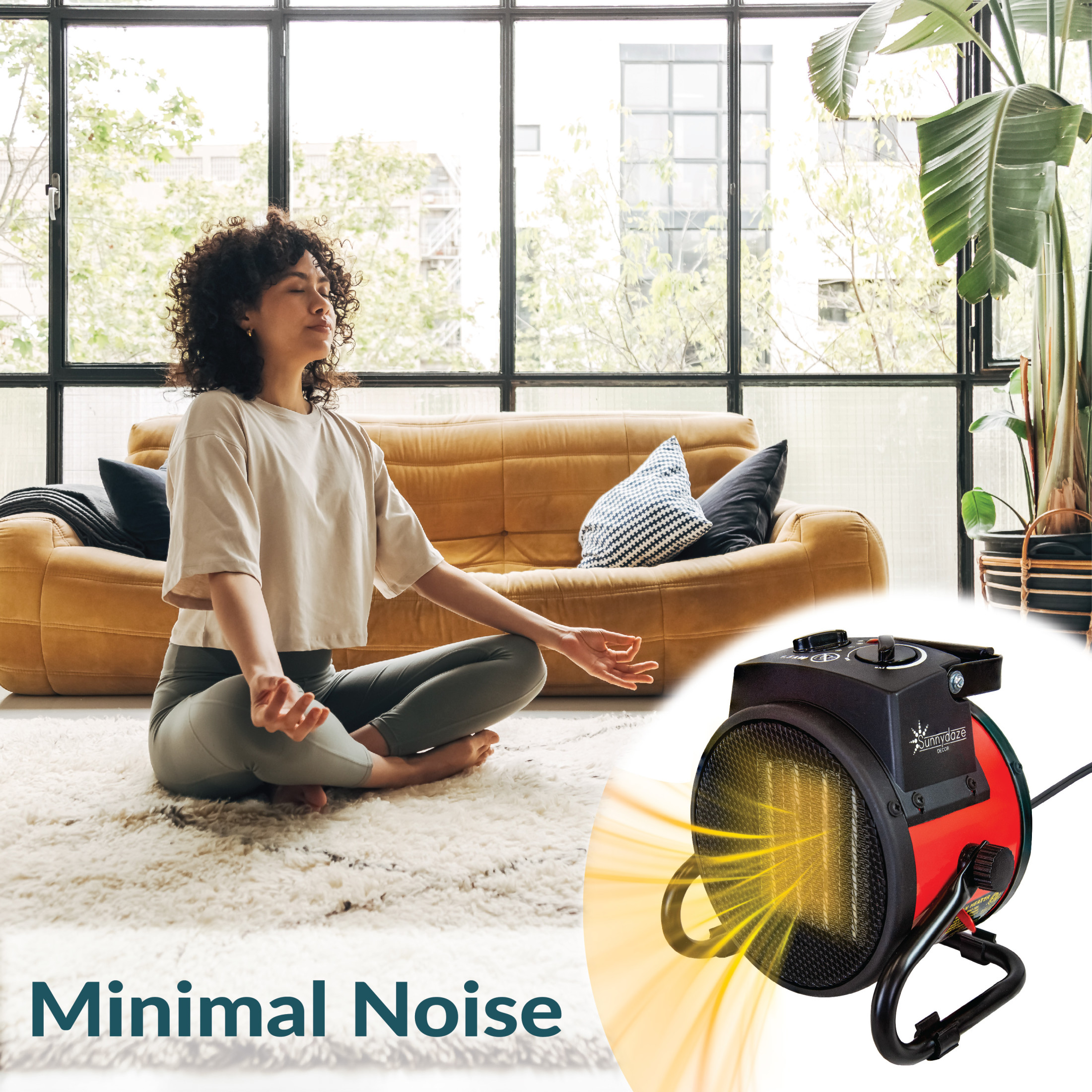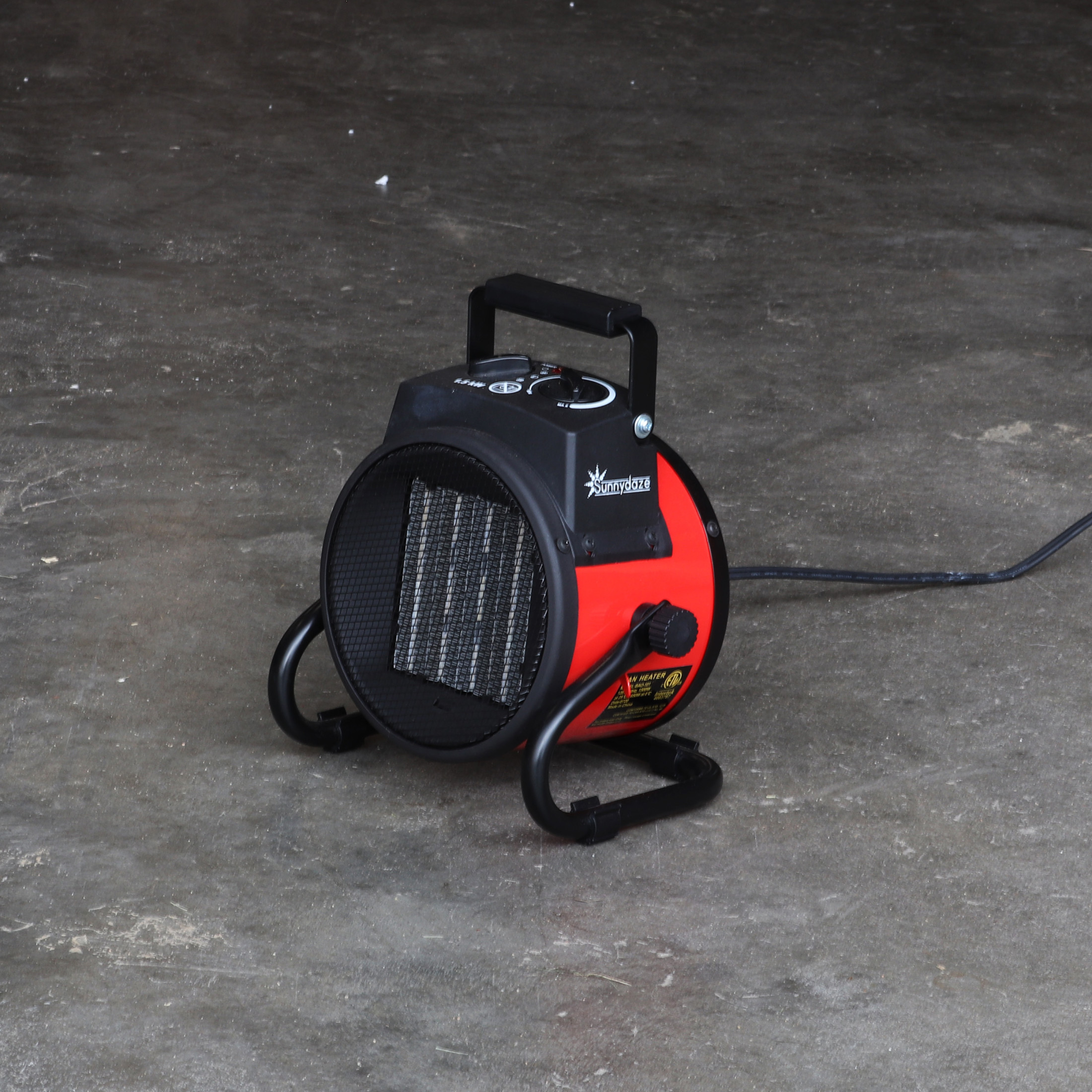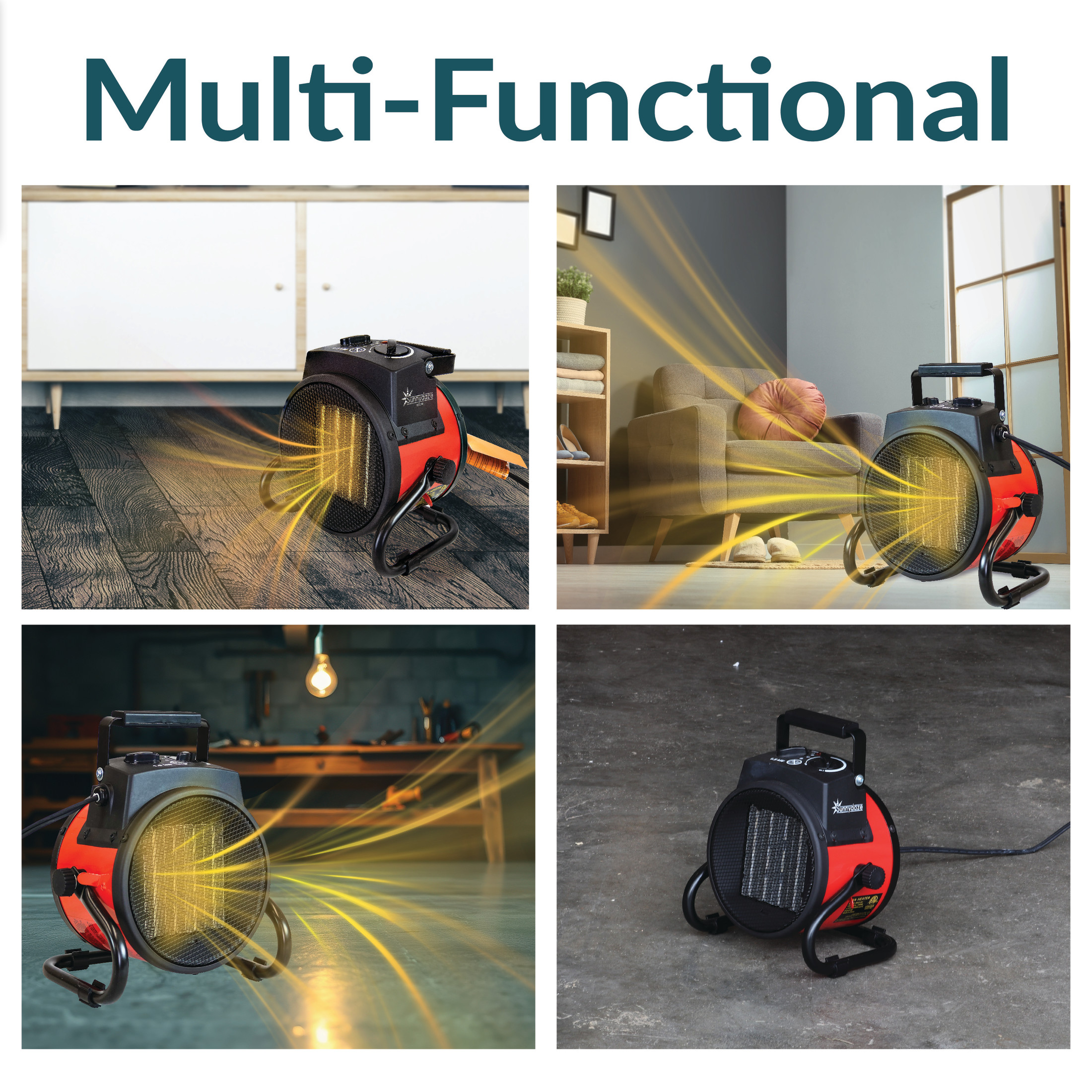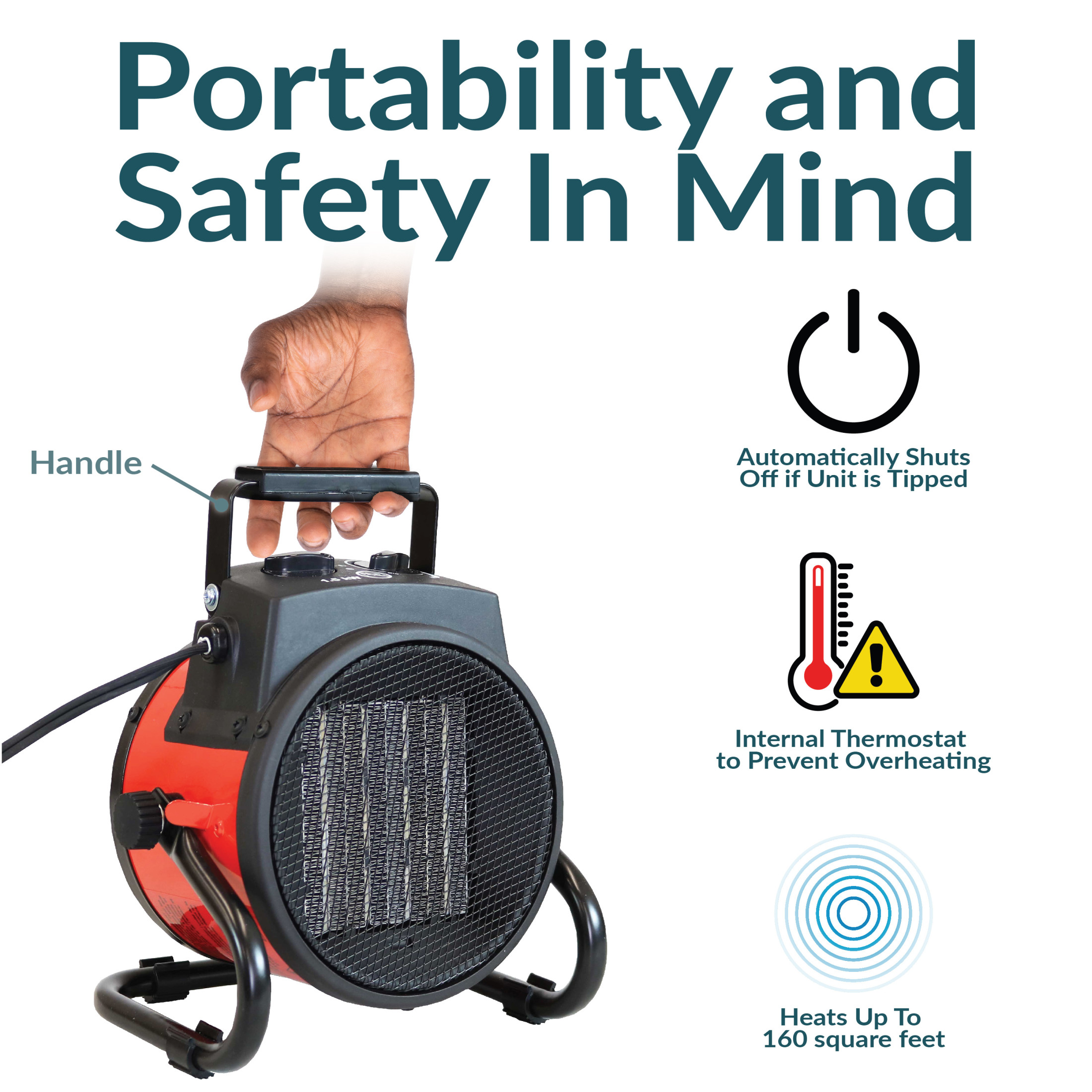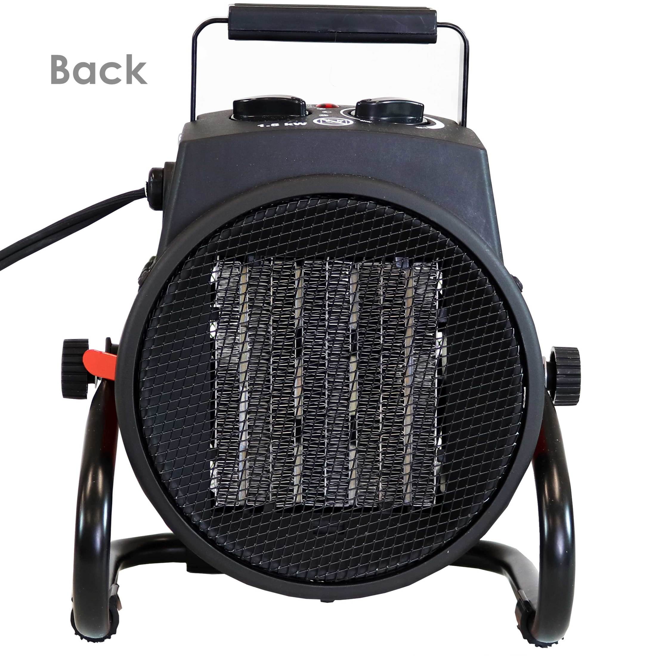 WARMS UP COOL SPACES: This garage space heater measures 8.25″ W x 6.5″ D x 8.5″ H (handle folded down) or 9.75″ H (handle extended). The unit weighs 3.8 lbs. It has a 6-foot long power cord. It has 1,500 watts; 15 amps, 120 volts. and 5,120 BTUs per hour. It heats an area of 150 square feet. POWERFUL LITTLE HEATER: Constructed with a PTC ceramic heating element to provide constant heat, this portable electric heater has 3 settings: fan only (no heat), low heat (750W) and high heat (1500W). The power indicator light shows when the heater is turned on. The settings are easy to adjust with a dial. A separate dial is used to adjust the temperature. The heater surface stays cool after prolonged use. SUITABLE FOR UTILITY USE: This ceramic space heater provides quick warmth with minimal noise, making it a practical option for keeping your garage or project area comfortable during winter days. Designed for indoor use only, it’s great for warming basements, greenhouses, bedrooms, or home office spaces. Easily direct warm air where needed by adjusting the angle of the heater using the two knobs on either side. DEPENDABLE SAFETY FEATURES: The small garage heater is equipped with an internal heat-limiting thermostat and overheat protection circuit. When a potential overheat temperature is reached, the system will automatically shut the heater off. It features a 2-prong polarized plug. WORRY-FREE PURCHASING: Sunnydaze Decor backs its products with a 1-year manufacturer’s warranty.