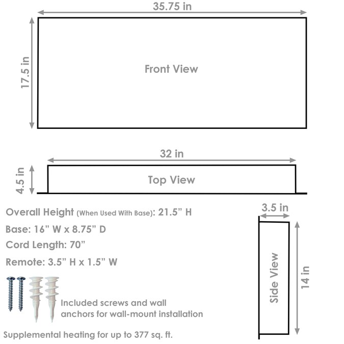 - STYLISH ELECTRIC FIREPLACE: This modern fireplace measures 35.75 in W x 8.75 in D with stand (4.5 in D when wall mounted) x 21.5 in H with stand (17.5 in H when wall mounted) and weighs 33.4 lbs.