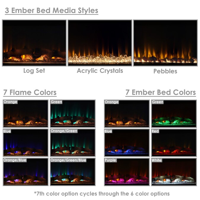 - A VARIETY OF HEATING AND DISPLAY OPTIONS: This portable fireplace offers 7 flame color options, 7 ember bed colors, 3 ambient side lighting options, adjustable temperature settings from 62 to 82 degrees Fahrenheit, and a 30-minute to 6-hour timer.