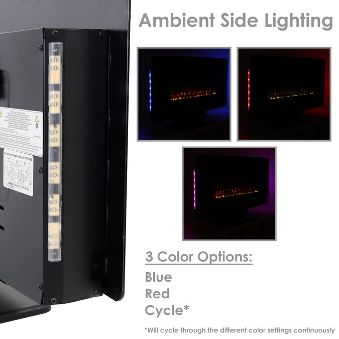 Relax on a cold evening and watch these colorful and realistic LED flames dance with this unique fireplace electric heater. This faux fireplace features a sleek, modern design with a curved face. It is made of durable polypropylene with an elegant glass front to add a touch of contemporary flair to any place in the home including: the office, living room, or bedroom. This versatile electric heater fireplace can be installed two different ways. Mount it to the wall or use the included pieces to set up a freestanding base for placement on a coffee table or entertainment center. Plus, you can change the color of the fire, the side ambient lighting or the ember bed to create the perfect atmosphere. Adjust the heat, set a timer and choose between decorative crystals, pebbles, or a realistic log bed.