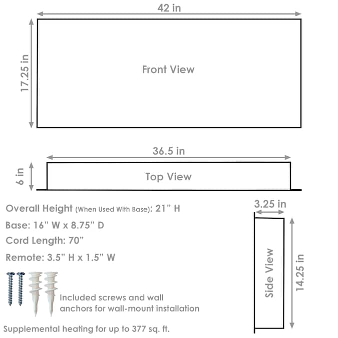 - STYLISH ELECTRIC FIREPLACE: This modern fireplace measures 42 in W x 8.75 in D with stand (6 in D when wall mounted) x 21 in H with stand (17.25 in H when wall mounted) and weighs 36.6 lbs.