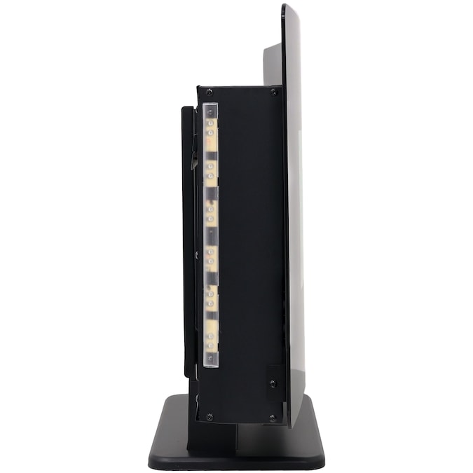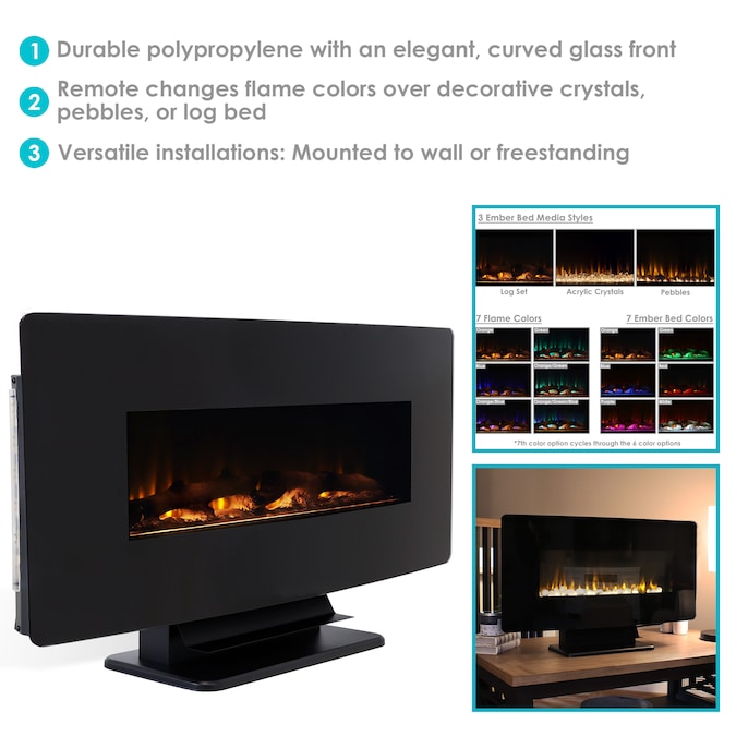 Relax on a cold evening and watch these colorful and realistic LED flames dance with this unique fireplace electric heater. This faux fireplace features a sleek, modern design with a curved face. It is made of durable polypropylene with an elegant glass front to add a touch of contemporary flair to any place in the home including: the office, living room, or bedroom. This versatile electric heater fireplace can be installed two different ways. Mount it to the wall or use the included pieces to set up a freestanding base for placement on a coffee table or entertainment center. Plus, you can change the color of the fire, the side ambient lighting or the ember bed to create the perfect atmosphere. Adjust the heat, set a timer and choose between decorative crystals, pebbles, or a realistic log bed.