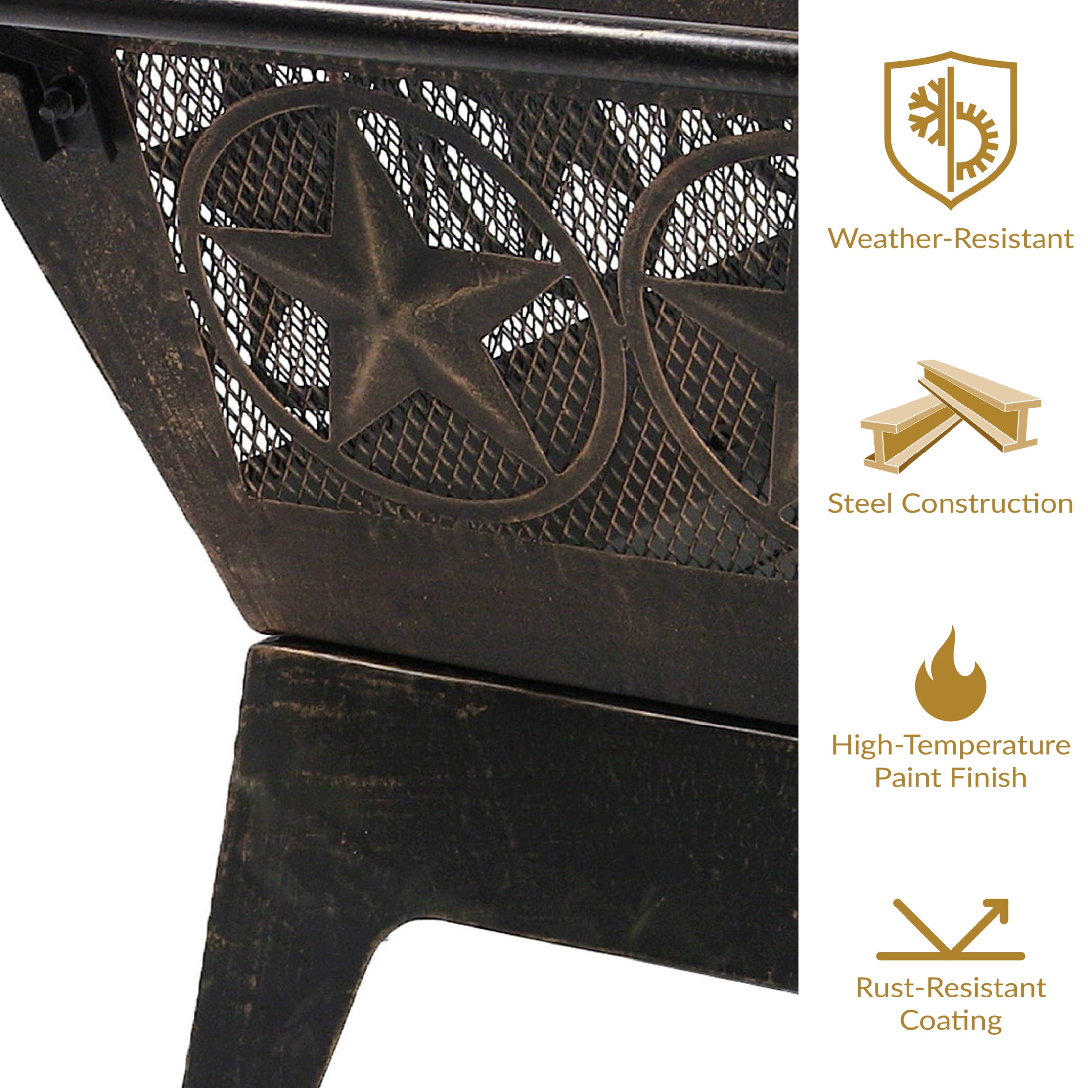 LARGE SIZE FOR OUTDOOR GATHERINGS: The fire pit with cooking grate offers ample space for larger fires while adding a decorative touch to outdoor spaces. The outdoor grill fire pit measures 32″ square x 26″ H overall and weighs 30 lbs. The steel fire bowl is 25″ square x 9.5″ H. The cooking grill grate supports up to 40 lbs when flat or 20 lbs when folded in half. DURABLE, WEATHER-RESISTANT CONSTRUCTION: This wood fire pit for outside is made from heavy-duty steel with a bronze, high-temperature paint finish for long-lasting performance and resistance to heat, outdoor elements, and rust. INCLUDED COOKING GRATE FOR GRILLING: The square fire pit includes a chrome cooking grate that conveniently folds, providing an easy way to grill food or roast marshmallows over an open flame. ENHANCED AIRFLOW AND SAFETY: The mesh sides of the cooking fire pit with star cutouts and built-in wood grate improve air circulation, allowing wood to burn hotter and longer with less smoke. The included spark screen helps contain embers, while the poker allows for effortless fire control and log adjustment. The outer ring surrounding the pit adds an extra layer of security by ensuring a safe distance while tending to the fire. WORRY-FREE PURCHASING: Sunnydaze Decor backs its products with a 1-year manufacturer’s warranty.