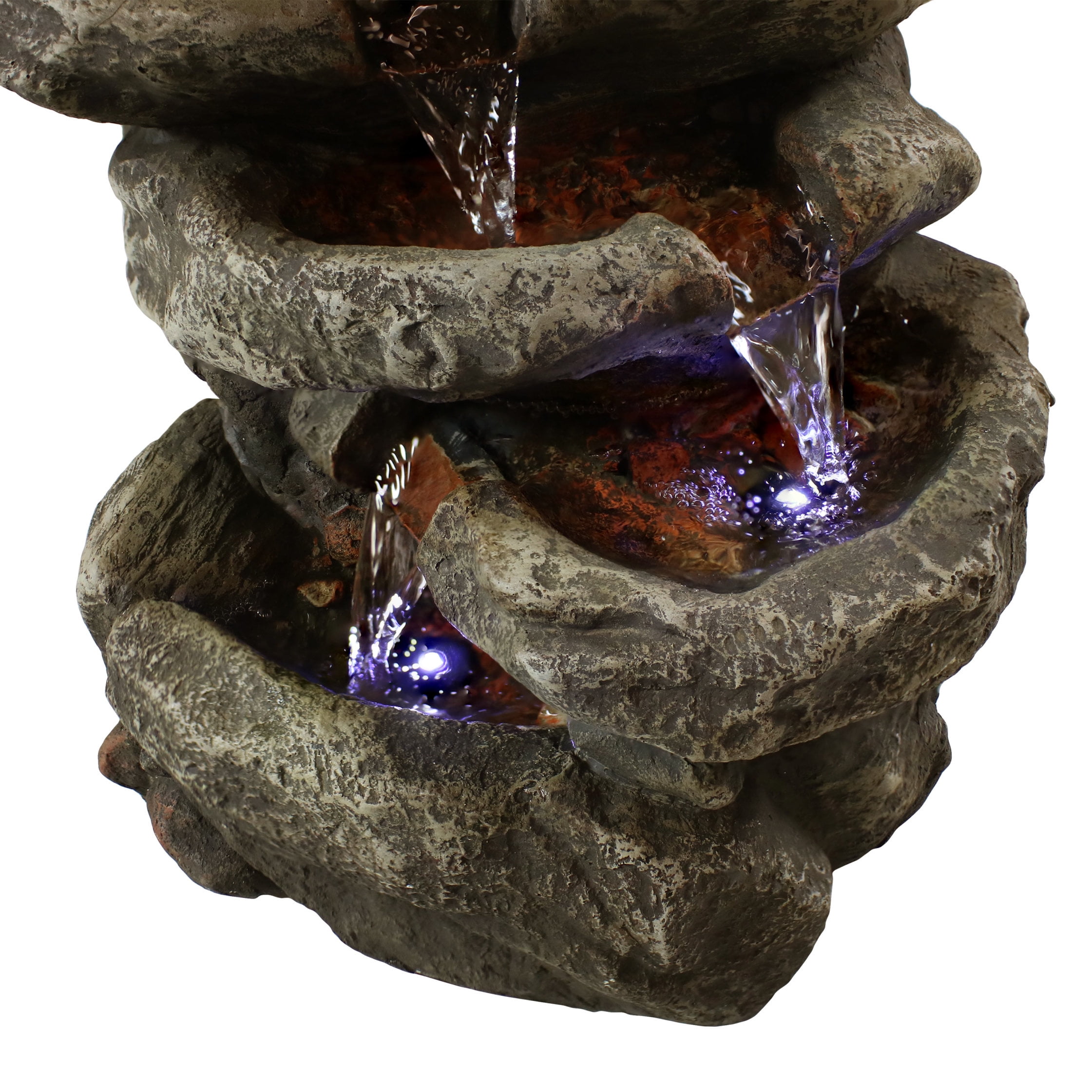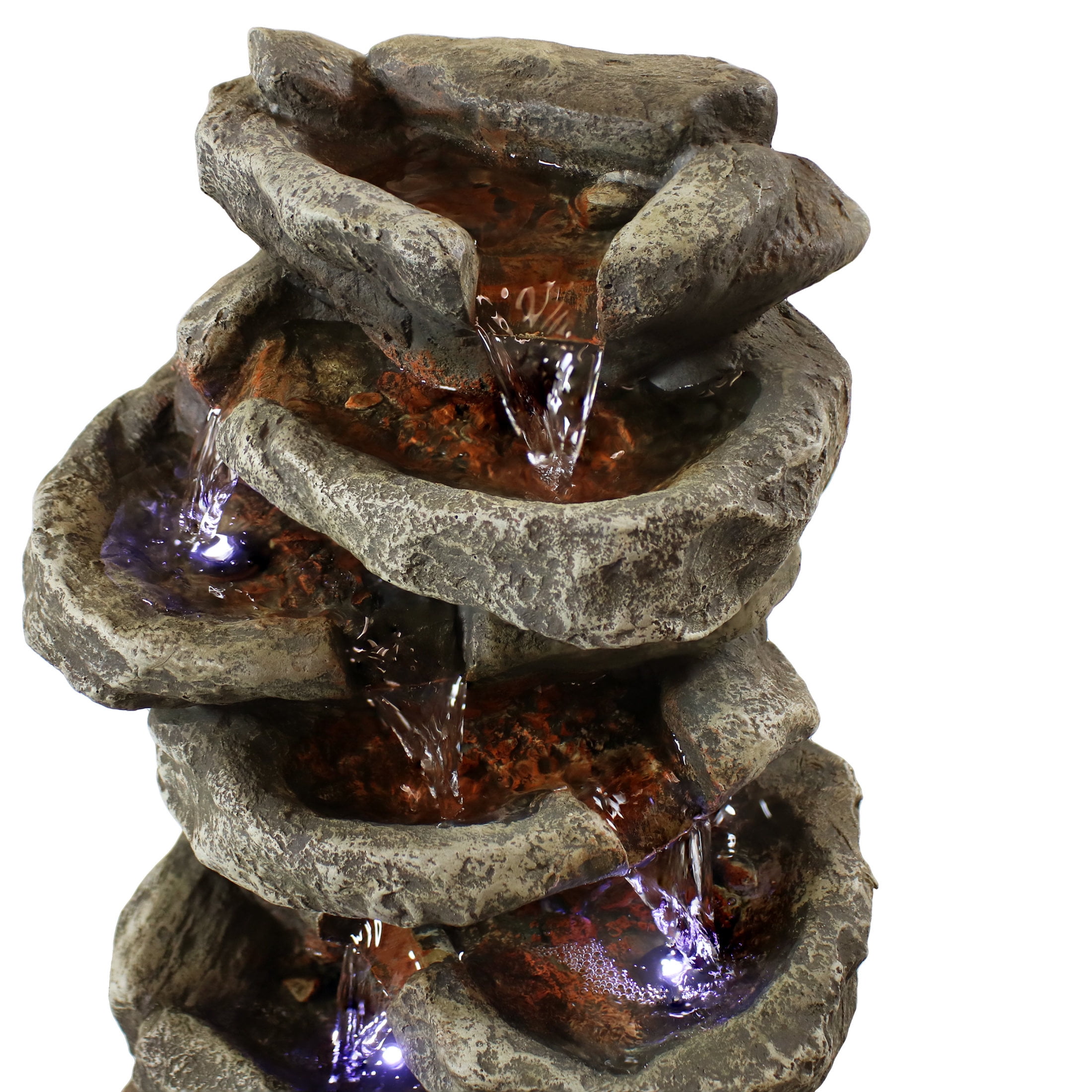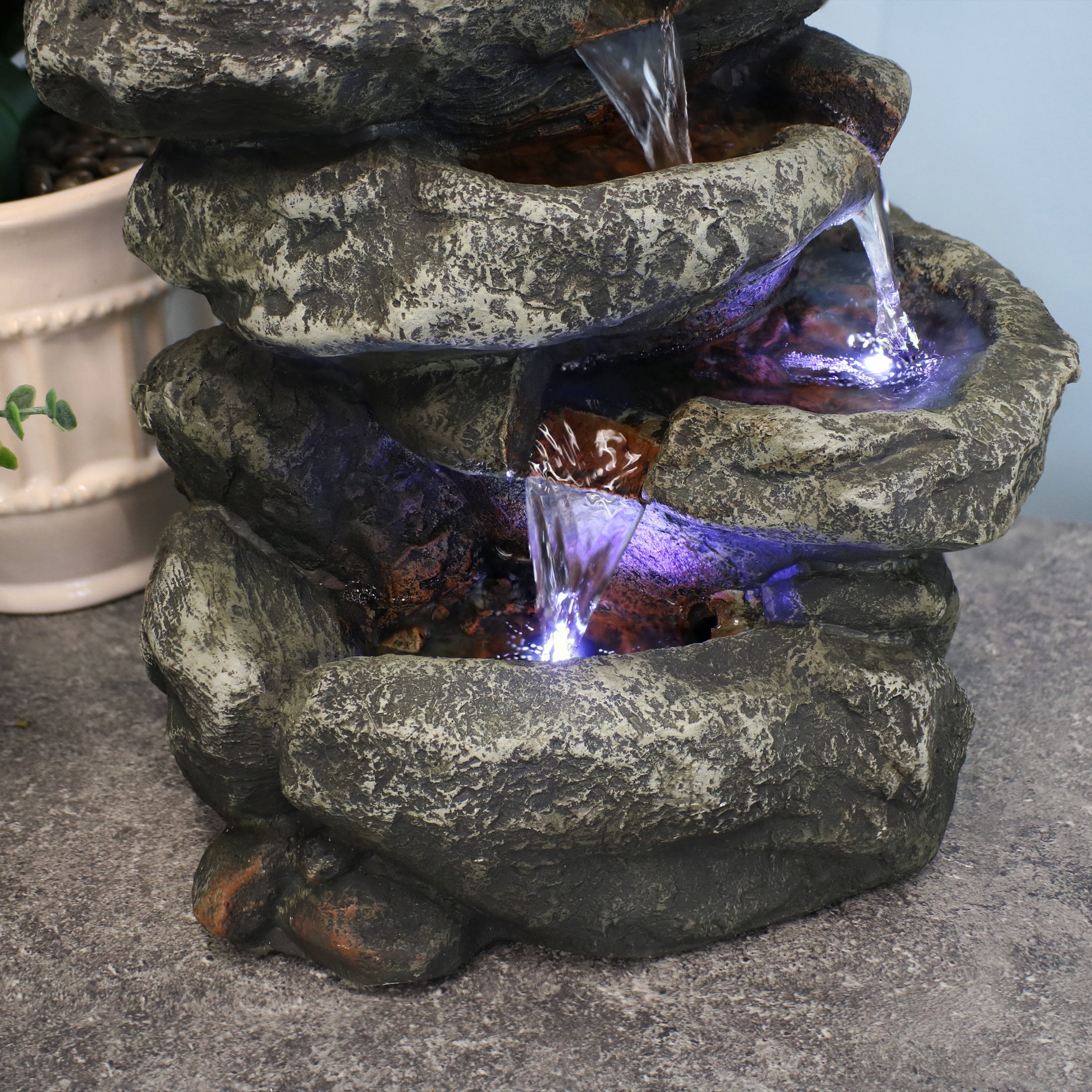Sunnydaze Stone Falls Rustic Polyresin Gray Tabletop Fountain with LED Lights This durable lightweight office fountain is designed to look like real stacked stones with water flowing over each of the 6 levels of rock pools. Made from durable polyresin and fiberglass, this small fountain captures the beauty of nature but uses a lightweight, easy-to-maintain material. It’s just the right size for an end table, desk, or dresser. The electric pump enables the gently flowing water to flow from the top tier all the way down to the bottom pool where it circulates back through the fountain. The small, tiered fountain features small pebbles in each rock pool, padded feet to protect the table surface, natural detailing, and LED lights on the 3rd, 5th, and 6th levels to illuminate the fountain during the evening hours. Plus, this fountain conveniently plugs into any standard electric outlet. Place this fountain in the living room, bedroom, kitchen, or office to stay relaxed anywhere.