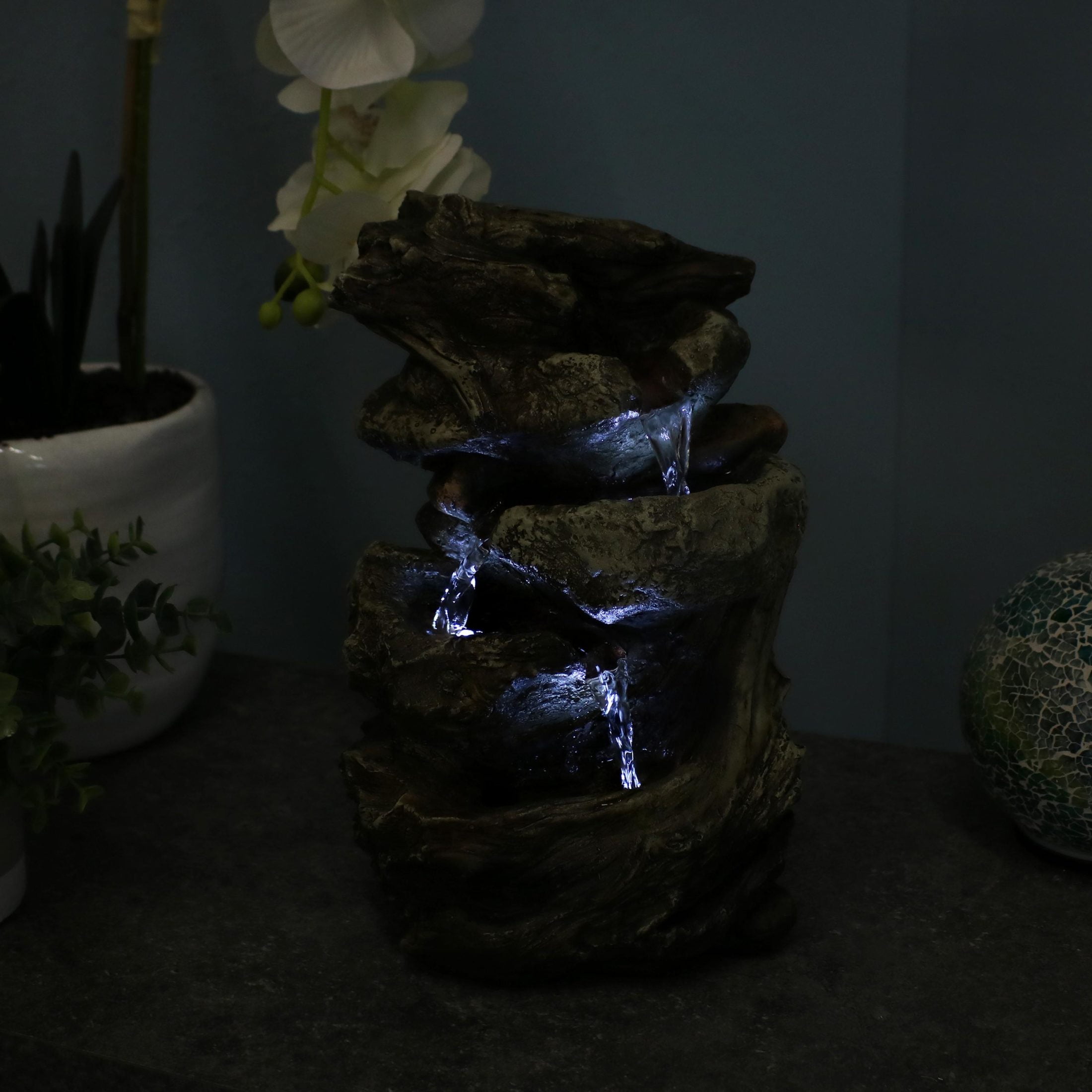 4-TIER WATERFALL FOR SOOTHING AMBIENCE: This tabletop water fountain features a cascading design with four rock-like levels, creating a continuous, tranquil stream that enhances any living room, bedroom, or office as a relaxing fountain indoor centerpiece. DURABLE, LIGHTWEIGHT MATERIALS FOR VERSATILE PLACEMENT: Crafted from polyresin and fiberglass, this tabletop fountain mimics the look of real stacked stone while weighing just 4 lbs, making it a durable and movable option for shelves, desktops, or countertops. ENHANCED DESIGN WITH PRACTICAL FEATURES: This table fountain includes built-in LED lights on the first three tiers for soft evening illumination, foot pads to prevent scratches on surfaces, and a camouflaged access door for easy maintenance of the submersible pump and lighting. SIMPLE OPERATION WITH CONTINUOUS FLOW: Designed as a small water fountain indoor setup, this indoor fountain holds 1 gallon of water and runs quietly with an adjustable electric pump, just plug into a standard outlet for a steady waterfall desktop fountain experience. WORRY-FREE PURCHASING: Sunnydaze Decor backs its products with a 1-year manufacturer’s warranty.