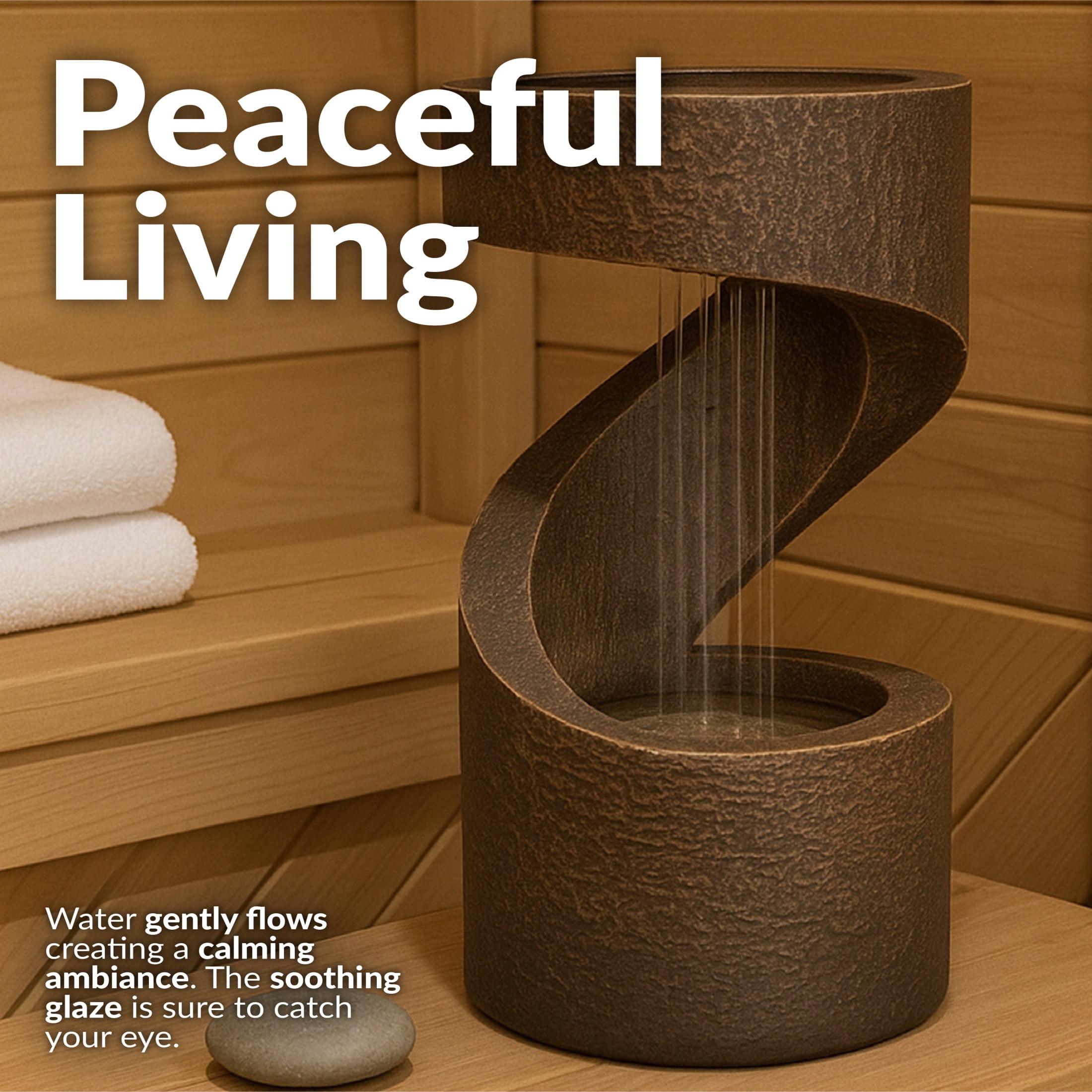 COMPACT SIZE FOR VERSATILE PLACEMENT: With a 7.75″ diameter and 6-cup water capacity, this small water fountain indoor design fits neatly on desks, countertops, or side tables, enhancing any space as a stylish and soothing desktop waterfall. DURABLE BUILD WITH EASY MAINTENANCE: Made from lightweight polyresin in a natural earth-tone finish, this indoor fountain includes a removable 5″ diameter mesh filter to prevent debris buildup, making cleaning quick and hassle-free. MODERN DESIGN WITH CALMING FUNCTIONALITY: This tabletop water fountain features a striking spiral silhouette and a 13.75″ height that brings sculptural style and relaxing water sounds to any indoor space including offices, bedrooms, and waiting areas. COMPLETE INDOOR FOUNTAIN SETUP: This tabletop fountain includes a built-in LED light to illuminate the falling water and a 76″ electric cord with a submersible pump that keeps water circulating quietly and efficiently, no plumbing required. WORRY-FREE PURCHASING: Sunnydaze Decor backs its products with a 1-year manufacturer’s warranty.