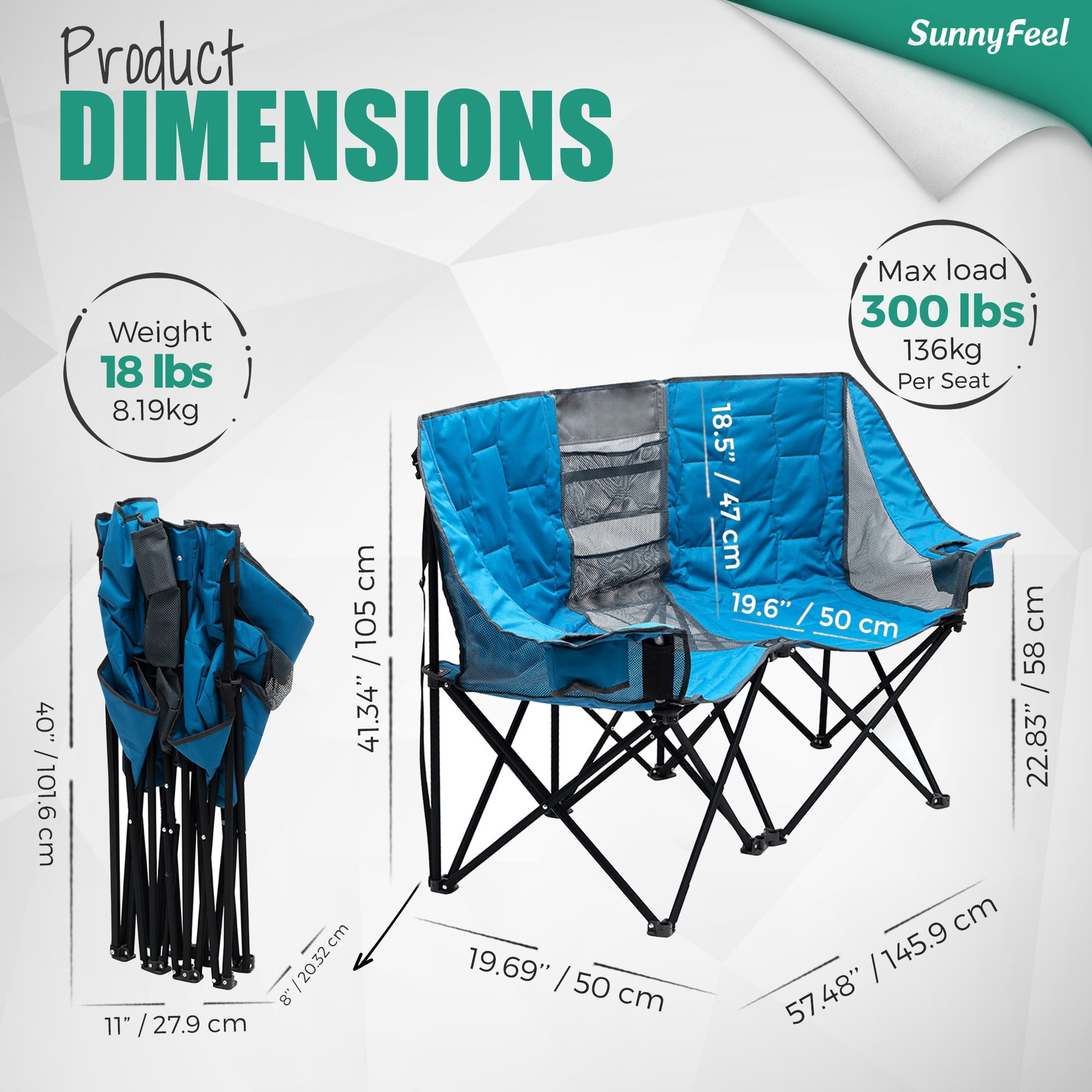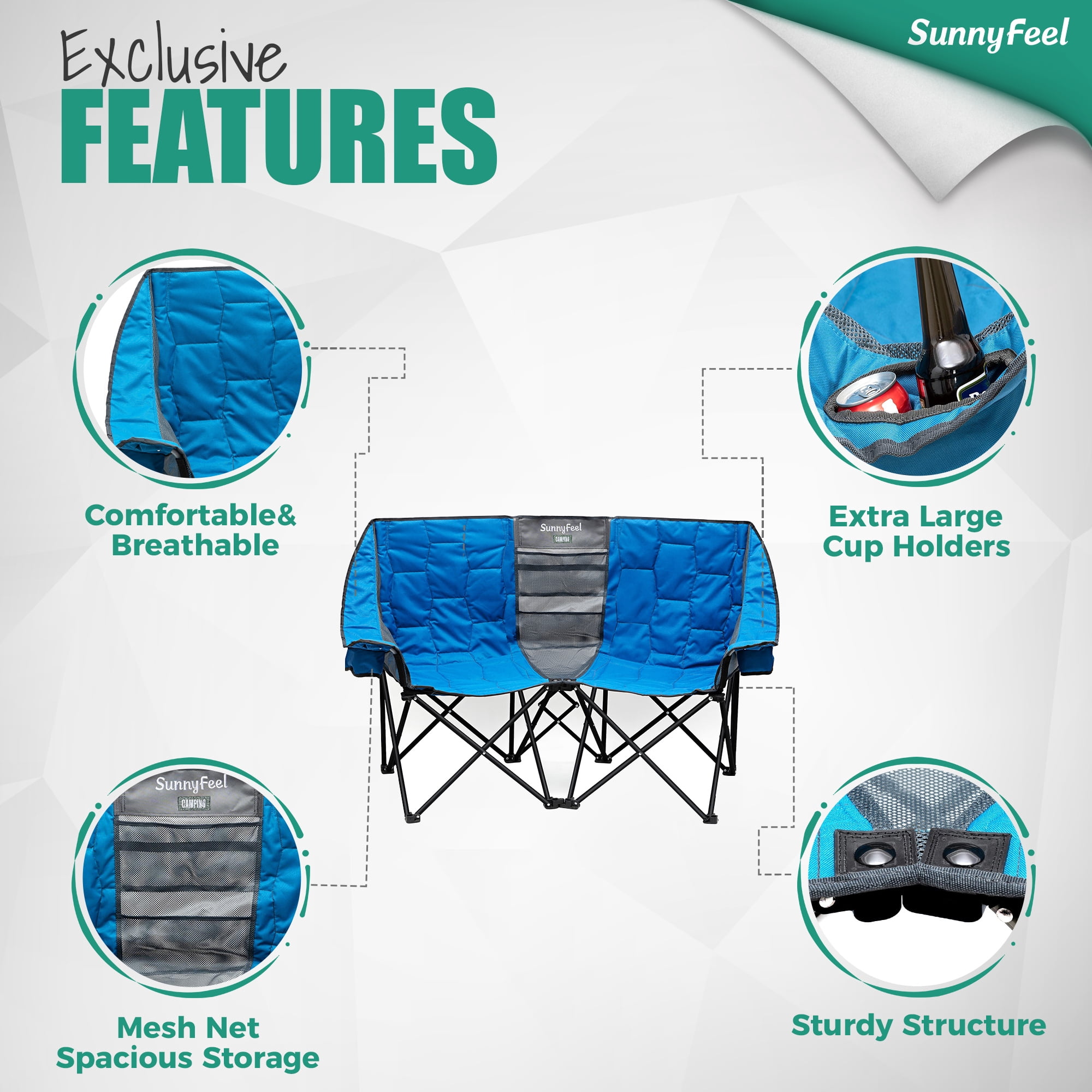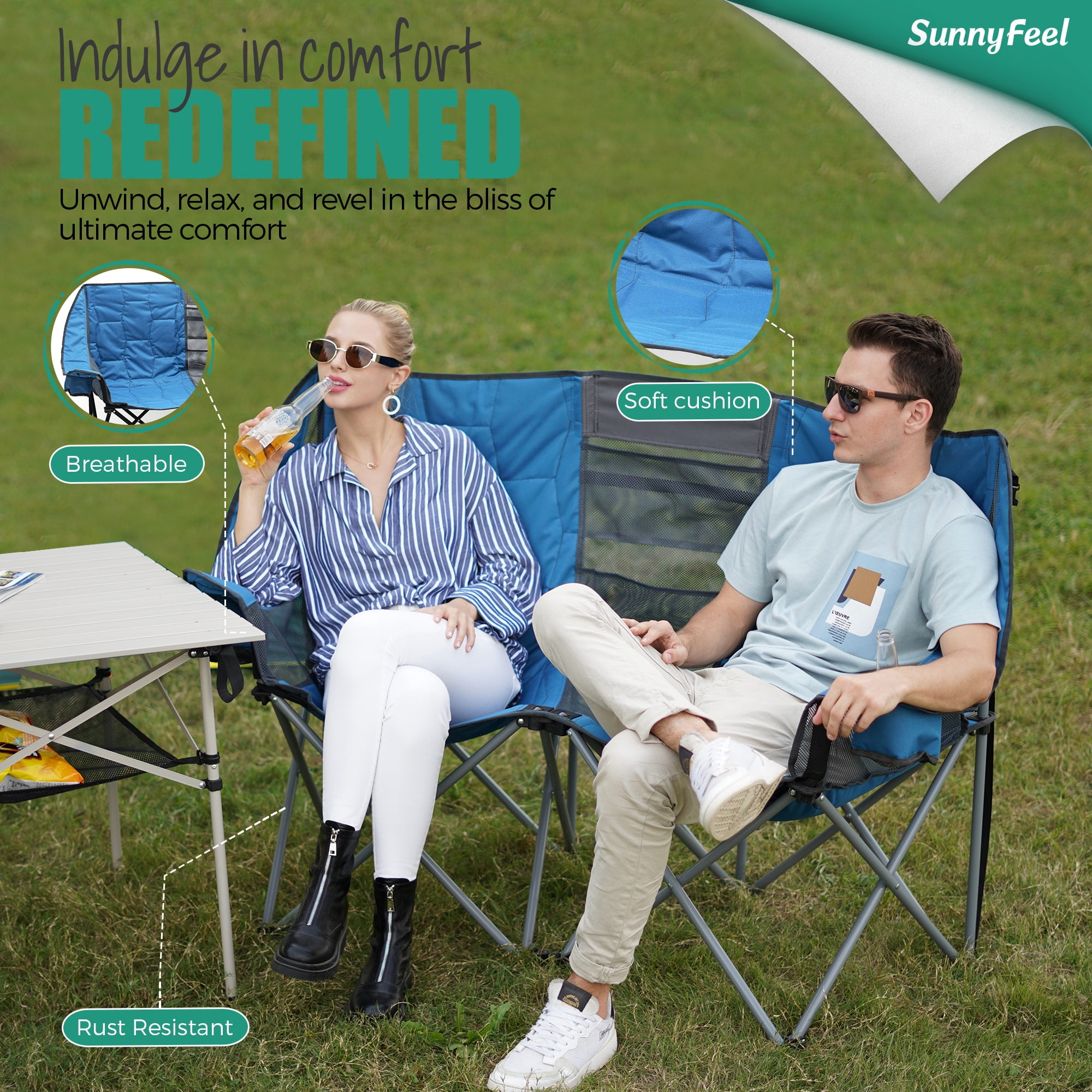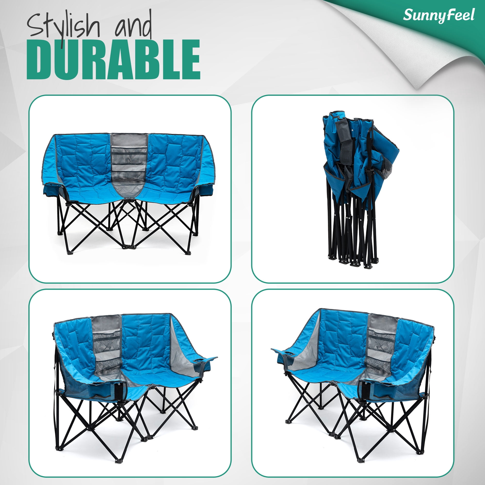 SunnyFeel double folding camp chairs, you can sit with your lover, family, and friends spend a warm time because it is soft and comfortable. It is also a perfect outdoor chair that sits with your pet. The two -seat outdoor chairs have 600x300D Oxford and 200g mesh to have excellent strength, durability and breathability. The built -in two cup holders are used to place drinks and water bottles. When you sit with your lover, you can enjoy the wine while talking. At the same time, the middle mesh of the chair is used to store books, magazines and smartphones. The camp chair for two people comes with a special storage bag. It is convenient to carry. You can use it on the veranda of the house and garden. SunnyFeel’s outdoor chair has a durable frame and is proud of stability and durability. And strong enough to hold up to 300 pounds per seat.