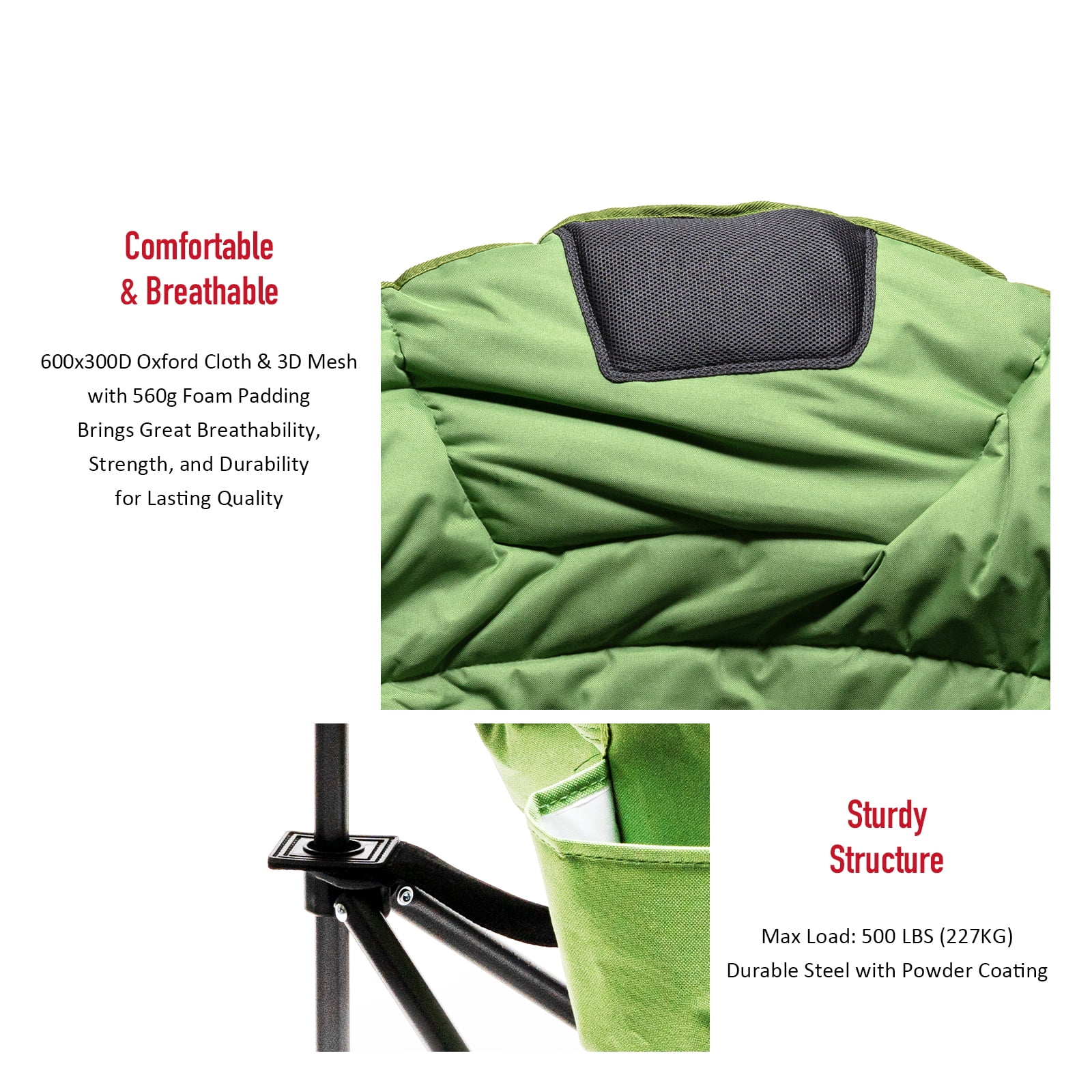 24 hours static weight capacity up to 300 lbs (225 kg), impact weight capacity 225 lbs (102 kg) Folded size: 12 W x 11 D x 41 H inches Seat size: 20.5 W x 22 D x 18 H inches for Adults Green chair 560g Foam Padding Shoulder Strap Attached Carry Bag