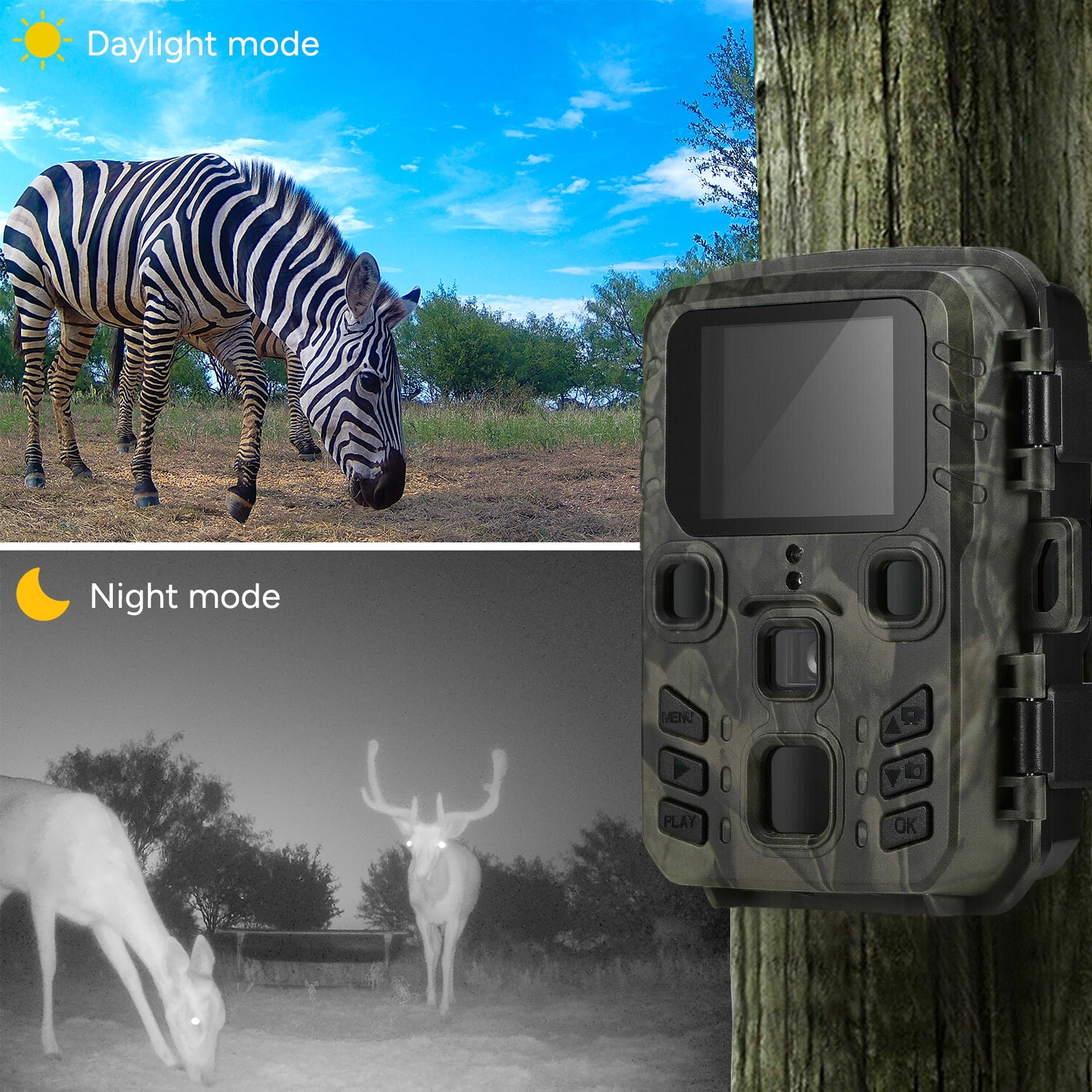 - ????【24MP/1080P Full HD RESOLUTION】HD trail cameras with low glow infrared LEDs captures 1080P full HD videos with clear sound and 24MP clear colorful images by day and night.