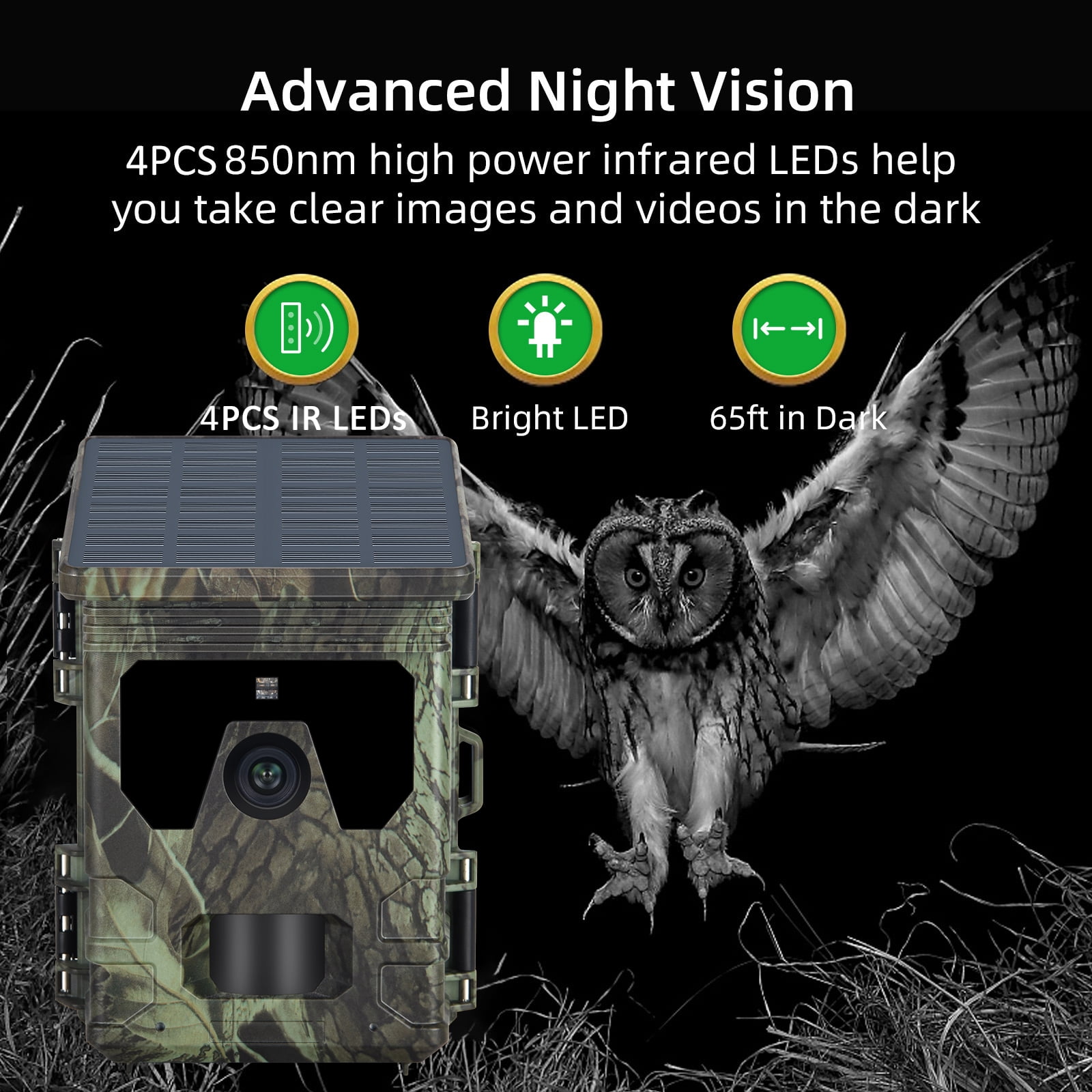 • ??【0.3s Fast Trigger Time & Low Glow Infrared】With 0.3 second super fast trigger time, highly sensitive 120°PIR sensor, 65ft triggering distance, fully automatic IR filter and 4 pcs 850nm high power IR LEDs.
