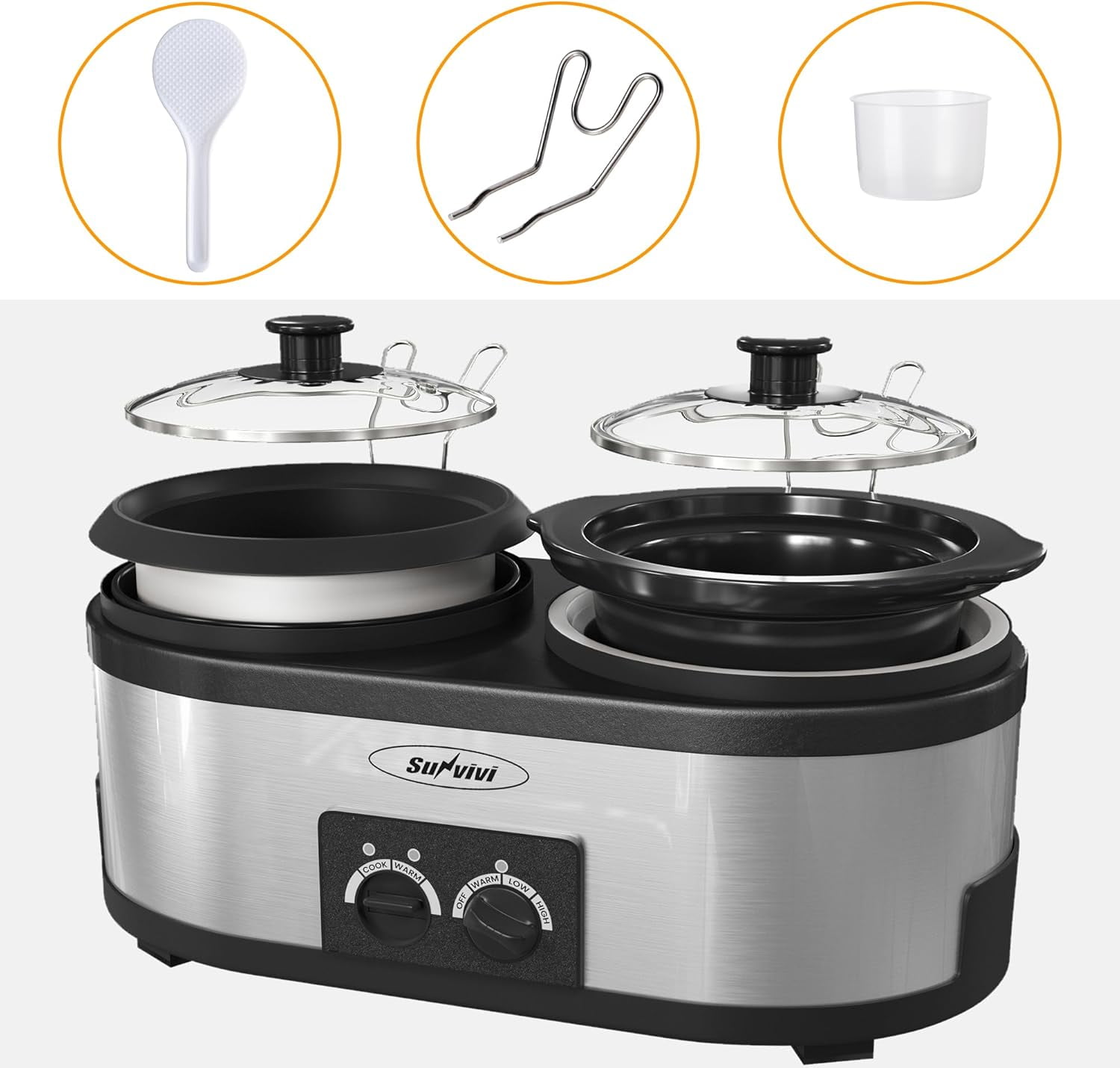 [2 In 1 Design]- Experience the convenience of our 2-in-1 slow cooker and rice cooker, allowing simultaneous stewing and rice cooking for time-saving meals. The rice cooker handles rice, porridge, soups, and more, while the slow cooker excels in baking, stewing, and keeping dishes warm. [DUAL CONTROL KNOB] – Our cooker features two independent knobs: one for the slow cooker with low, high, and warm settings to accommodate various culinary needs, and another for the rice cooker, complete with warm and cook indicator lights for easy monitoring. Additionally, it automatically switches to keep warm mode, ensuring perfectly cooked rice every time! [SUITABLE CAPACITY] – Featuring a 3-cup rice cooker and a 1.5-quart slow cooker with low, high, and warm settings, this combination is perfect for serving 1 to 3 people. Whether you need a quick meal for one or a cozy dinner for a small group, it offers both convenience and efficiency for your daily cooking needs. [EFFORTLESS CLEANING] – Cleaning our multi-cooker is a breeze! All components, including the ceramic pot, aluminum pot, glass lid, rice scoop, measuring cup, and lid rests, are dishwasher safe, making cleanup hassle-free. Enjoy your cooking without the worry of tedious maintenance! [BROAD APPLICATION] – This versatile 2-in-1 cooker is perfect for a variety of settings, making it an ideal compact addition to kitchens, restaurants, offices, dormitories, and RVs. It also makes a thoughtful gift for family and friends, ensuring convenience and functionality in any culinary space. Enjoy the flexibility it brings to your cooking experience!
