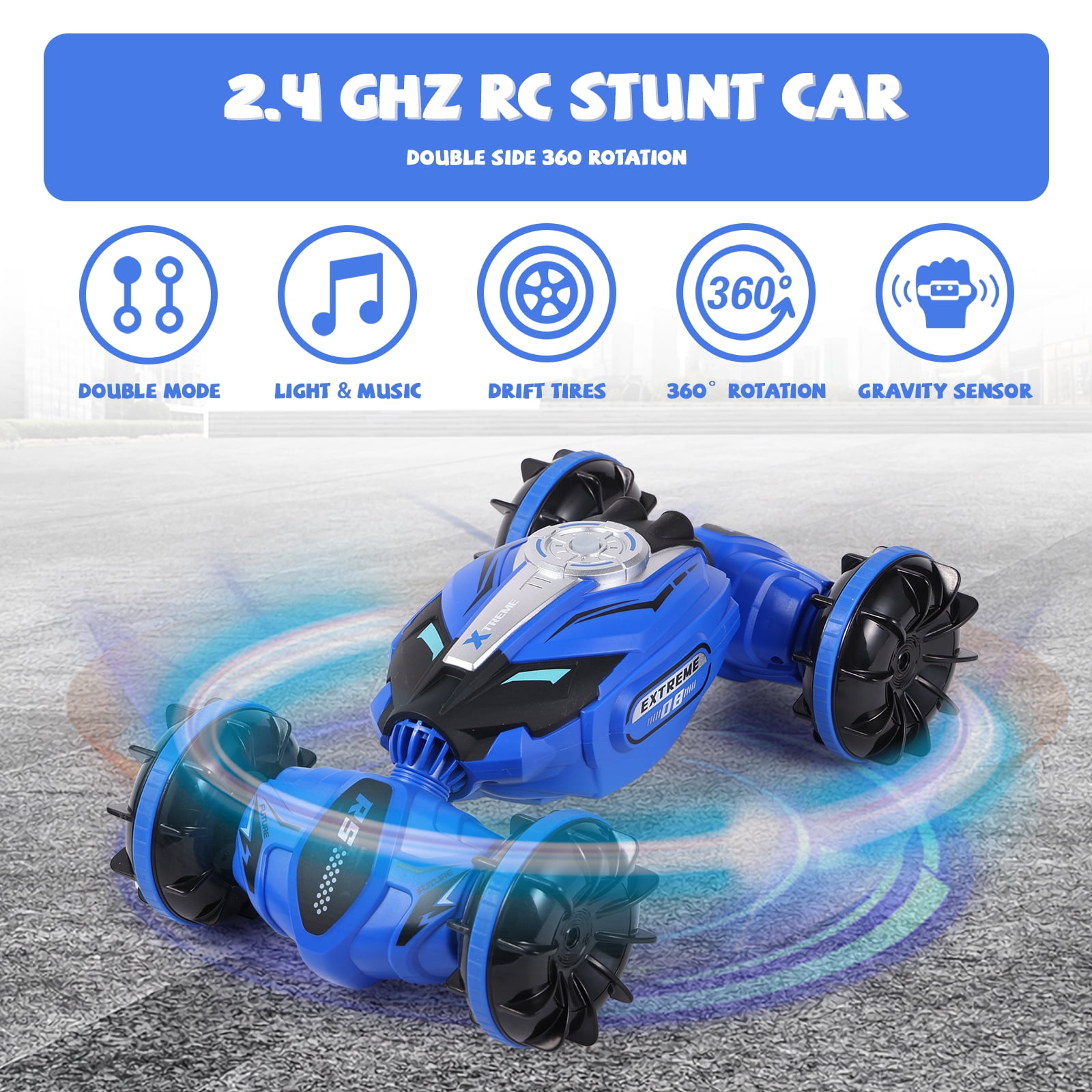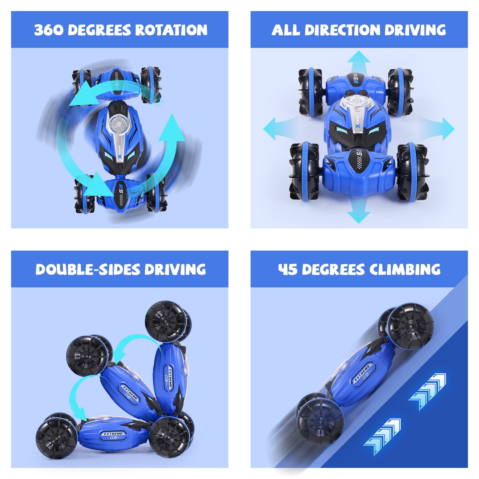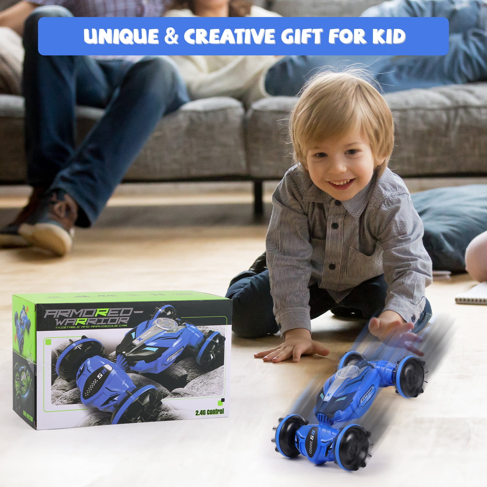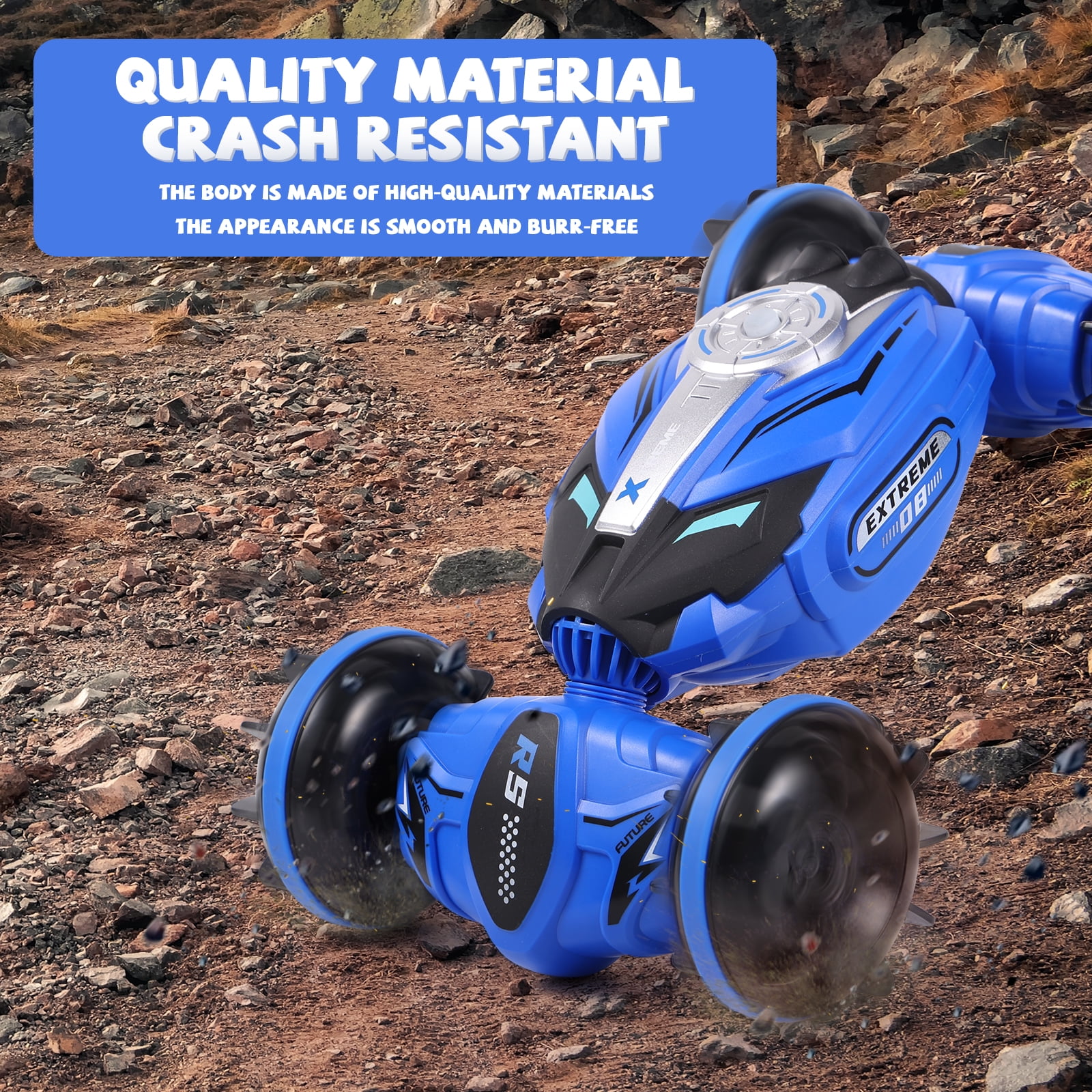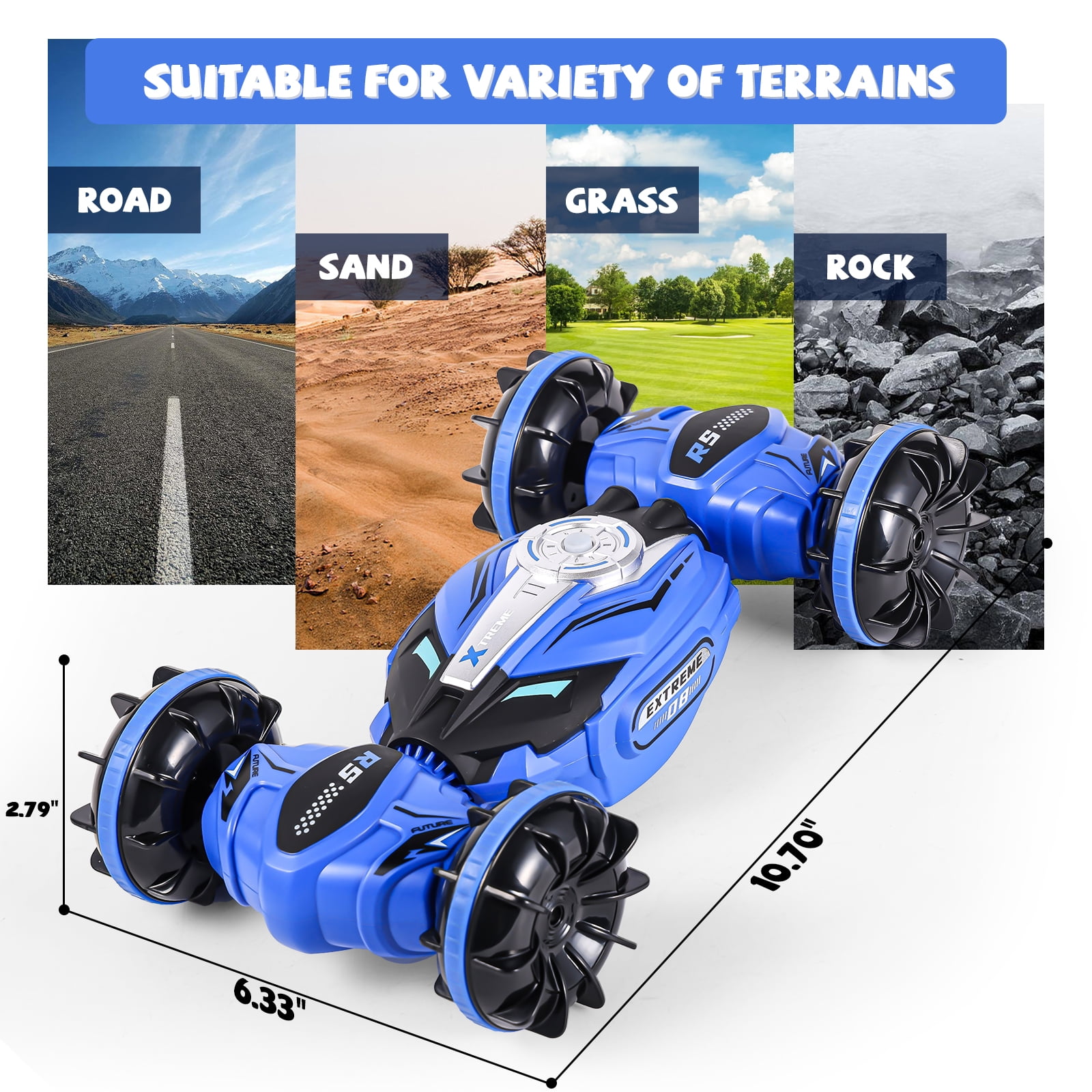 Versatile Stunts: Perform front & back flips, 360-degree spins on both water and ground. Your RC car will be the life of any racing event! Off-Road Capabilities: With its four-wheel gear system, it can do amazing 180-degree flips and 360-degree rotations. Its off-road design enables it to easily traverse land, sandy beaches, mud, grass, or sea, giving you the freedom to shuttle across all terrains like lakes, beaches, snow, and grasslands. Adjustable Speed & Rechargeable Battery: The powerful built-in engine allows it to reach a max speed of 12KM/H (7.5MPH) quickly. Comes with a rechargeable battery for the car that can be charged using the included standard USB. It offers fast charging and long-lasting use (remote control requires 2*AA batteries, not included). Durable & High-Quality Materials: Made from premium quality ABS and non-toxic PVC materials, this car is designed for durability and waterproofing. Its super shockproof body prevents damage, and the high-grade rubber tires protect against wear and vibration. Perfect Gift: This all-terrain stunt toy car makes the ideal gift for all sailing, motor, jet, and speedboat enthusiasts on any occasion ? birthdays, anniversaries, farewells, best wishes, Thanksgiving, Christmas, Hanukkah, New Year’s! Suitable for kids, teens, and adults aged 5 and up.