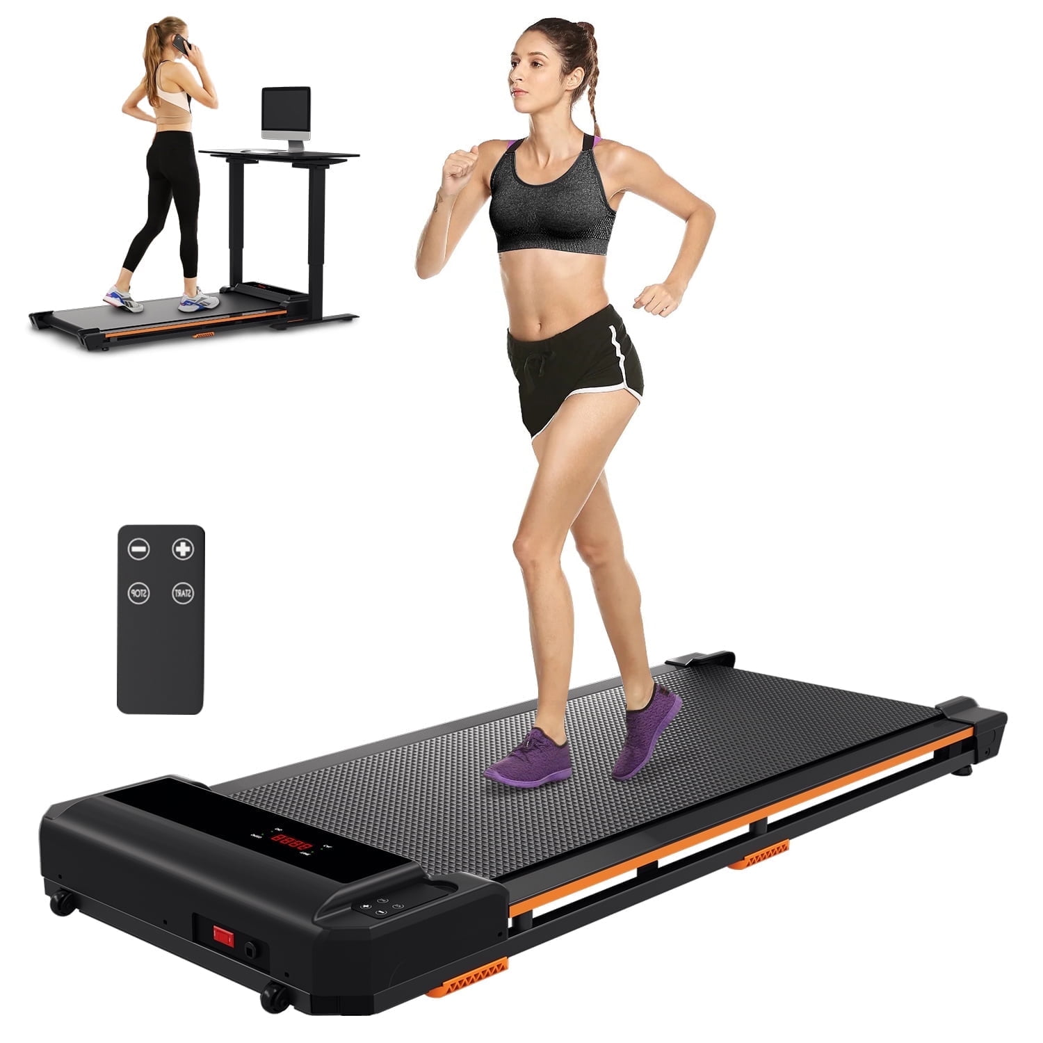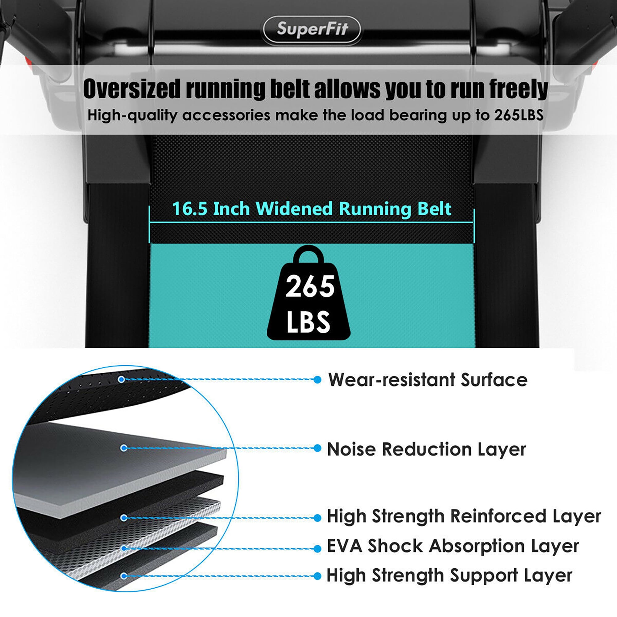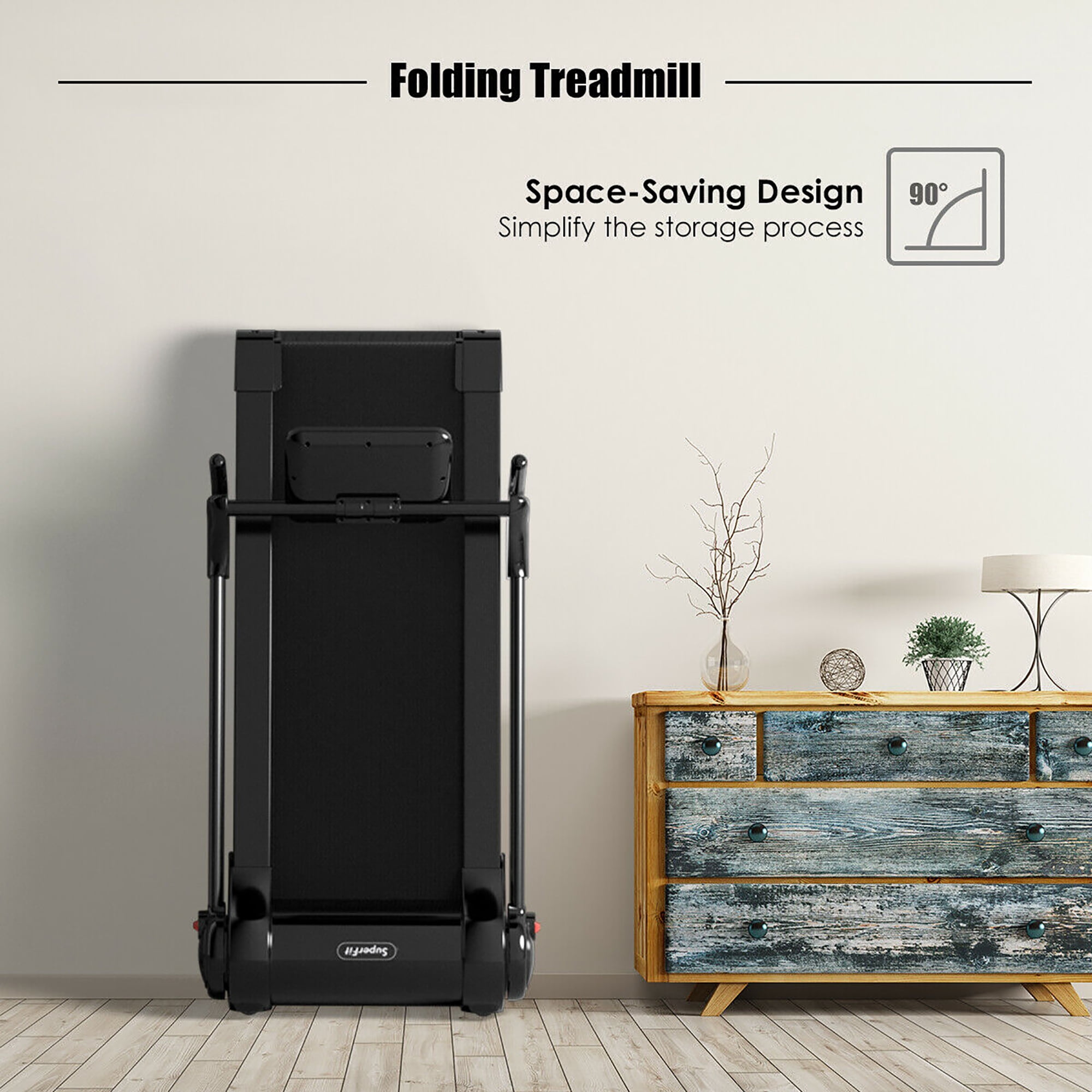 Our portable treadmill is a perfect choice for family and office workout. The powerful 2.25 HP motor provides you with comfortable exercise experience, which is very suitable for home and office use. And the speed can be adjusted from 1KM/H to 12 KM/H, allowing users to choose different exercising state. Bluetooth speakers and mobile phone holders allow you to enjoy music or favorite movies during your workout. When you finish exercising, the folding design and flexible wheels make it easy for you to store or move it from one room to another. In addition, comfortable hand grips and non-slip belt protect you from falling down. Moreover, with an easy one-touch operation, you can monitor real-time data for each exercise, including speed, time, calories, distance and step. Please do not place the treadmill on carpet during usage to avoid motor overheat Please do not place the treadmill on carpet during usage to avoid motor overheat Feature Powerful 2.25 HP quiet motor significantly enhance sports effect Speed unit could be switched between mile and km in APP Connect the treadmill to your phone through Bluetooth to enjoy music Fast set the speed to 5 KM/H or 8 KM/H 5-layer shock-absorbing running belt reduces impact during sports Built-in 4 flexible transport wheels make it easy to move and store Safety key is used for emergency braking and can avoid safety accidents Phone holder help you to enjoy movies while running Integrated installation-free design makes it easy to use 16.5” widened running belt allows you to run freely Rubber foot pads greatly reduce impact LED display screen helps to monitor speed, distance, time, step and calories in real-time Specification Color: Black Material: Metal Overall Dimension: 55.9″ x 30.5″ x 49.5″ (L x W x H) Folding Dimension: 11.8″ x 30.5″ x 55.9″ (L x W x H) Running Area: 43.5” x 16.5” Net Weight: 86lbs Speed: 1.0-12.8 km/h Control Method: Touch Button Weight Capacity: 265lbs Voltage: AC 110V 50/60Hz Power: 2.25HP Package includes: 1 x Treadmill 1 x Accessory Bag 1 x User Manual