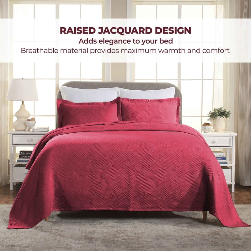 Set Includes: 1 Bedspread and 2 Pillow Shams (Twin size includes 1 Pillow Sham) Crafted from 100% Cotton Raised matelasse woven design adds a rich layer to your bed for a refined look Material is airy, breathable, and comfortable; Perfect as a decorative accent or extra layer on colder nights Matching pillow shams feature envelope closure for easy access and a neat finish Available in Burgundy, Bisque, Charcoal, Cappuccino, Ivory, Peacock Blue, Platinum, Salmon, Sweet Pea, White color options Displays a geometric fret pattern Pairs with Modern, Contemporary, Transitional, and Casual bedroom decor styles Twin Bedspread is 70″ wide x 100″ long, Pillow Sham is 20″ wide x 26″ long As we transition to new sizing for an even more comfortable fit, some orders may have slightly larger dimensions to allow for 5-8% natural fiber shrinkage after the first wash; For best care, wash in cold water and dry on low heat We’re committed to make products safer for you and safer for the world; STANDARD 100 by OEKO-TEX certified; Every component of this product has been tested and verified free of harmful substances and produced sustainably
