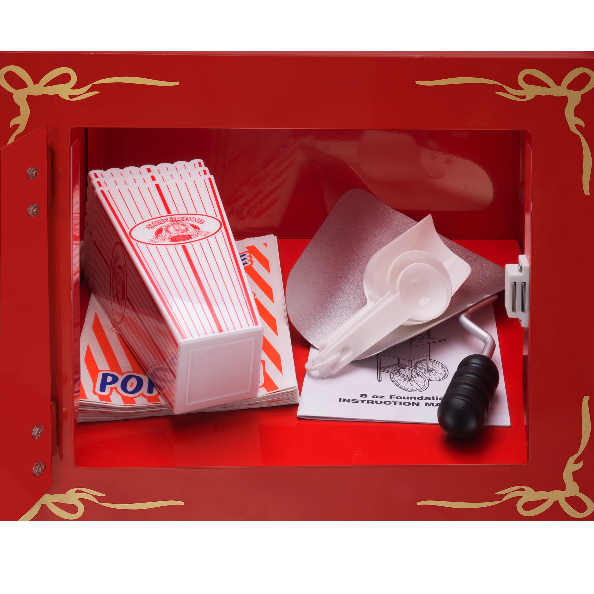 This commercial quality machine by Superior Popcorn Company features stainless-steel food-zones, easy cleaning stainless-steel kettles, heated warming decks, old-maid drawers (for un-popped kernels), tempered glass panels and an industry leading 8-ounce kettle operating on 850 watts. You won’t find a comparable unit on the internet. With the antique style design, you will be reminiscing about your early days at the ball game, carnival, or the movie theater. We have combined the best of both worlds–not only are you getting today’s technology, you get an eccentric design with all the conveniences of the modern era. OLD MAID’S DRAWER- Our machine was designed with small perforations in the bottom stainless tray to allow the un-popped kernels to fall into the drawer. Simply “rake” the popped corn with a scoop and the “old-maids” disappear.STORAGE DRAWER- We added a convenient storage cabinet to the base, to store all of your popcorn supplies. It is the perfect place to keep your popcorn bags, portion packs, and other supplies.BONUS- We include 3 plastic serving cups, 25 popcorn serving bags, measuring cups and a popcorn scoop with every popper!PRODUCT DETAILS- 850 watts. Switches include: spot light warmer, stirrer and pot heater. Materials: Heavy-duty powder coated steel and stainless-steel. Dimensions: (L)26”x (W)18”x (H)60”. Color: Red. Makes approx. 3 gallons popcorn per batch.