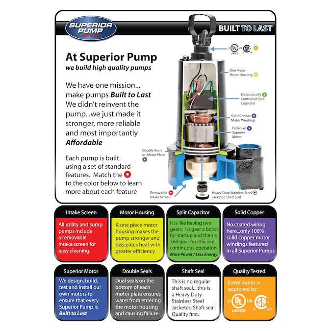 Superior Pump builds pumps that are truly built to last and are 100% factory tested. Superior Pump uses quality components including solid copper motor windings, heavy duty stainless steel jacketed shaft seals, double o-ring seals on motor plate, and electronically controlled split capacitors. Superior Pump model 91501, 1/2 HP submersible utility pump, will move water up to 4200 gallons per hour. This pump is UL/cu listed and CSA certified and backed by a 3 year warranty.