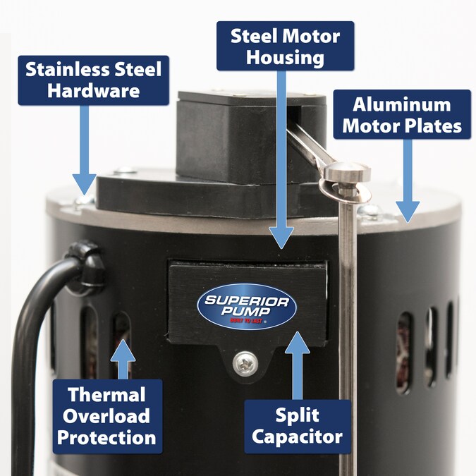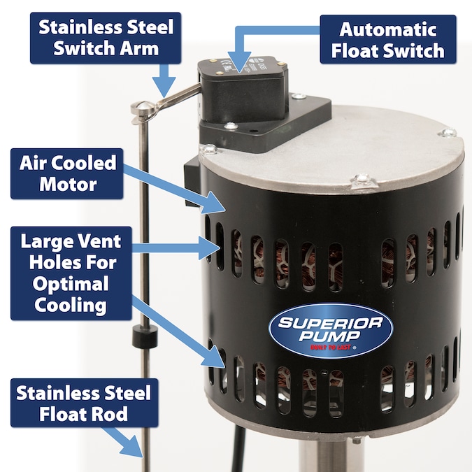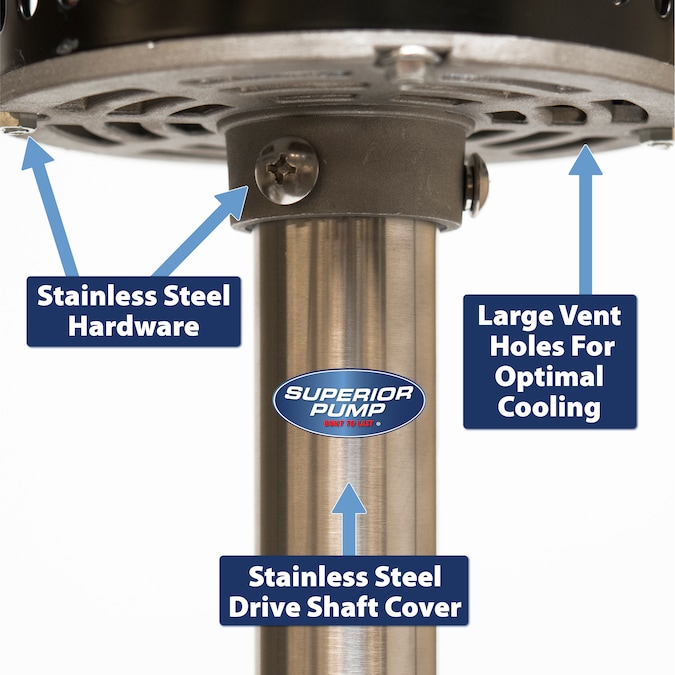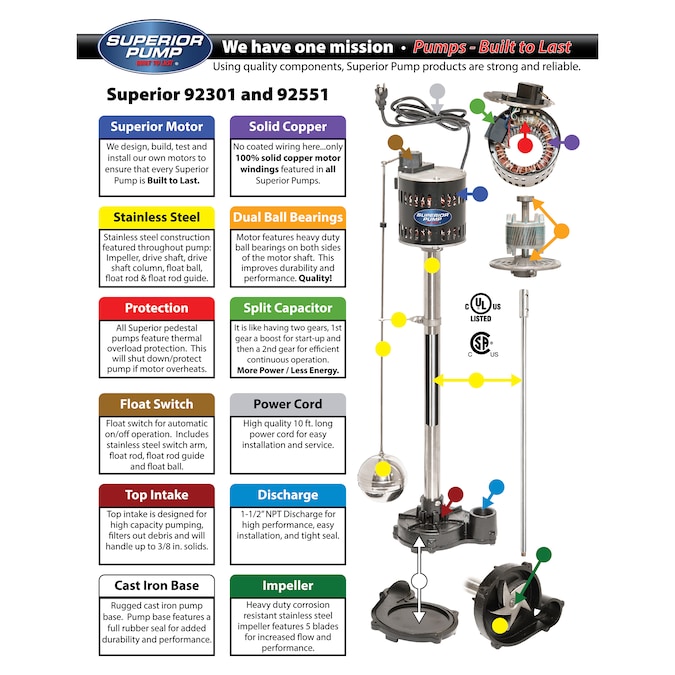 Superior Pump builds pumps that are truly built to last and are 100% factory tested. Superior Pump uses quality components including solid copper motor windings, heavy duty stainless steel jacketed shaft seals, double o-ring seals on motor plate, and electronically controlled split capacitors. Superior Pump model 92301, 1/3 HP pedestal sump pump, will move water up to 3000 gallons per hour. This model comes standard with a stainless steel impeller and drive shaft. This pump is UL/cu listed and CSA certified and backed by a 3 year warranty.