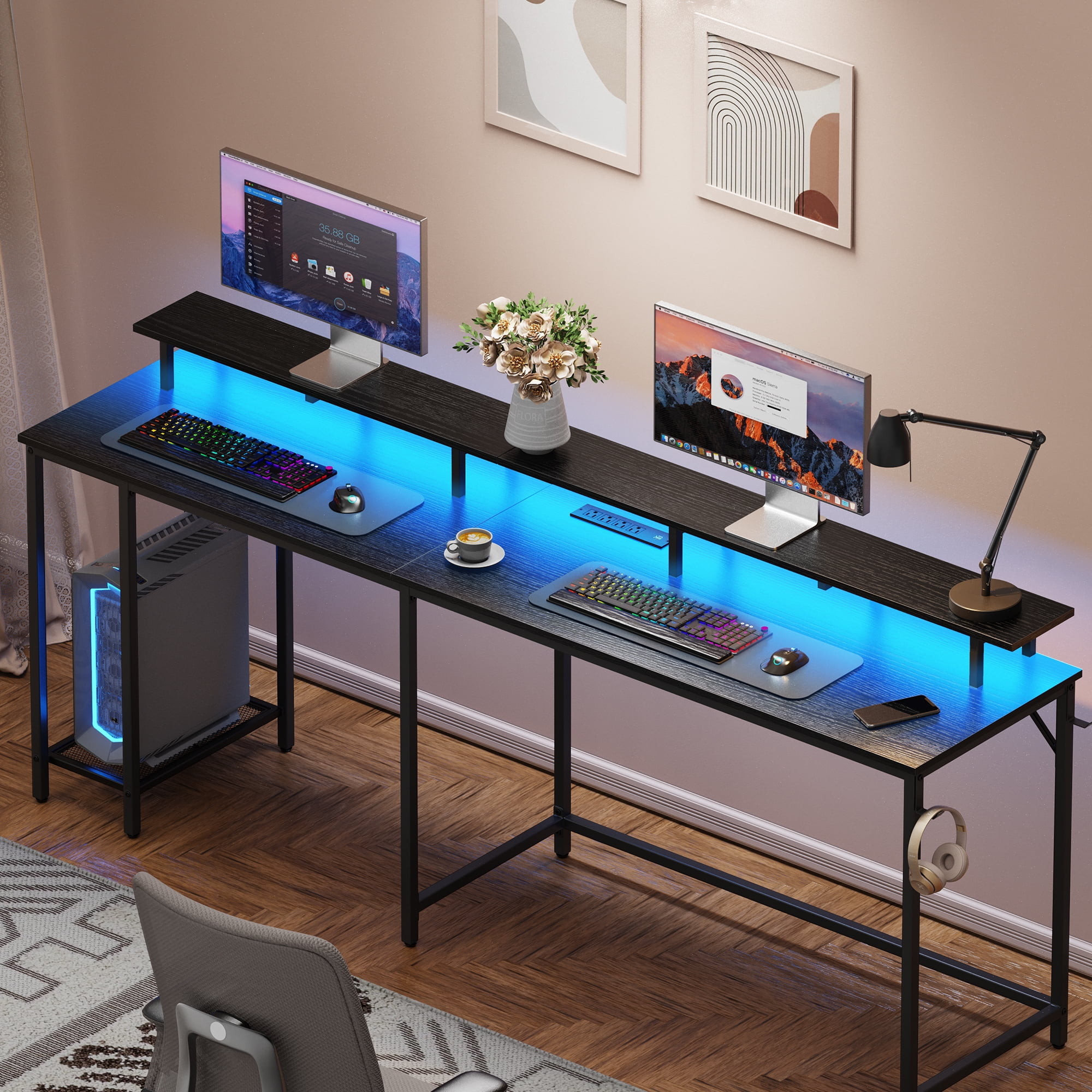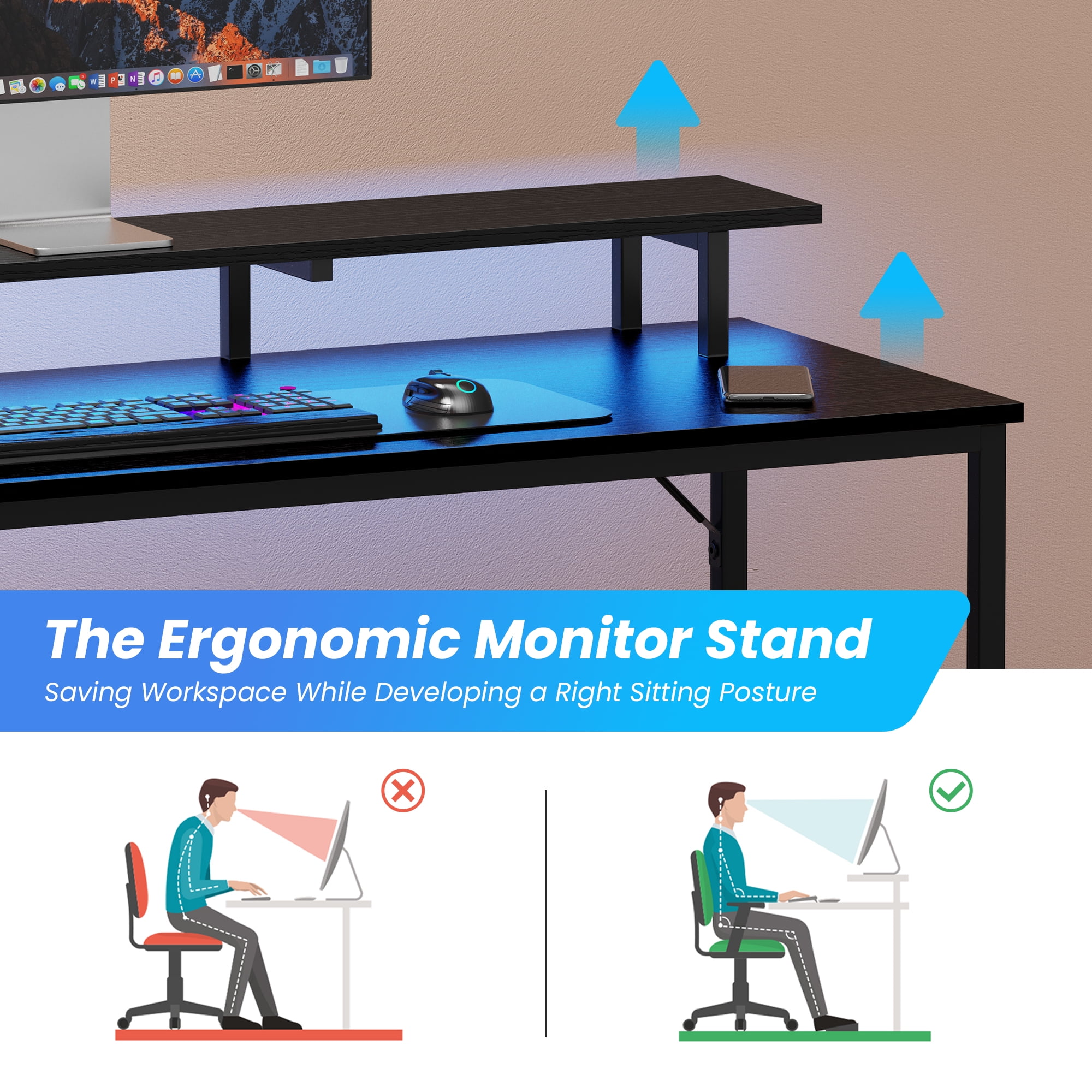L Desk with Light Strips: 22 dynamic modes, 20 changeable colours, and 5 brightness levels 4 AC Outlets & 2 USB Ports: Charge your monitors, phones and other devices easily Monitor Shelf with Storage: Elevates your eyelines for a healthy working posture while adding more storage space Long Desk or L Shaped Desk Installation: Meet your home space layouts Many Use Occasions: Use as a writing desk, study desk, or gaming desk Durability for Long-Term Use: Sturdy powder-coated steel & premium P2 Particle Board