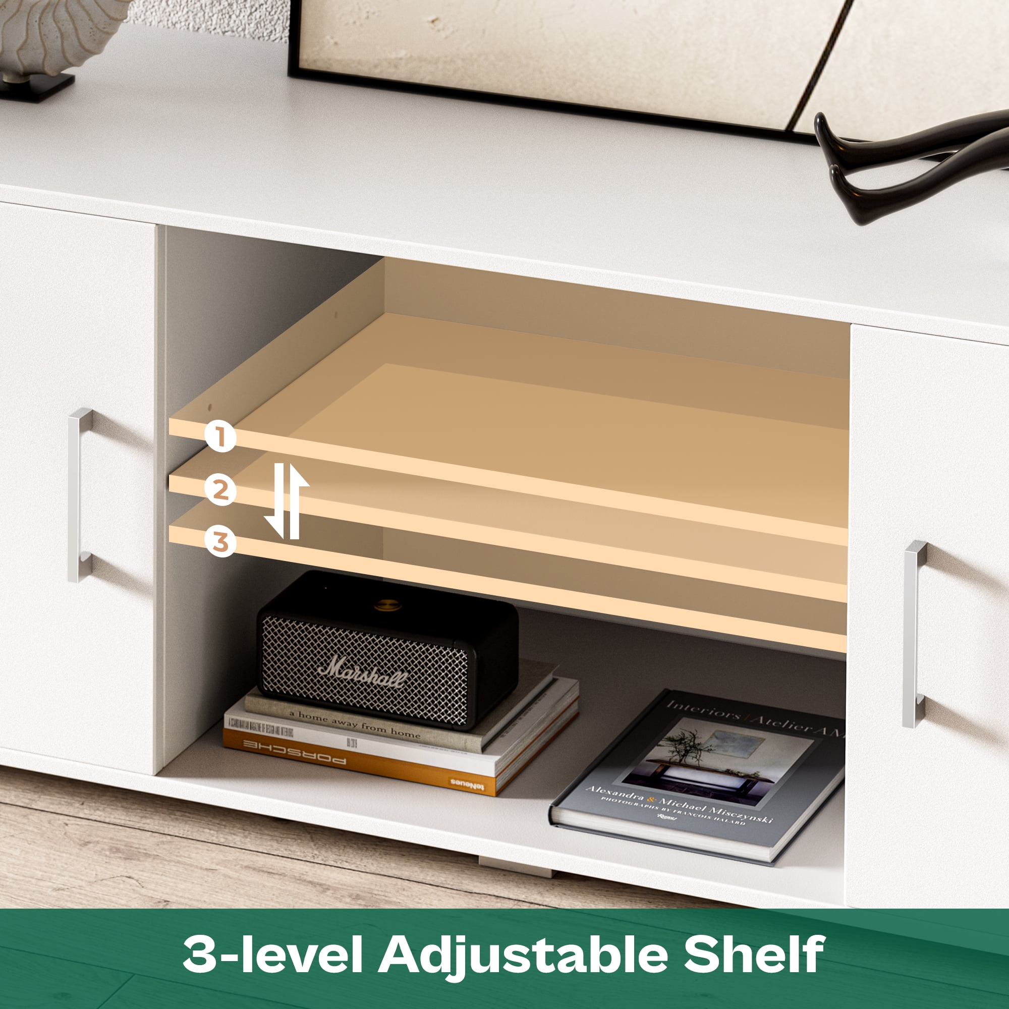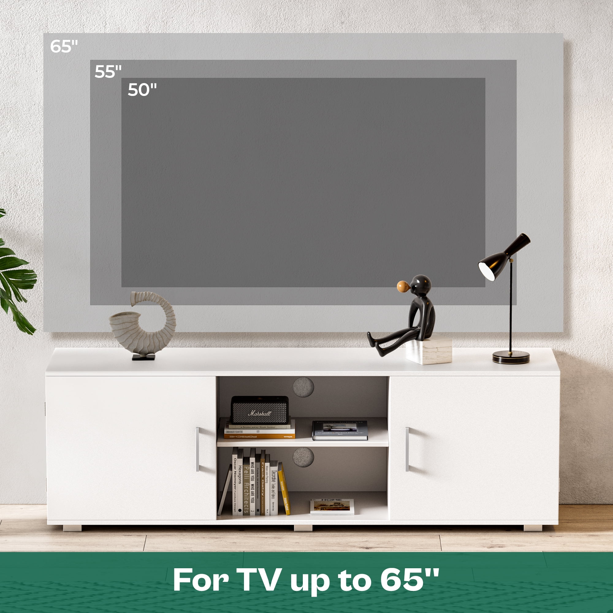 TV Stand for 65 inch TV: TV stand supports 50, 55, 65-inch TVs, with a roomy desktop for your TV companions. Ample Storage: Storage includes 2 cabinets, adjustable middle shelf, and 6 cable holes for cleaning tangled wires. Solid Structure: Durable build with premium particleboard and sturdy metal feet ensures long-lasting use. Stylish Outlook: Versatile design fits seamlessly into any space, with felt pads for floor protection. Hassle-free Setup. Easy assembly with user-friendly instructions, numbered components, and provided tools.