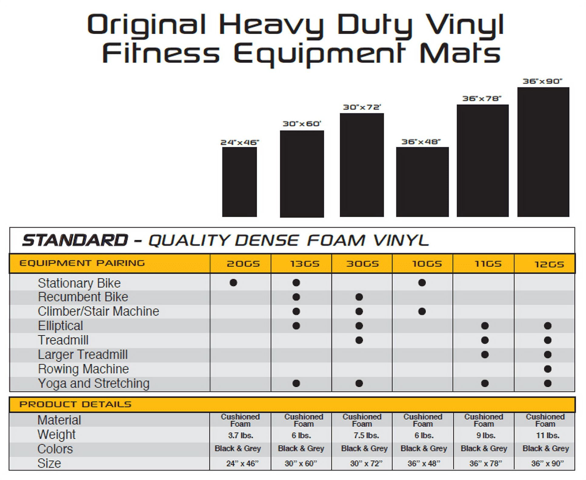 SuperMats protects your floors and carpets from the damaging effects of heavy exercise equipment and debris from mechanical parts. Prolongs the life of your equipment by helping prevent floor and carpet dust from entering belts and mechanical parts. Dampens vibrations and muffles noises so family and neighbors are not disturbed. Dimensions: 90L x 36W inches Weight: approx. 11lbs Made of a safe vinyl material that is phthalate free and contains an antimicrobial additive to help prevent mold, mildew and other allergens from forming. Model #: 12GS Cleans easily with damp cloth Non-Toxic and safe for all ages