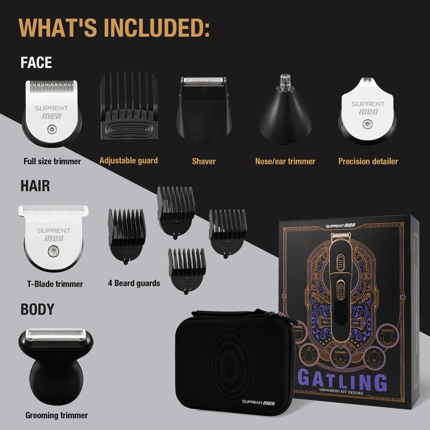 MULTIFUNCTION GROOMER: SUPRENT 16-in-1 grooming kit has everything you need, including 6 detachable trimming heads and 5 guide combs, as well as an easy-to-organize storage bag. Perfect for grooming your beard, hair, body, intimate areas, nose, and ears. Embrace the ultimate grooming experience. UNLIMITED VERSATILITY: The length of the beard trimmer blade is adjustable, 1st stop (up): 0.5-1.0mm, 2nd stop (down): 1.0-1.4mm. If you want a clean shave, replace the shaver head to achieve 0mm. The included guide combs provide lengths from 3mm to 12mm. Whether you have a clean face, stubble or long beard, bald or long hair, your look is defined by you. PROFESSIONALLY TAMED HAIR: The hair trimmer kit is equipped with a 7000+ RPM motor for high power but low vibration to tame hair with ease. Lifetime high-precision carbon steel blades for fast, precise trimming and durable performance that won’t attract or irritate the skin. LONG STANDBY TIME: This USB electric beard trimmer for men offers up to 1.5 hours of range on a 90-minute charge. Equipped with an LED display, information on remaining power and charging status is readily available. You don’t need to worry about sudden power outages and awkward work interruptions. WHOLEBODY WATERPROOF: Our beard trimmer set is IPX7 waterproof, wet and dry use, and you can even submerge it in water to rinse it off for no more than 30 minutes. The cutting head can be removed for complete cleaning, and the brush and oil will help you perform regular deep maintenance.