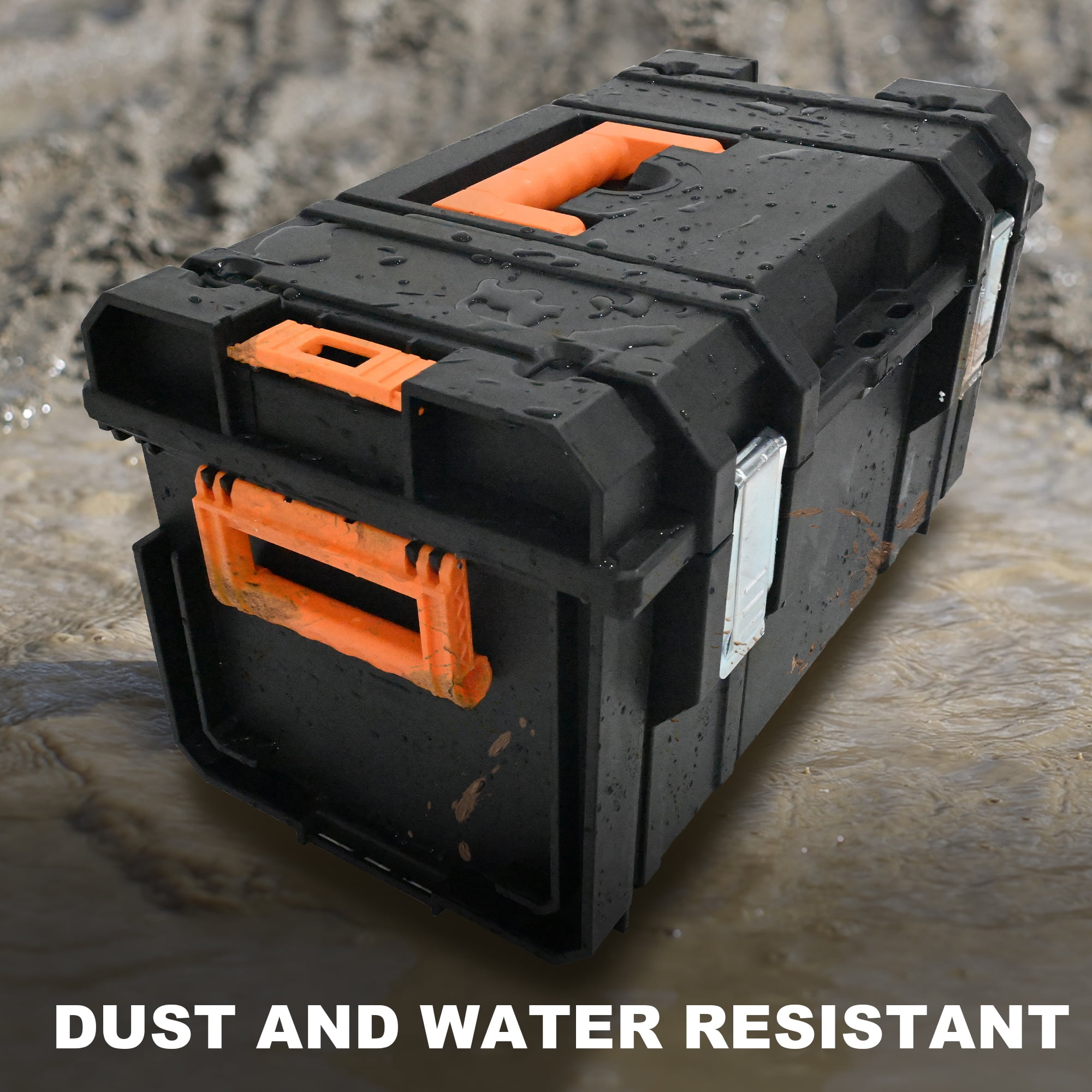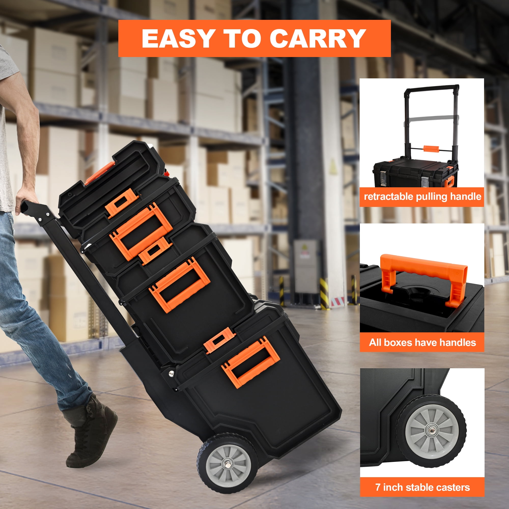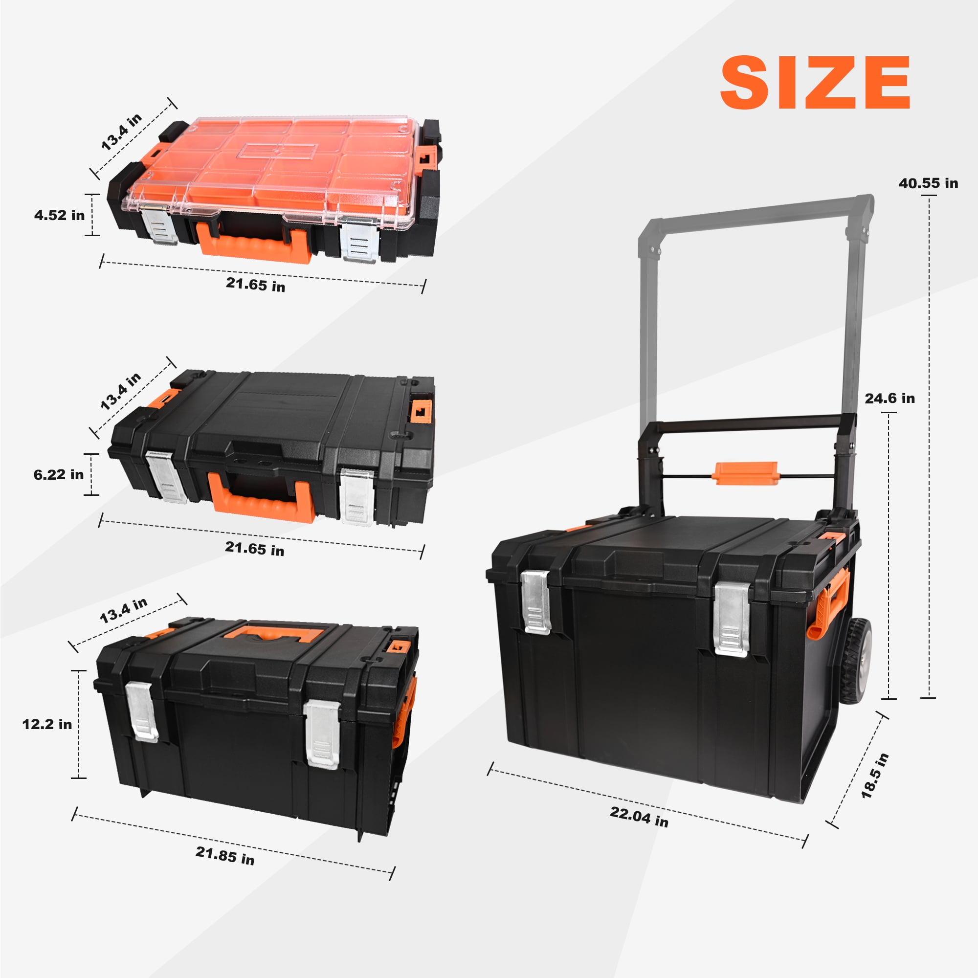 【Quick Connect Buckle, Easy Stacking】The stackable design ensures that your tools remain secure and organized, allowing you to easily grab the unit you need while leaving the others untouched. 【Meet More Storage Needs】The extra-large deep rolling tote is designed for storing power tools and bulkier items. The medium-sized tool box is perfect for hand tools, while the smaller tool boxes offer additional storage options for small accessories.Organizers to help you easily find the items you need! 【Easy to Carry】With two 7-inch rubber coated wheels and an ergonomic telescoping handle, transporting your tools has never been easier. 【Safety is Top Priority】Our toolbox features metal stainless steel double locks, ensuring that your tools are securely stored. With its waterproof design (IP65 waterproof grade), you can rest assured that your tools will remain protected even in adverse weather conditions. 【Built to Last】Not only is our toolbox practical, but it is also built to last. Each tool box’s load-bearing capacity is specified, guaranteeing their durability and reliability.