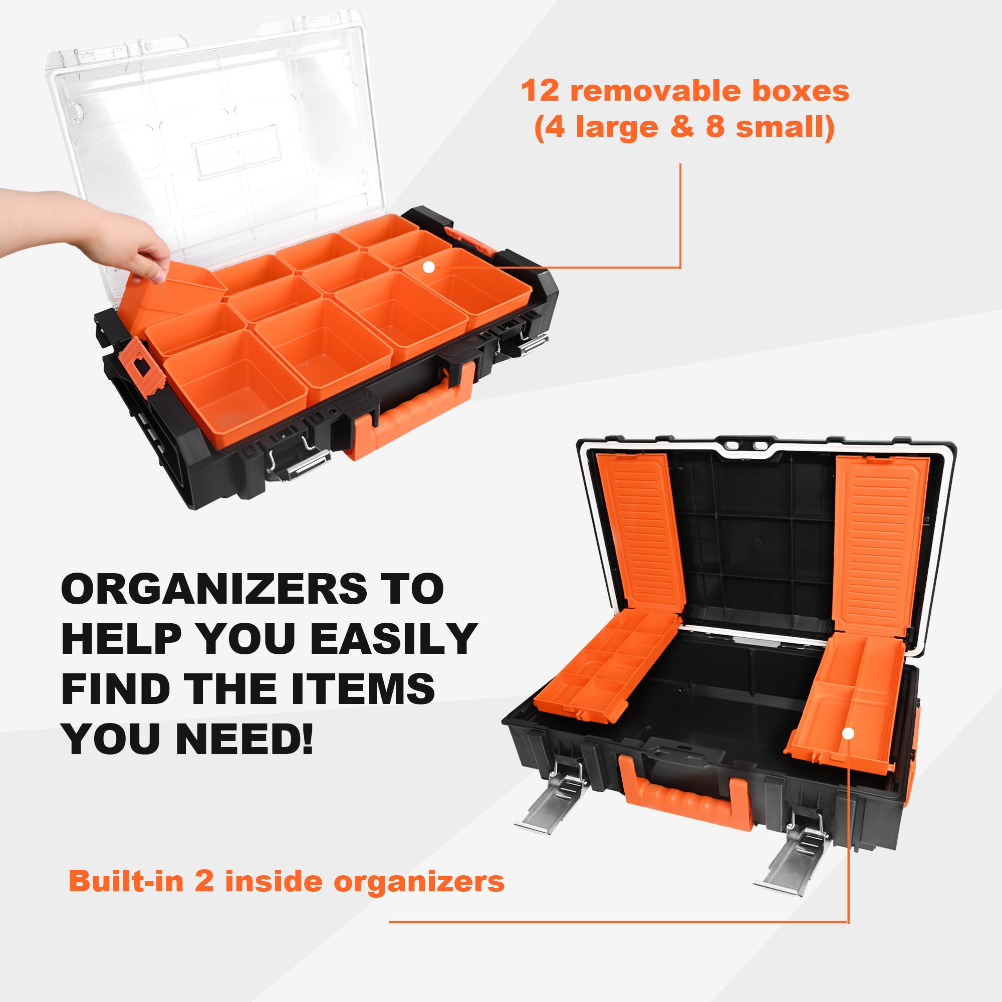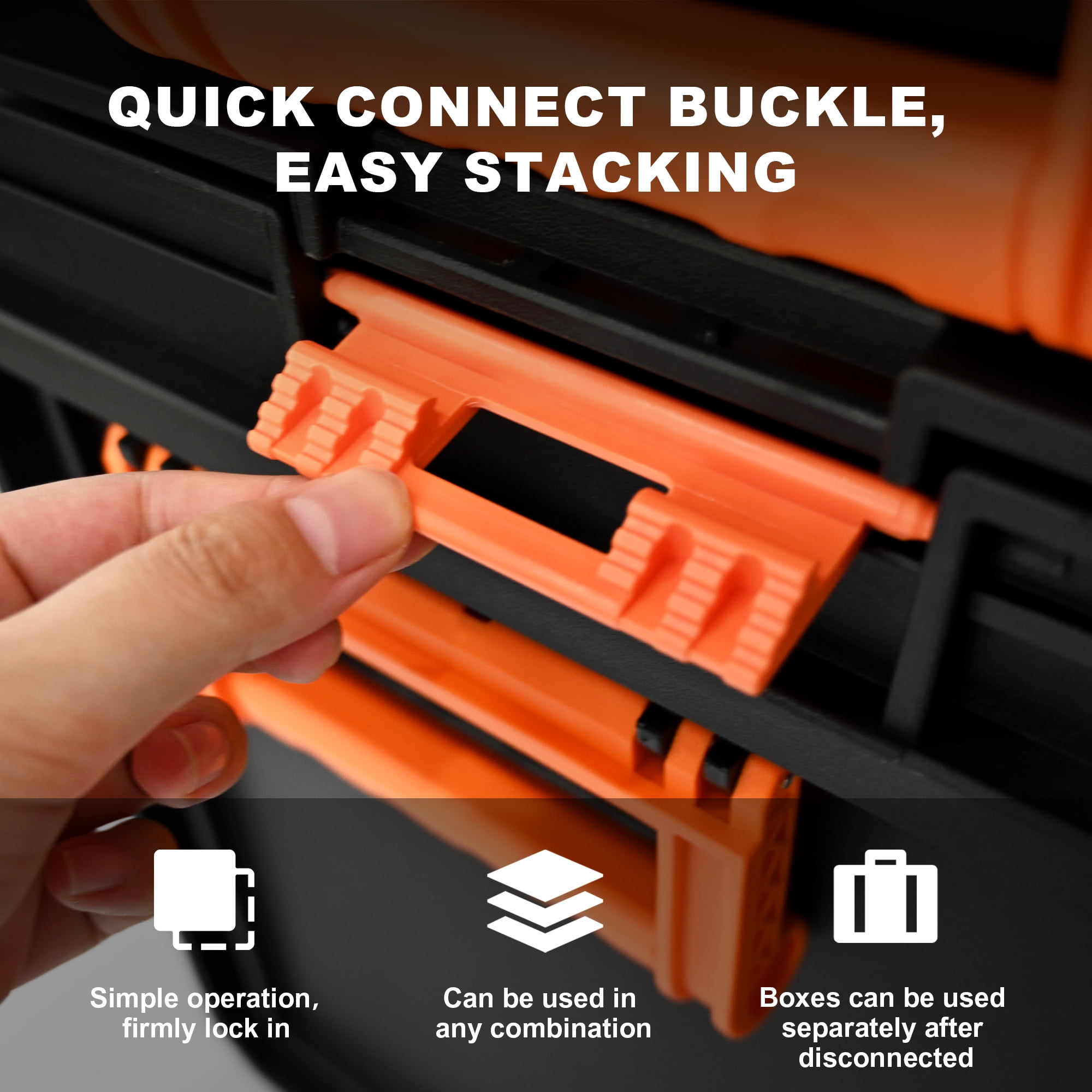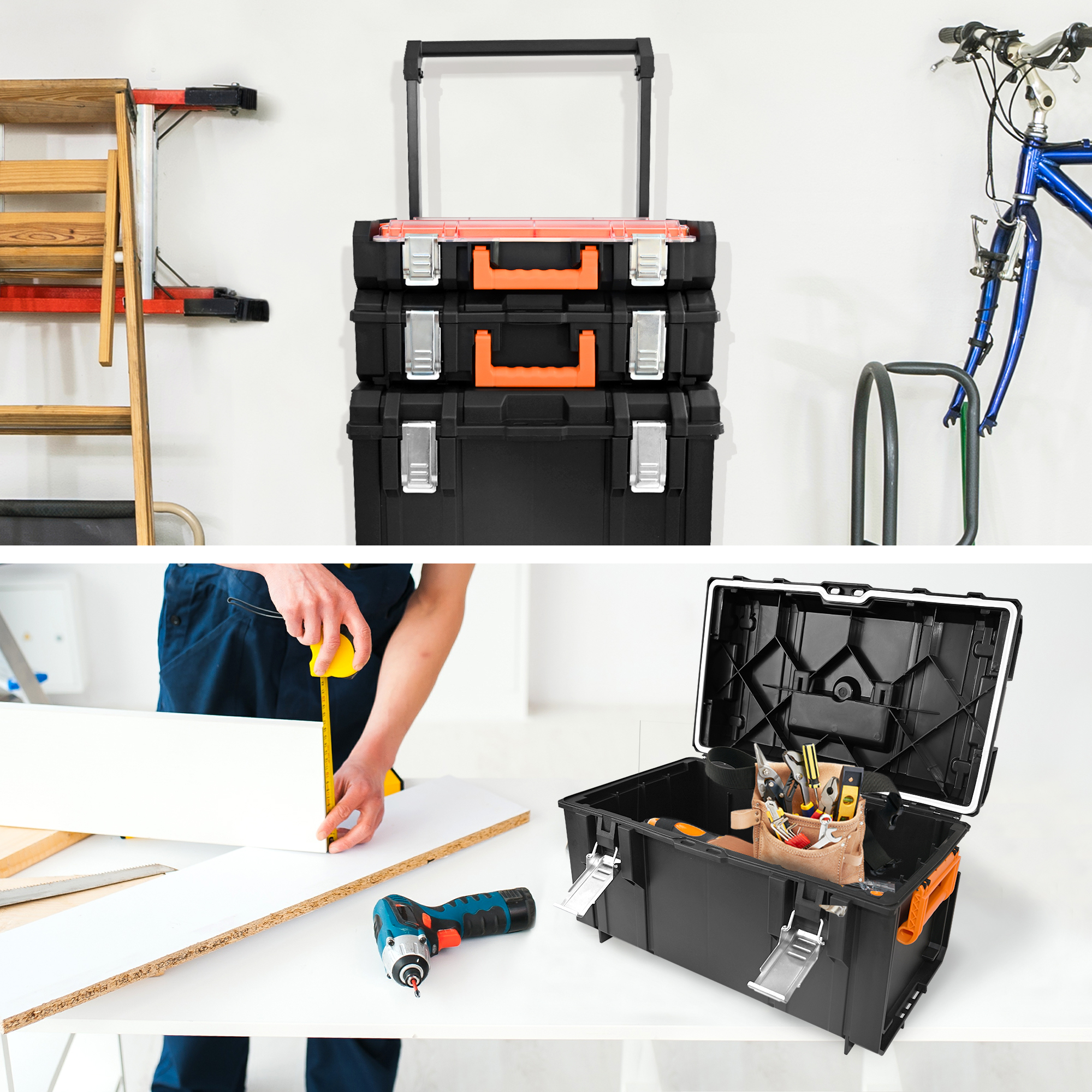 【Quick Connect Buckle, Easy Stacking】The stackable design ensures that your tools remain secure and organized, allowing you to easily grab the unit you need while leaving the others untouched. 【Meet More Storage Needs】The extra-large deep rolling tote is designed for storing power tools and bulkier items. The medium-sized tool box is perfect for hand tools, while the smaller tool boxes offer additional storage options for small accessories.Organizers to help you easily find the items you need! 【Easy to Carry】With two 7-inch rubber coated wheels and an ergonomic telescoping handle, transporting your tools has never been easier. 【Safety is Top Priority】Our toolbox features metal stainless steel double locks, ensuring that your tools are securely stored. With its waterproof design (IP65 waterproof grade), you can rest assured that your tools will remain protected even in adverse weather conditions. 【Built to Last】Not only is our toolbox practical, but it is also built to last. Each tool box’s load-bearing capacity is specified, guaranteeing their durability and reliability.