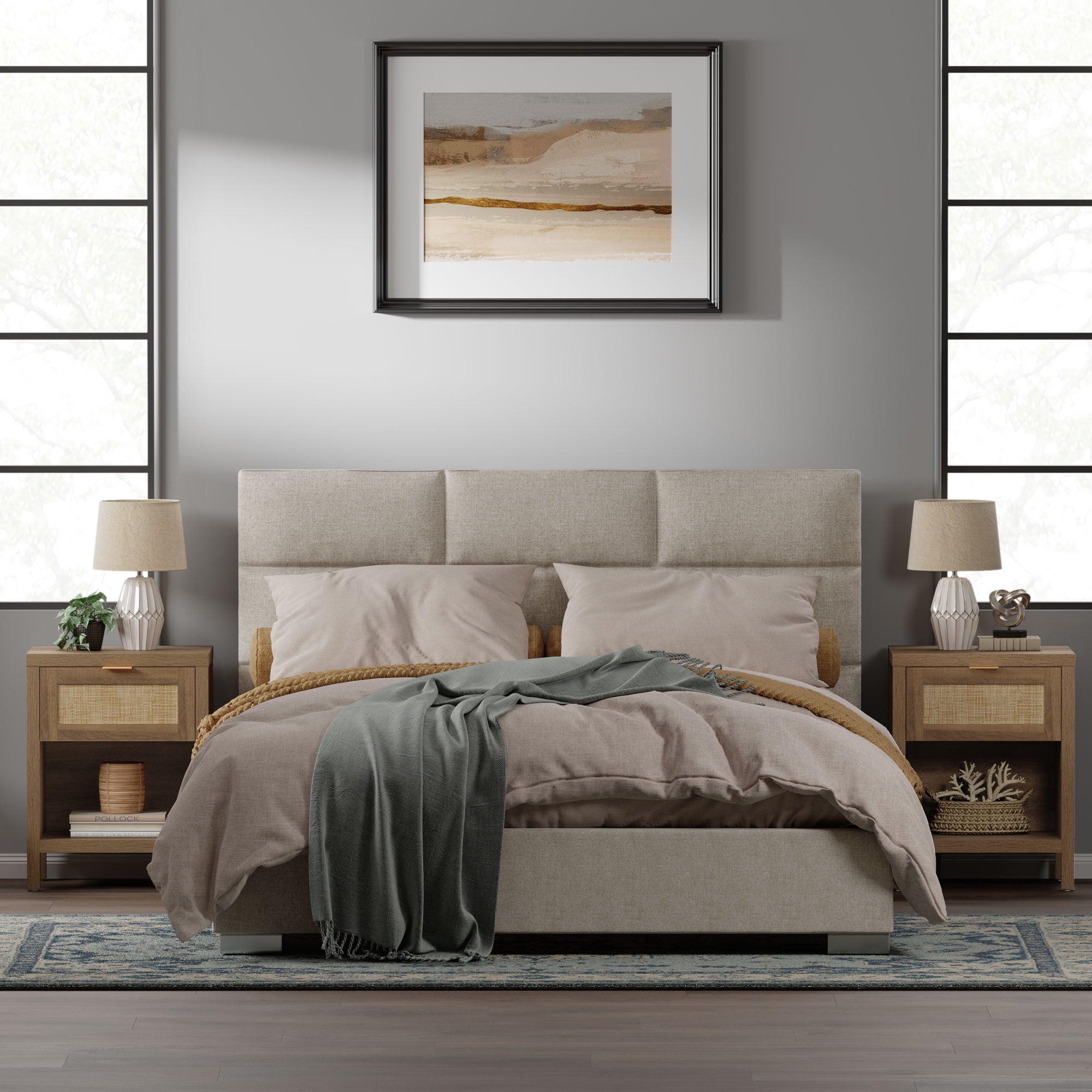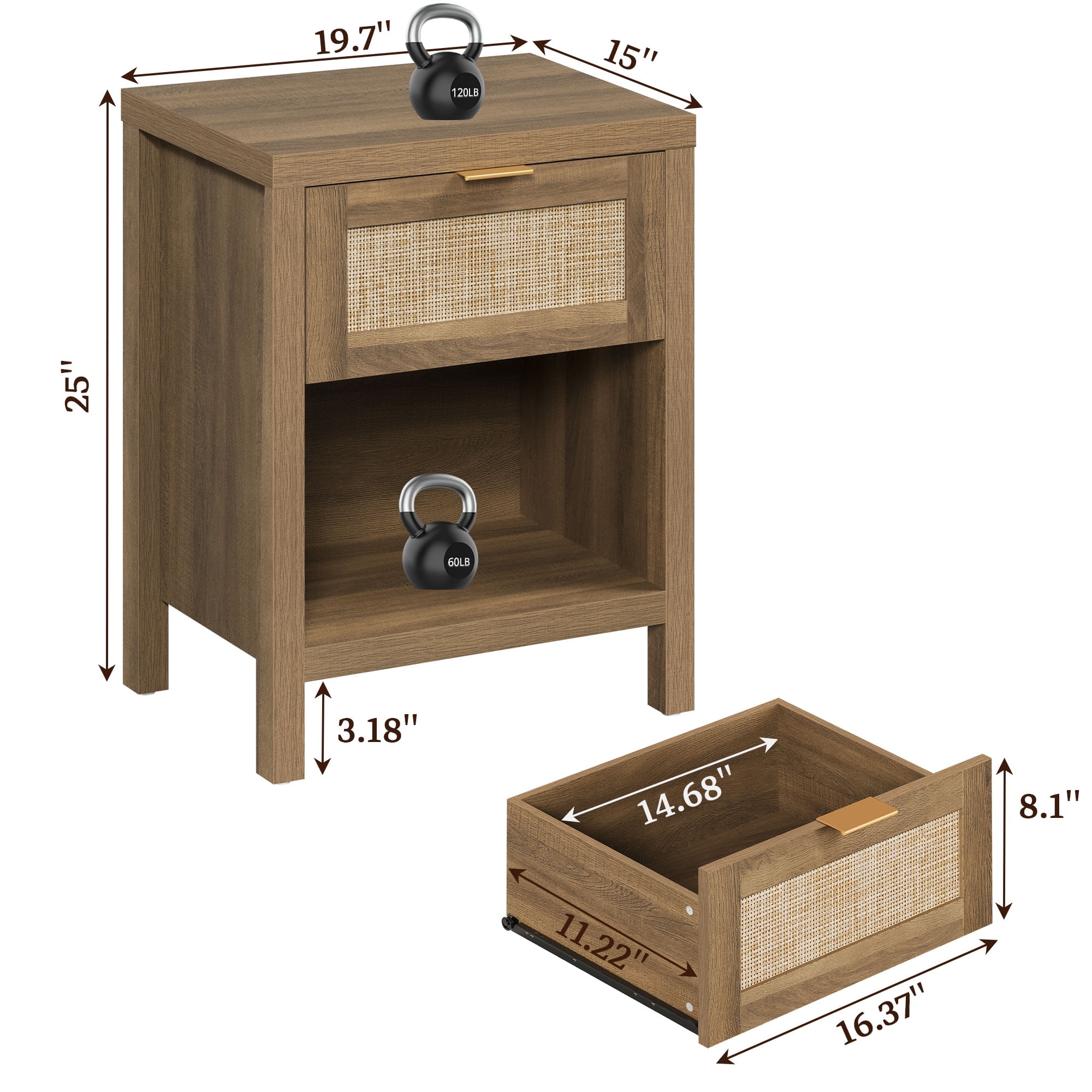 Description: Introducing our farmhouse nightstand, specifically designed for modern homes. This plastic rattan night stand features a single drawer and a storage shelf, while the thickened wood board adds a touch of rustic style and enhances stability. The combination of the drawer and open shelf ensures convenient and secure storage, allowing for easy access to items while keeping them safe from children and pets. This versatile bedside table is not only perfect as a bedside table in bedrooms but also serves as an ideal end table in living rooms. Specifications: Materials: Engineered Wood; Rattan;Metal Color: Natural Wood; Item Weight:58.3 Dimension: 19.7 x 15 x 25.2in / 50 x 38 x 64cm (LxWxH) Item Weight:56lb Package Contents: 2 x Modern Night Stand 2 x Accessory Kit 2 x Instruction Manual All parts, screws, manuals were included, easy to put together. Rattan patterns cultivated from plastic, not real rattan, so there is no worry about insects and molds. Table legs are equipped with soft pads to protect your wood floor and carpet.