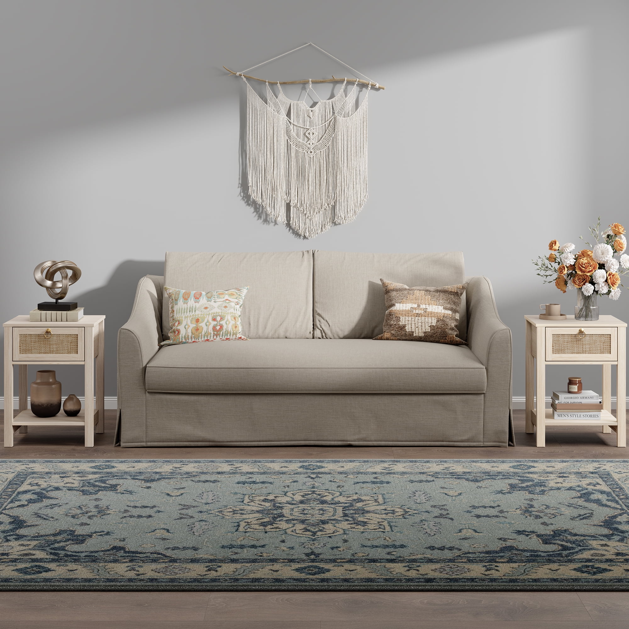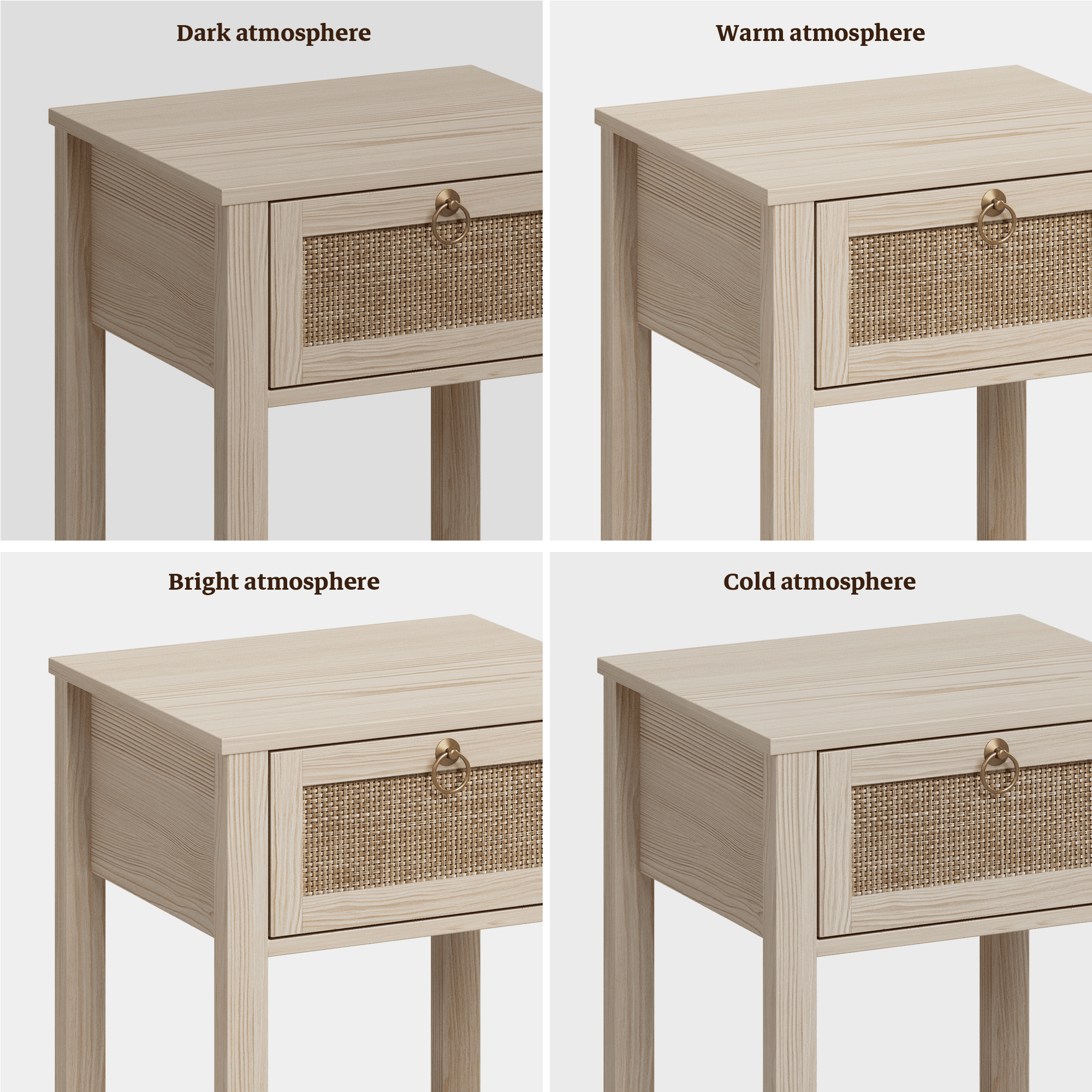 [Combination of Bohemian and Modern Nightstand Sets]This nightstand set of 2 is a perfect combination of bohemian style and elegant aesthetics, the whole is made of light white oak frame, its elegant rattan net finish and golden pull ring form the drawer, forming a unique appearance of the nightstand,suitable for various styles of home decoration, deliver perfect visual effect, add charming to your home. [Multifunctional Beside Table]The end table with rattan drawer is not only suitable for use as a nightstand and bedside table in the bedroom, but also as a sofa side table and accent side table in the living room. Perfect for large and small spaces, wide applications can meet your different needs. [Mutifunctional End Table]Wood Night Stand with AThe night stand features a storage drawer and an open shelf, providing ample space for storing books, magazines, remote controls, or other essentials you need to keep close at hand. The rattan weave adds texture and depth to the design while maintaining a natural and organic feel. The bedside table is sturdy, durable, and built to last. The wooden frame provides stability and support, while the rattan accents add character and charm. The natural finish complements any interior style and adds warmth to the overall look of the piece. [Easy to Assemble Side Table]Our living room table comes with clear instructions showing illustrations and labeling all spare parts. All kinds of screws are labeled and packaged individually, and all parts are also labeled, so as to provide customers with a better user experience.