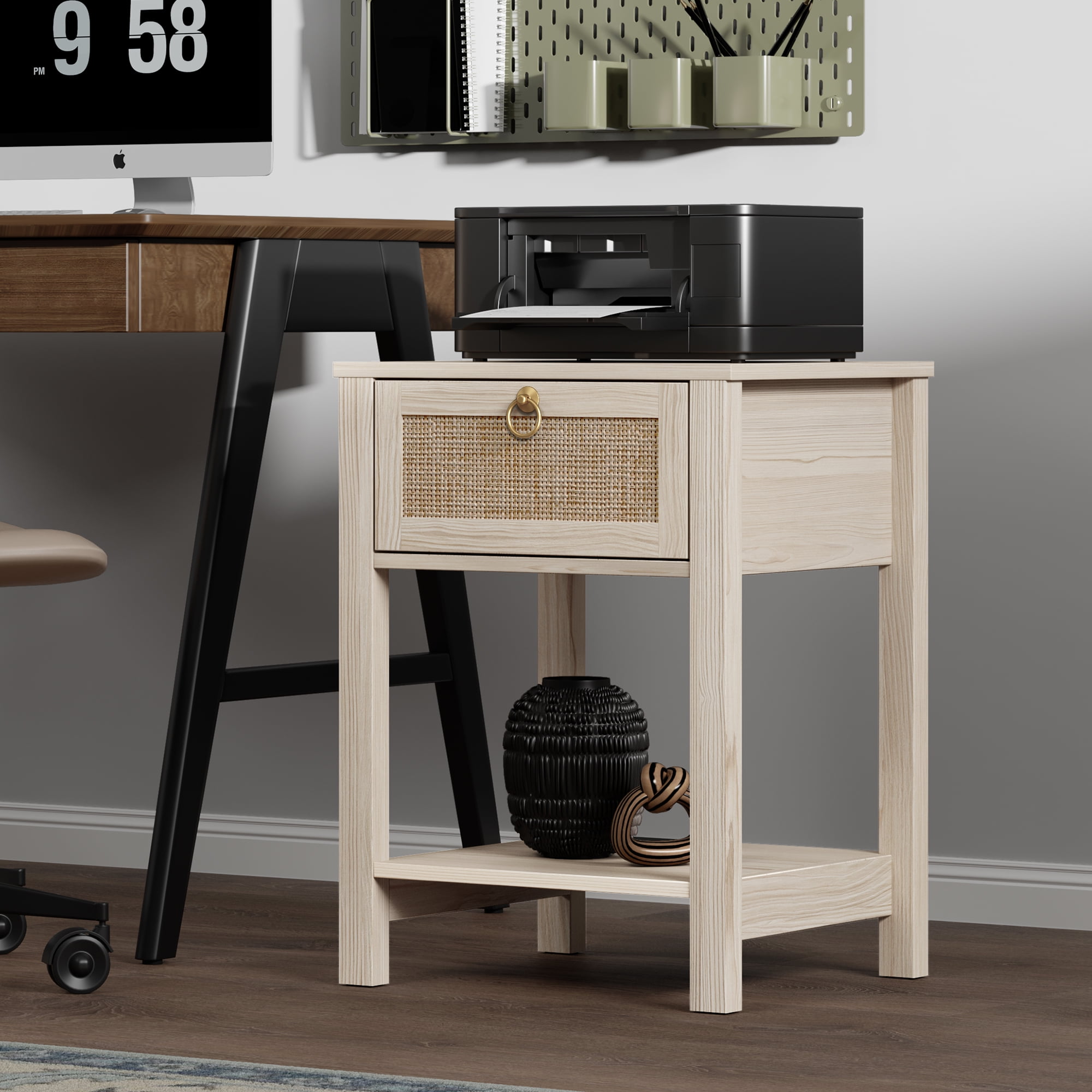 Specification: Color: White Material: MDF & Engineered Wood Size: 17.7” L x 15.2” W x 23.6” H Weight: 48.4lb/22kg Walnut Tabletop Its smooth and walnut surface, the side table is easy to clean and won’t be fade. Rattan Drawer The rattan drawer with handmade weaving technology, delivering elegant apparent effective add snugging to your home and offer large storage space. Bottom shelf The lower shelf offers more space to hold essential items, such as books, plants. Golden Pull Ring Drawer Handle With its own drawer handle, the drawer is easy to pull.