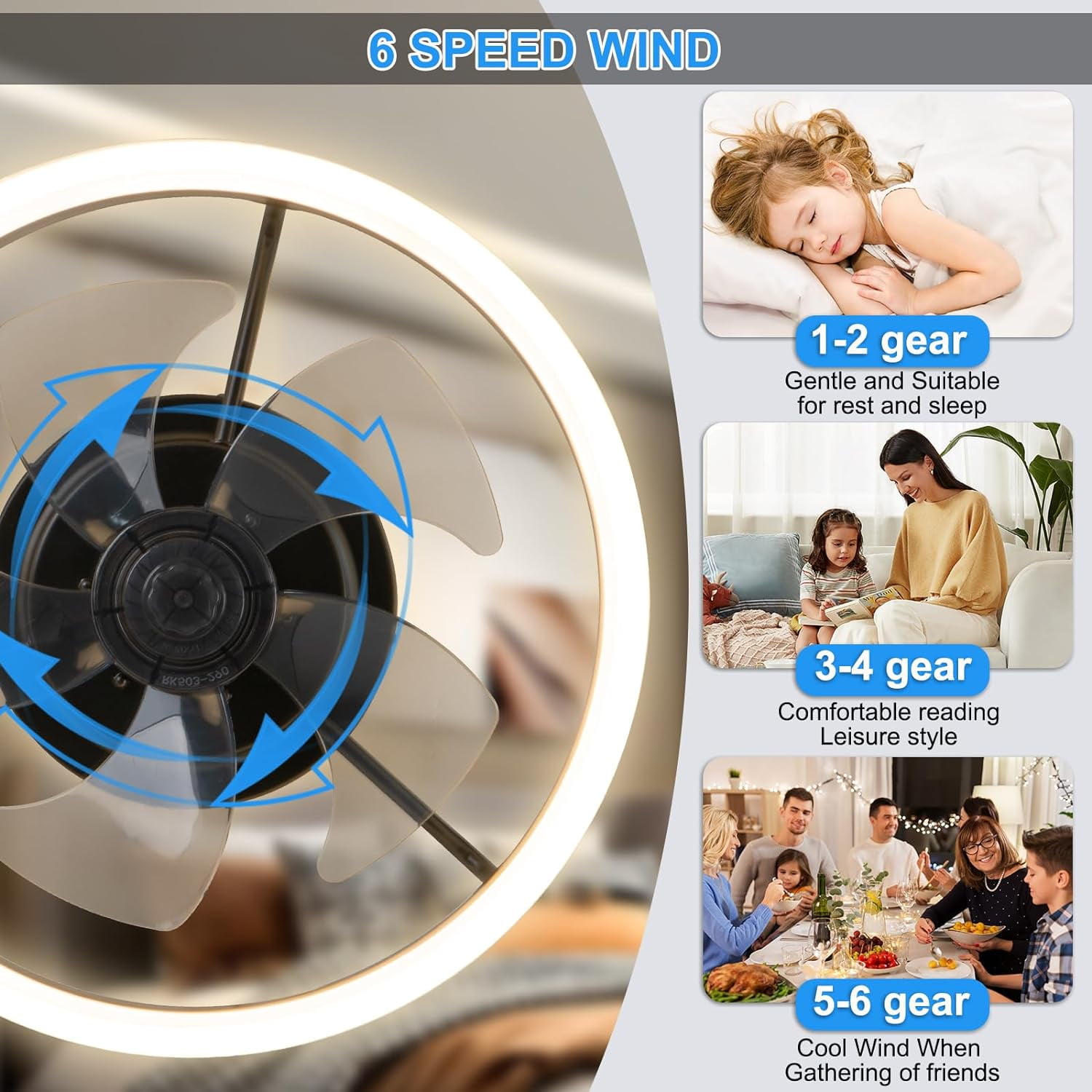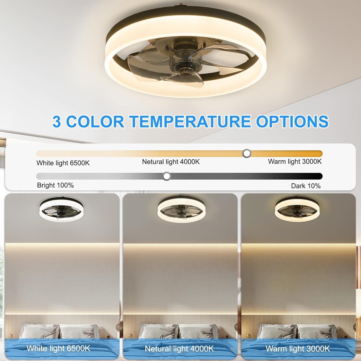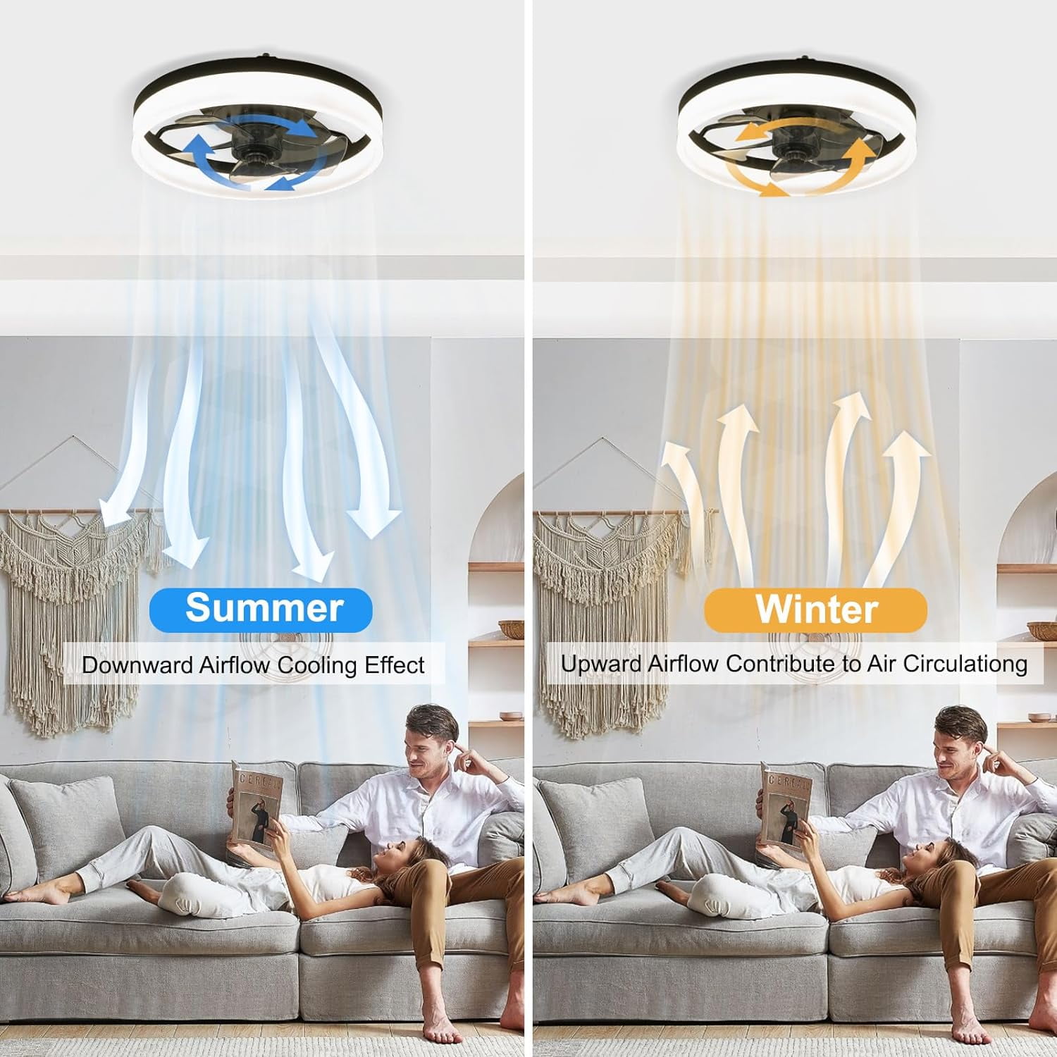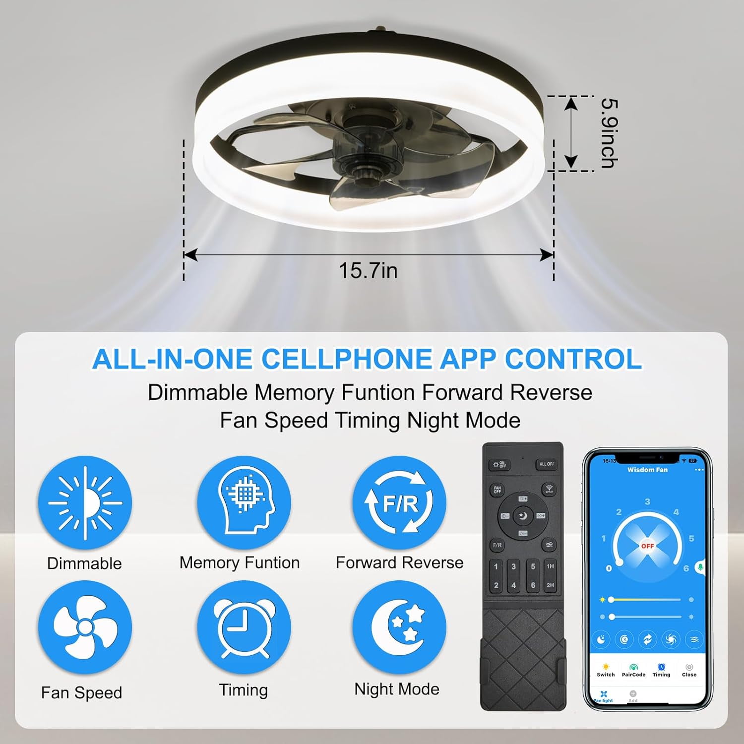 Surnie 15.7” Black Finish Modern Style Dimmable LED Flush Mount Indoor Bladeless Ceiling Fan Smart & Dimmable Light: Adjust the brightness and customize the color temperature using the remote or APP, providing versatile options for any ambiance 6 Wind Speed & Quiet Fan: Choose from six different speed options for ideal airflow intensity, operating with minimal noise for a peaceful environment High Brightness: Conveniently control the lighting with the remote or APP, suitable for bedrooms, living rooms, and dining rooms Two Rotation Modes: Forward rotation for cooling in summer and reverse rotation for increased air circulation in winter, easily set by the remote Easy Quick Installation: Most parts are pre assembled for straightforward installation; simply connect the wires and mount to the ceiling Refer to the user manual for assistance if needed