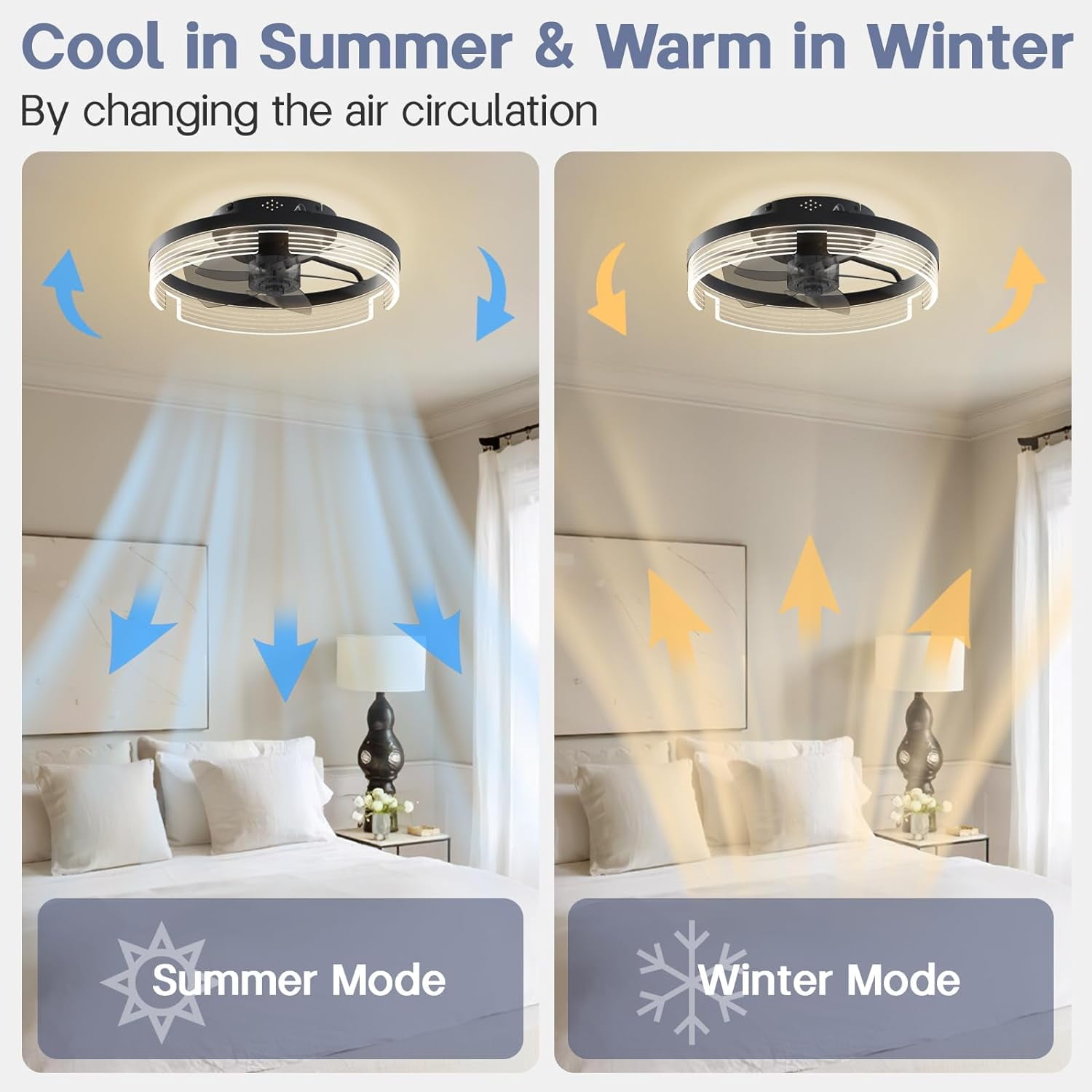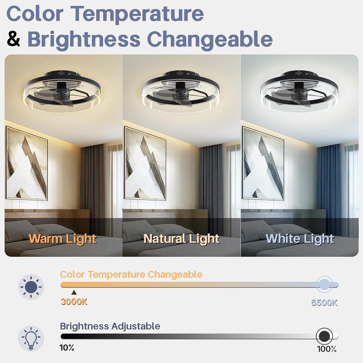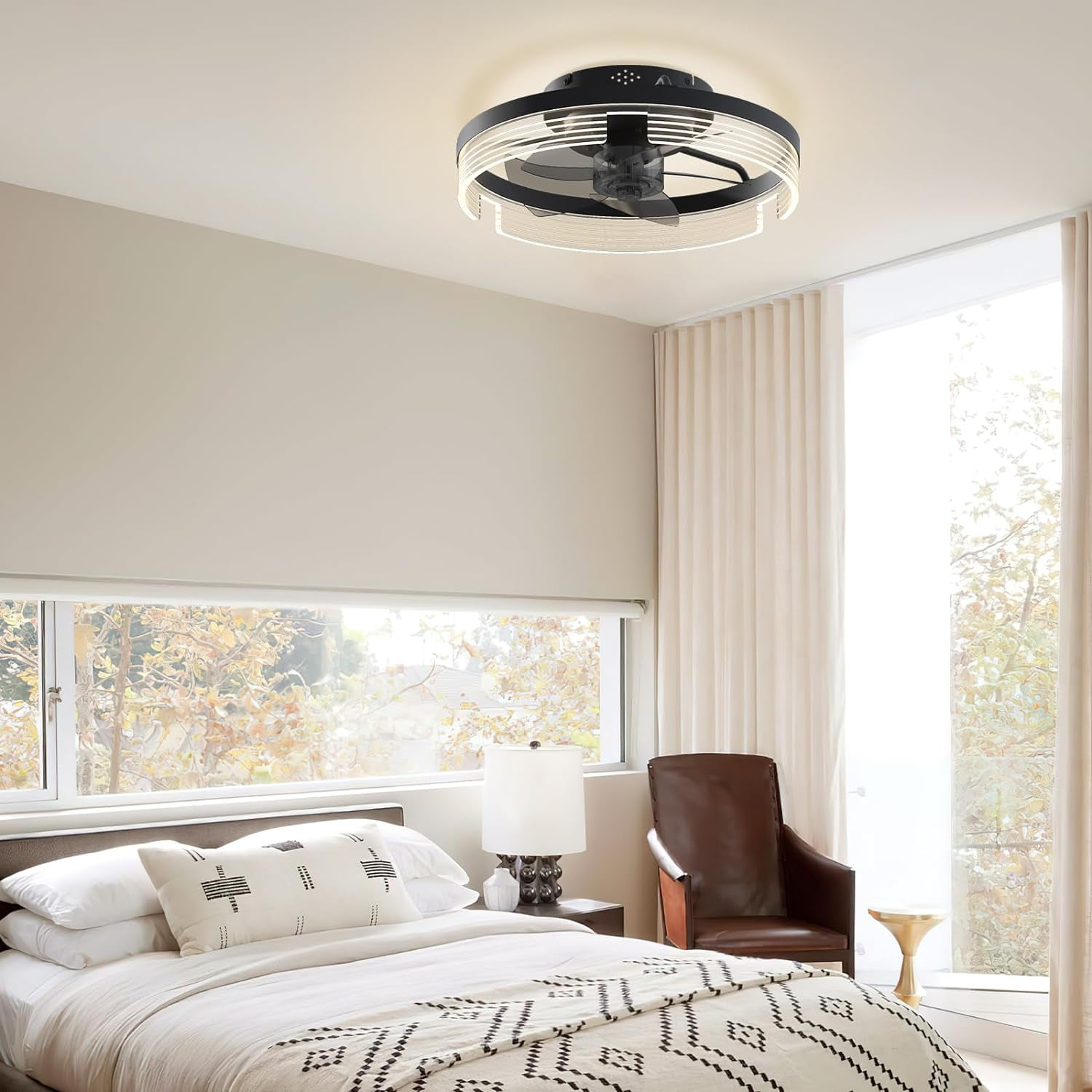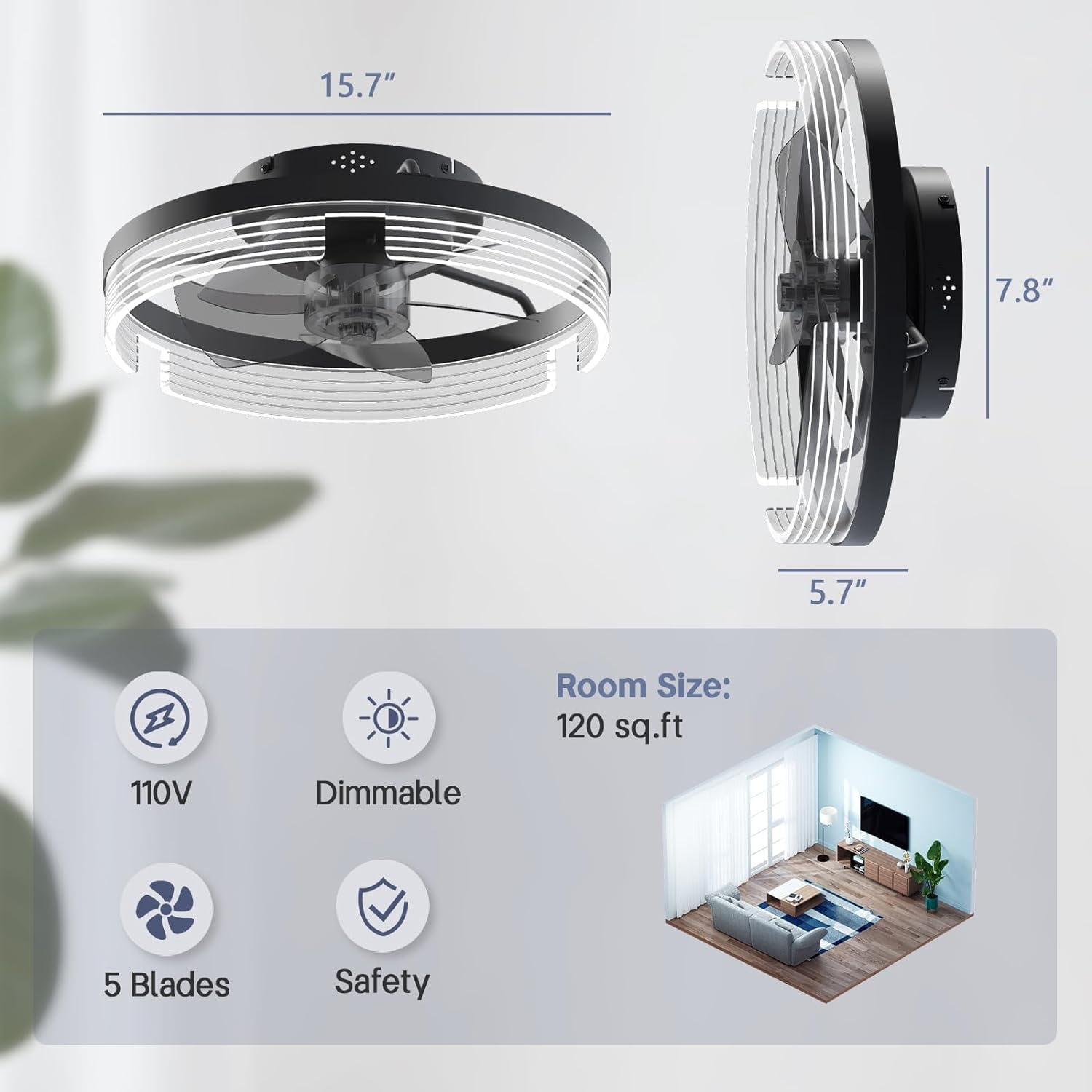 SURNIE 15.7” Black Modern LED Flush Mount Ceiling Fan with Light and Remote Control Dimmable LED light with selectable color temperature of 3000K-6500K and light memory function Smart bladeless design with remote and app control for easy operation Reversible motor for all seasons, promoting air circulation and energy savings Quiet operation suitable for rooms up to 120 sq ft, creating a comfortable sleeping environment Easy installation with detailed instructions, allowing setup in minutes