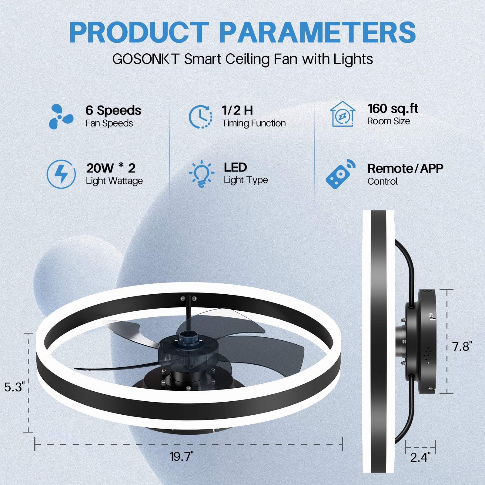 【20″ PERFECT SIZE DESIGN】 The size of the ceiling fan with lights is 20 inches, suitable for rooms of 15-30㎡, this fan light is designed with high light transmittance acrylic, which can make your room look more stylish and bright. It can perfectly decorate your bedroom, living room, dining room, kitchen, apartment, office, hallway, etc. 【SMART APP/REMOTE CONTROL】 SURNIE ceiling fans can be controlled via APP(iOS and Android) or remote control. You can easily control the light color, brightness, fan speed(6 speeds) and timing settings through the APP or remote control. You also can select different modes including summer/winter, normal/night light mode. 【POWERFUL/QUIET MOTOR】 The DC motor ceiling fan is quiet and runs smoothly, provide 6 kinds of wind speeds, which can make indoor air more circulated, and create a quiet and comfortable sleeping environment for you and your family. 【SUPER BRIGHT/ENERGY SAVING】 Unlike traditional fan lights, this newly designed fan light does not require additional bulbs, we use high-quality LED beads, super bright, energy-saving and eye protection, never need to replace the light source. 【MEMORY FUNCTION】 When the fan light is turned on, it will restore the light color and brightness before the last time it was turned off, you can customize the color and brightness of the fan light for your next use. 【EASY TO INSTALL】 Most functional components have been assembled, so you are able to finish the installation within a few minutes. 【EXCELLENT AFTER-SALES SERVICE】 All our products include 12-Months Worry-Free Warranty. Please contact us freely if you have any dissatisfaction with our products, we will provide you with the best service, your comments and suggestions are our driving force.