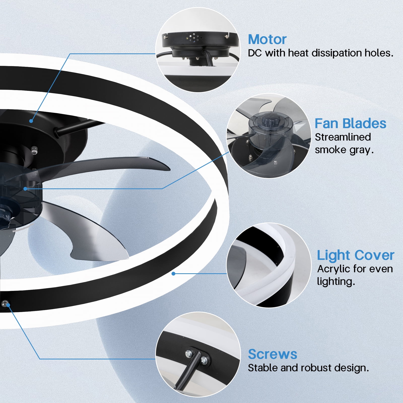 Surnie 20″ Smart Ceiling Fan with Lights Remote APP Control, Modern Flush Mount Bladeless Ceiling Fans, 3 Color 6 Speed Low Profile Ceiling Fan with Light for Bedroom Living Room Kitchen – Black