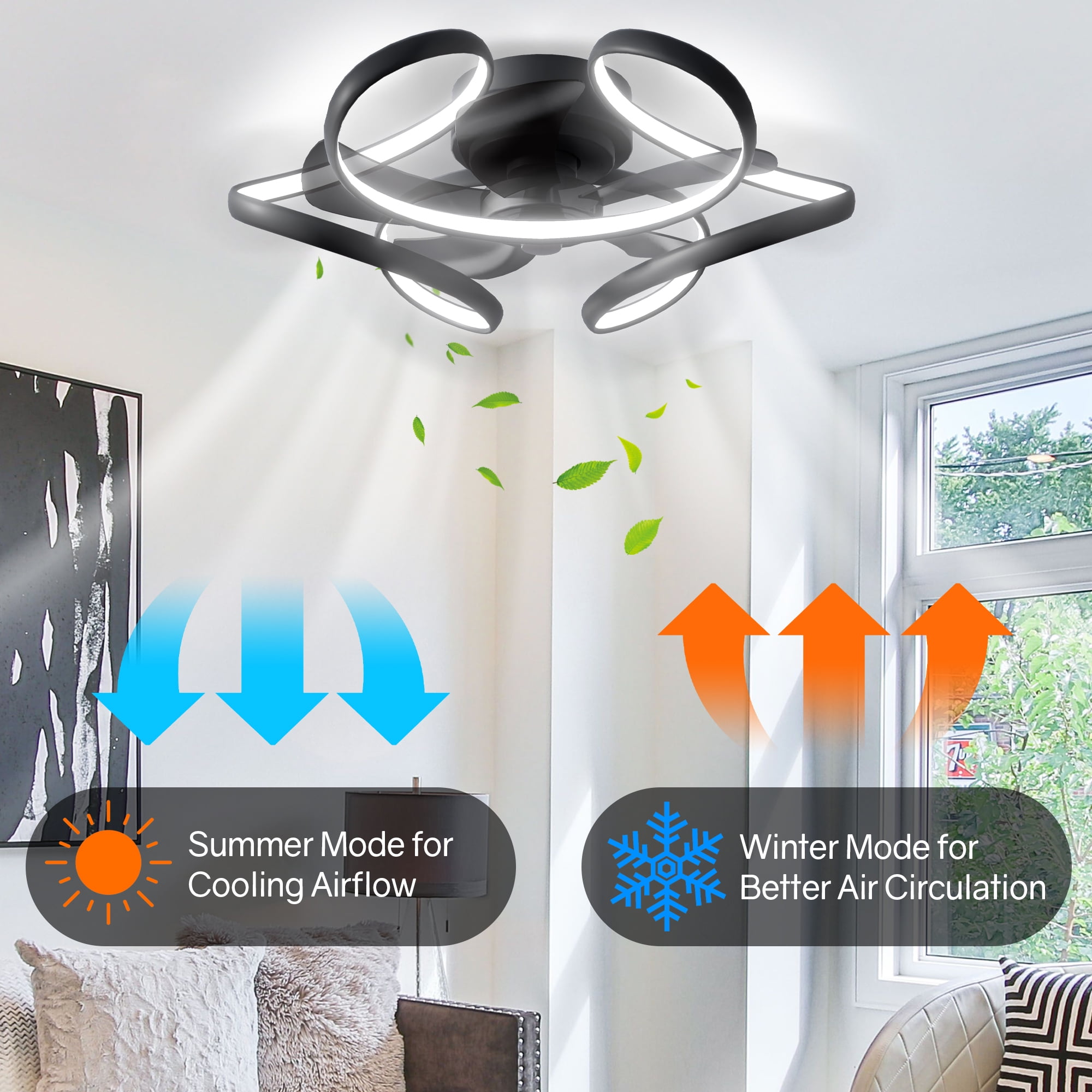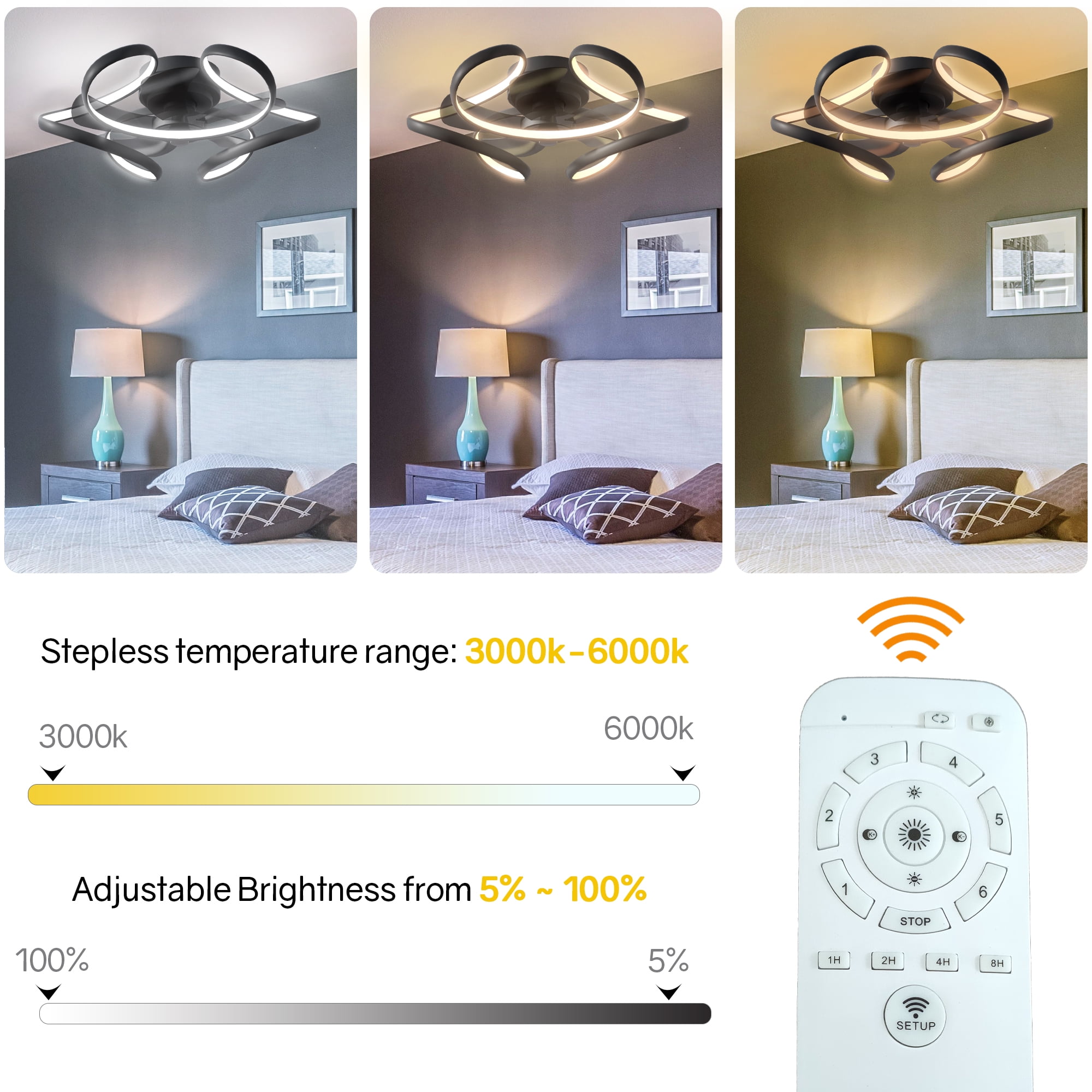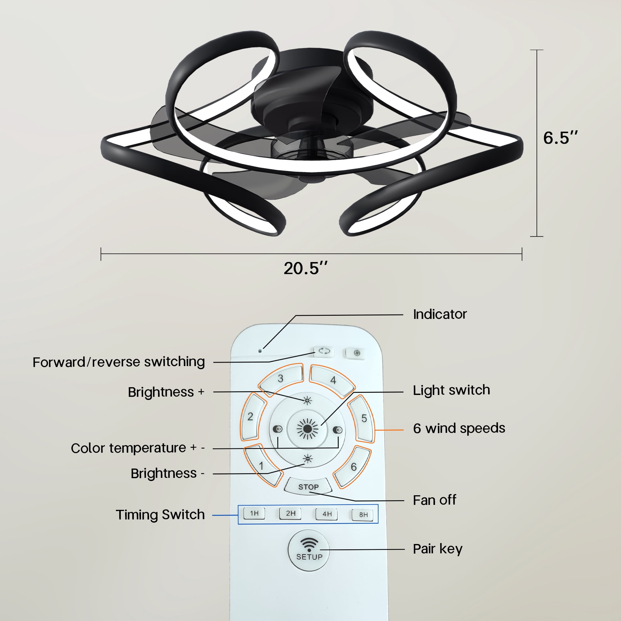 Ultra-Quiet Powerful Motor: Built-in quiet pure copper reversible motor, lower than 30 decibels when working, suitable for studying, working, sleeping and resting. The reversible function is suitable for any season. The forward rotation will bring you strong wind in hot summer; the reverse rotation will promote indoor air circulation in cool winter. Bladeless Ceiling Fan for Indoor Outdoor: 20.5in*6.5inch in size. (520mm in diameter, 165mm in height) . Covering space dimensions up to 100-170 ft�, such as bedrooms, living rooms, study rooms, children’s bedrooms, kitchens, offices, conference rooms, etc.The remote control distance is up to 10m, adjust the mode you want anytime, anywhere. The applicable battery for the remote control is 2*AAA (NOT included in the package) Flush Mount Ceiling Fan Timing Memory: Adjustable 1/2/4/8 hours timing. Set it up before going to bed, it will automatically turn off when you fall asleep to save energy. With memory function, the next opening will still retain the previous mode for convenient use. The geometric curve design increases the visual beauty and is suitable for most home decoration styles. Ceiling Fans with Lights and Remote: Provide you with 6 wind speeds, 3 adjustable color (cool, warm, neutral light). The function of fan and lighting can be controlled separately, making the ceiling fan light both beautiful and practical. After-sales service: The special design of this semi-open fan makes it easy to clean and safer to install and use. The package includes 1*ceiling fan, 1*accessory pack, 1*remote control, 1*instruction manual. Please carefully follow the installation steps in the manual when installing the fan. If you have any questions, please feel free to contact us, we will answer you comprehensively.