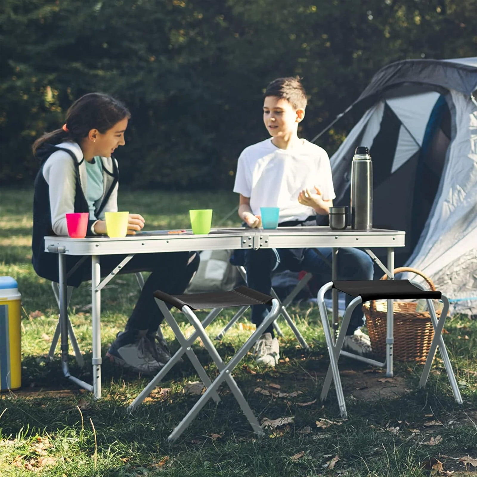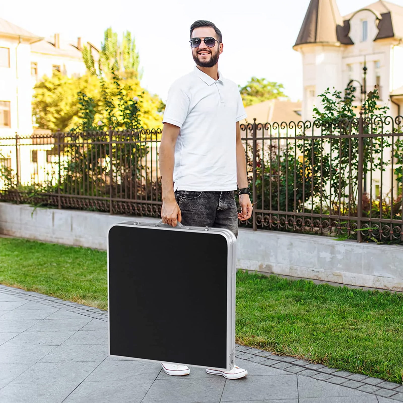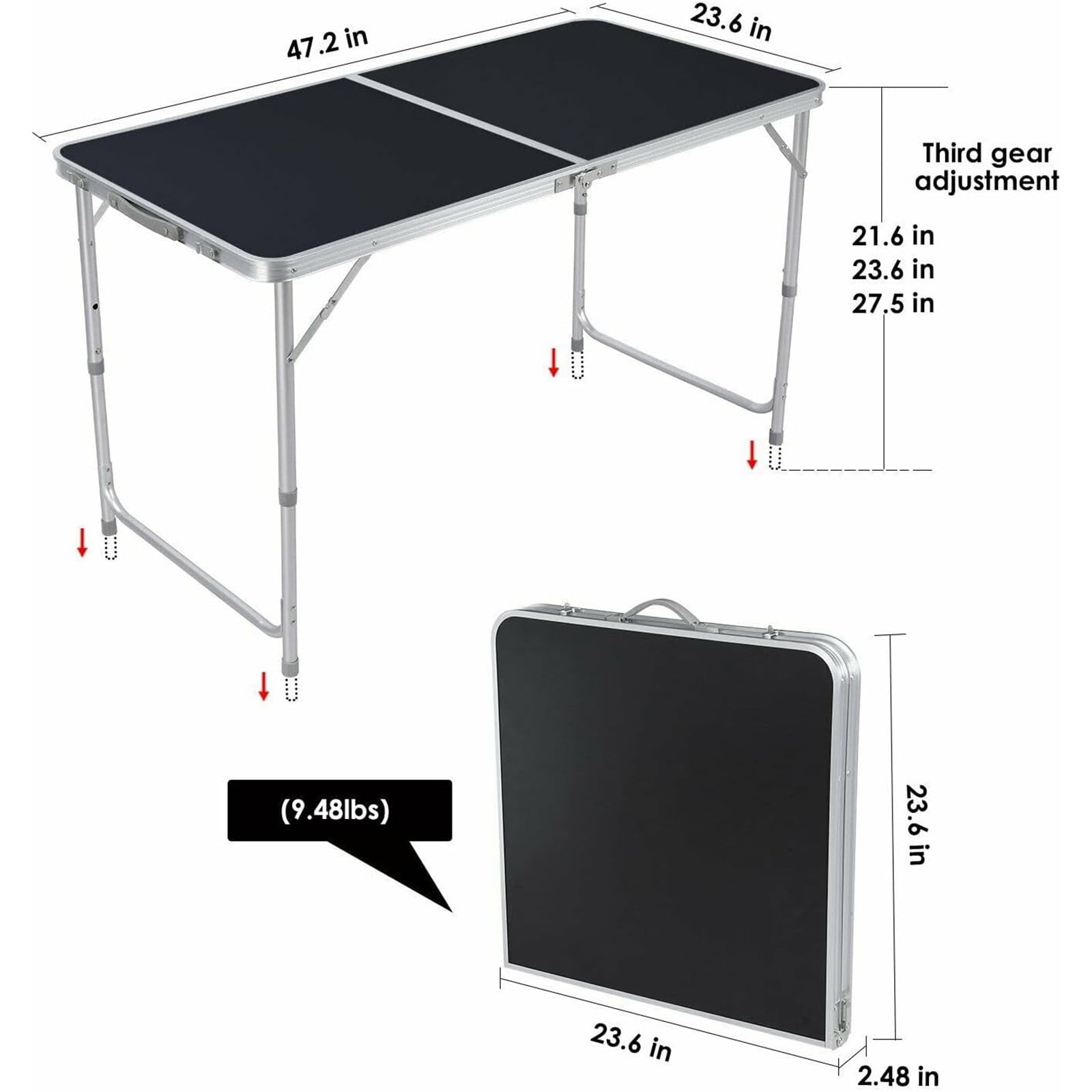 Portable and foldable design for easy transport and storage Durable aluminium alloy construction for long-lasting use Adjustable height settings of 21.6″, 23.6″, and 27.5″ to accommodate diverse needs Moisture-proof and weather-resistant top for outdoor use Easy-to-clean surface for hassle-free maintenance Compact folded size of 23.6″ x 23.6″ x 2.48″ for convenient storage and transport Sturdy steel frame with a powder-coated, weather-resistant finish for added durability Impact-resistant edges and corners to protect the table from damage Spacious size of 47″ x 23.5″ accommodating 4-6 people comfortably for various activities 100 lb weight capacity to support your needs