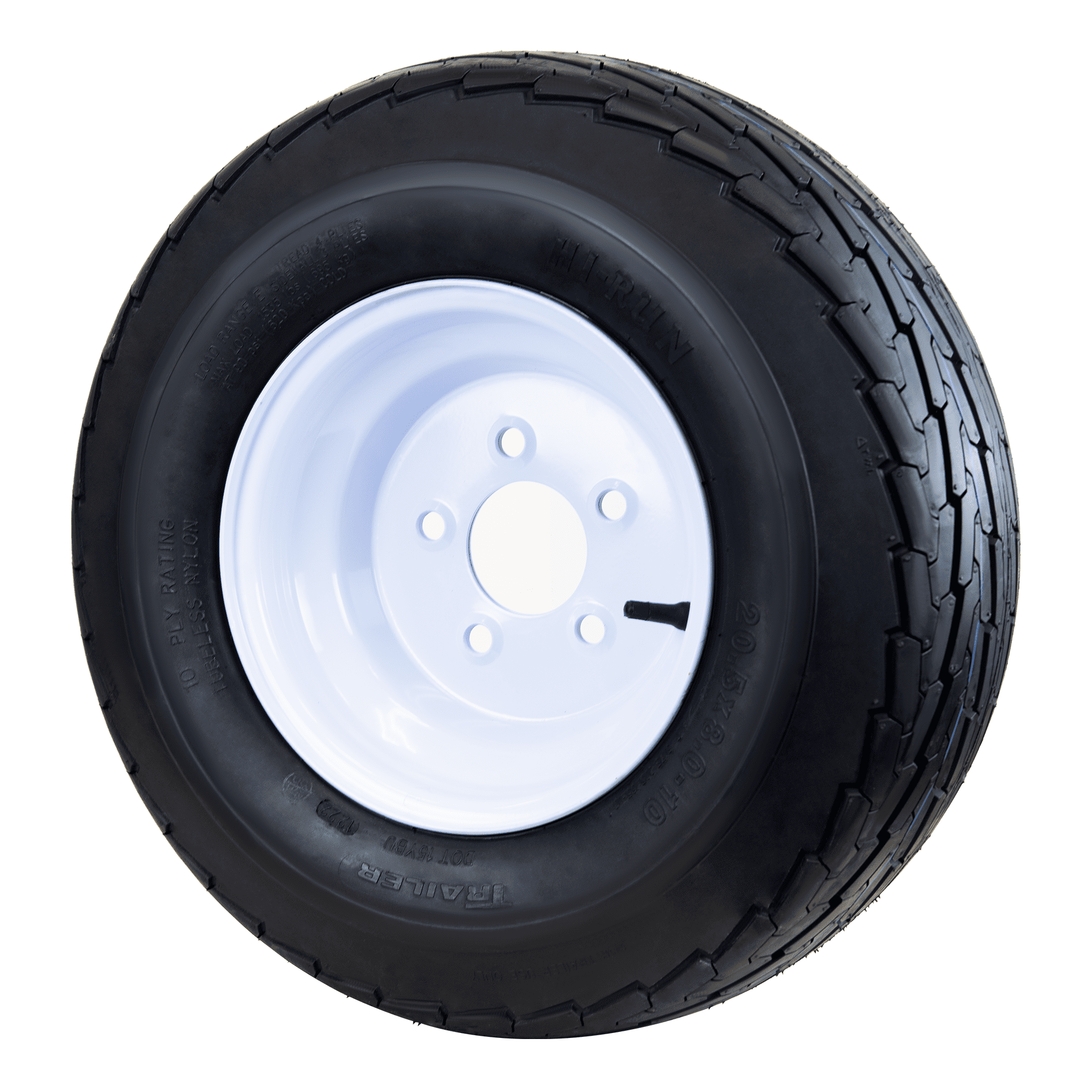 The Hi Run ST Bias Boat Trailer Tire is specifically engineered to deliver excellent performance while transporting your boat or other watercraft. It features strengthened sidewalls to handle the weight of your boat and offers greater load capacities compared to conventional tires. This Hi Run trailer tire meets all OEM specifications where bias tires are required. The tough and durable construction ensures that it will not wear down as quickly and will be able to keep its traction for longer. This 6-ply, trailer wheel tire provides strength, durability and safety for trailer tire needs. The Hi Run ST bias boat trailer tire and Wheel Assembly is a great replacement for your trailer when wear makes it necessary or for any trailer not equipped with a spare. Hi Run ST Bias Boat Trailer Tire with Wheel Assembly 20.5X8.00-10/L : Tire and Wheel assembly only, no additional parts included$The Hi Run ST Bias Boat Trailer Tire and Wheel Assembly is a great replacement for your trailer when wear makes it necessary or for any trailer not equipped with a spare$This durable, long-life tire is made to OE specifications$Run your trailer with Hi Run for strength, durability and safety Number of lug holes: 5
