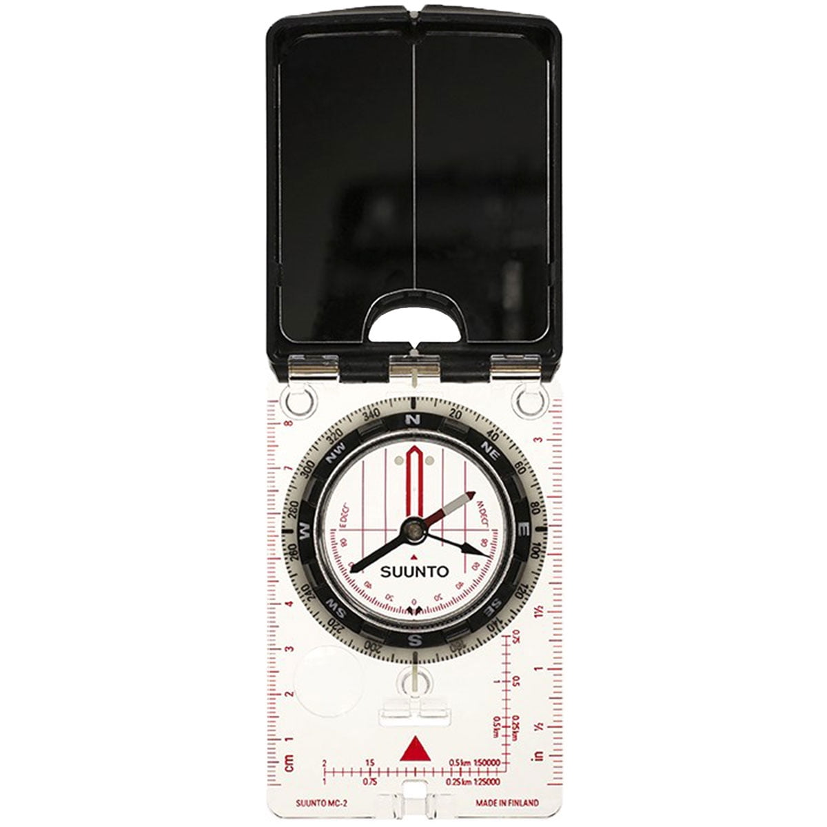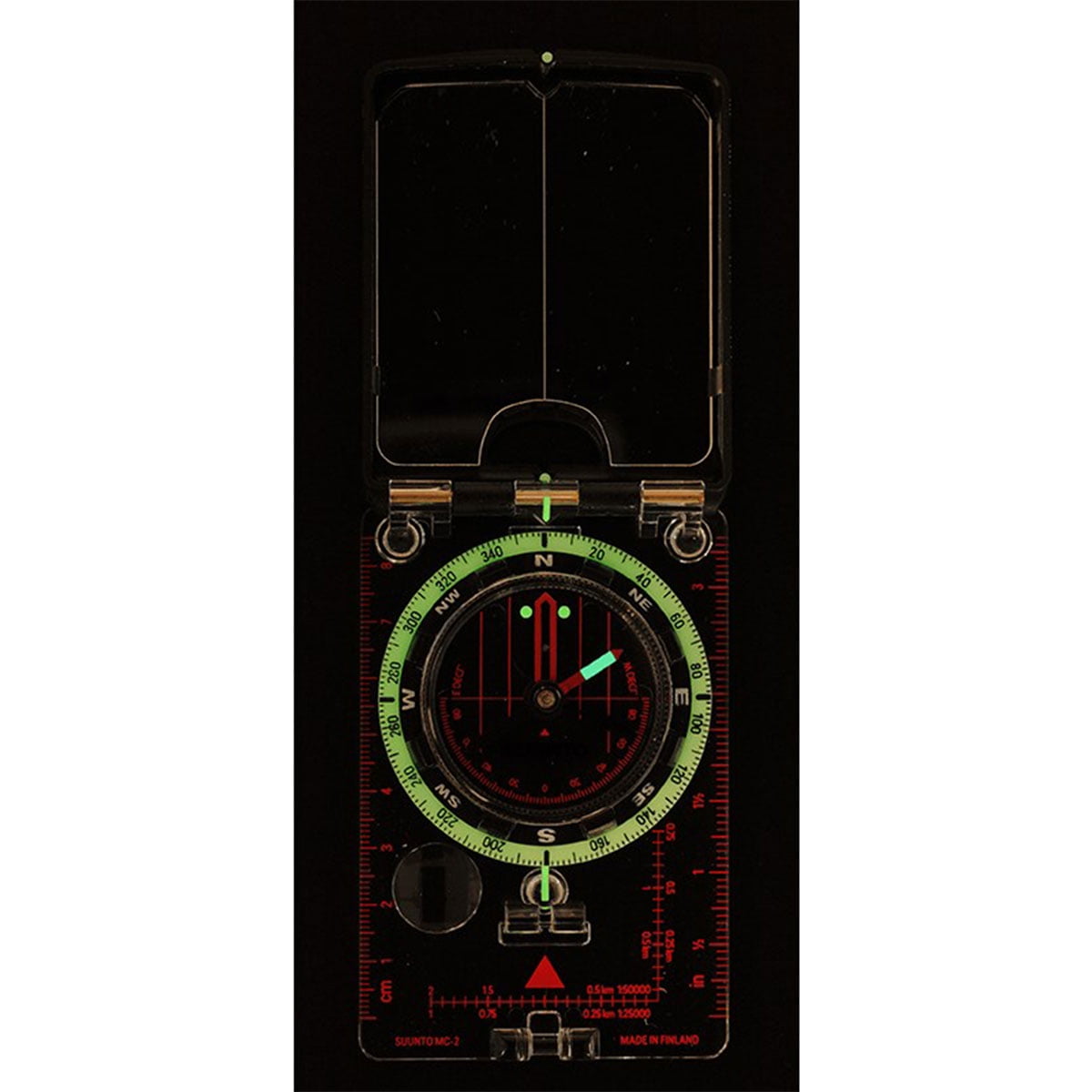High grade steel needle with jewel bearing Balanced for northern hemisphere Adjustable declination correction Liquid filled capsule for stable operation Mirror for sighting bearings and signaling Sighting hole and notch for accurate bearings Luminescent markings for working in low light