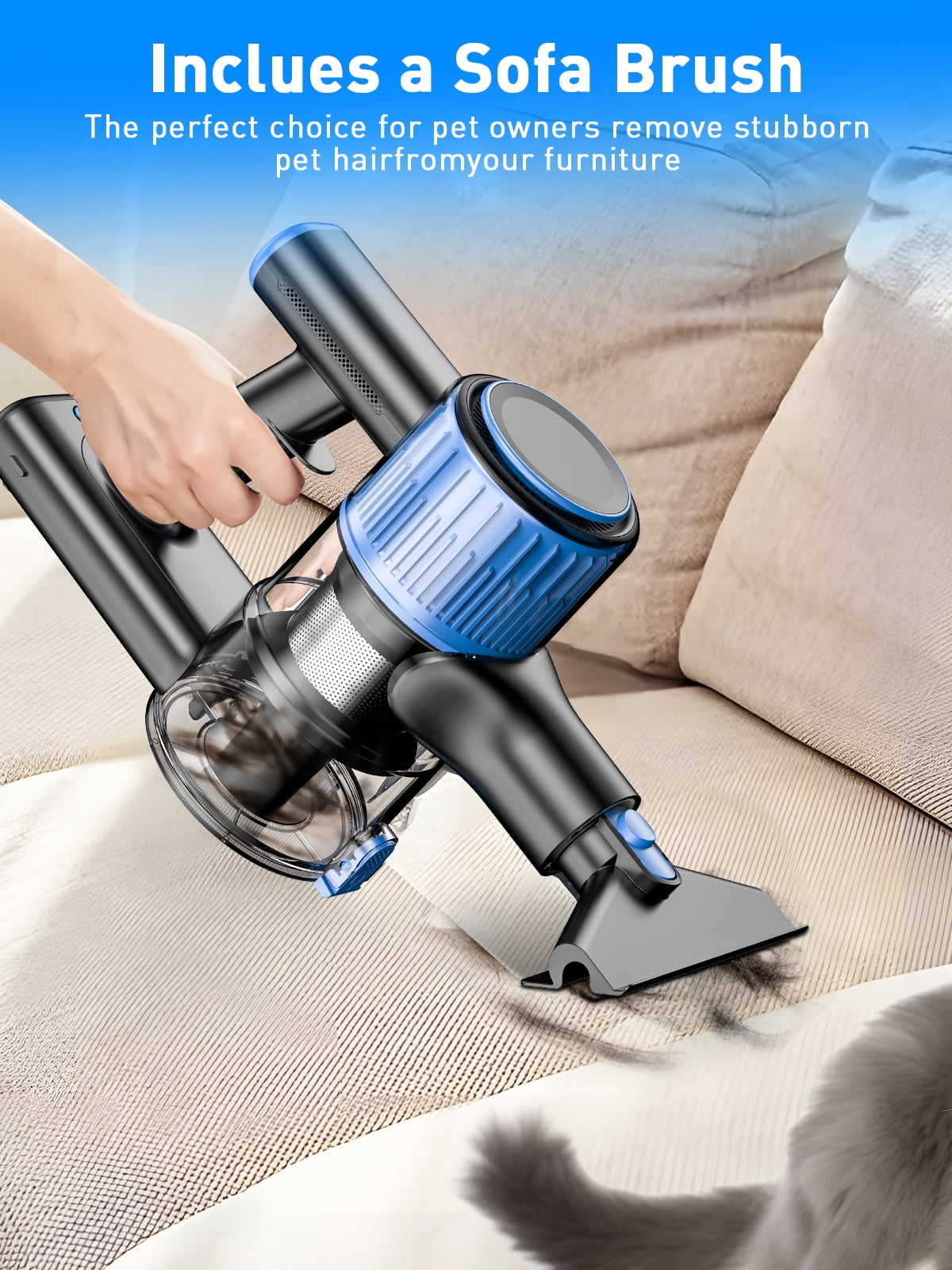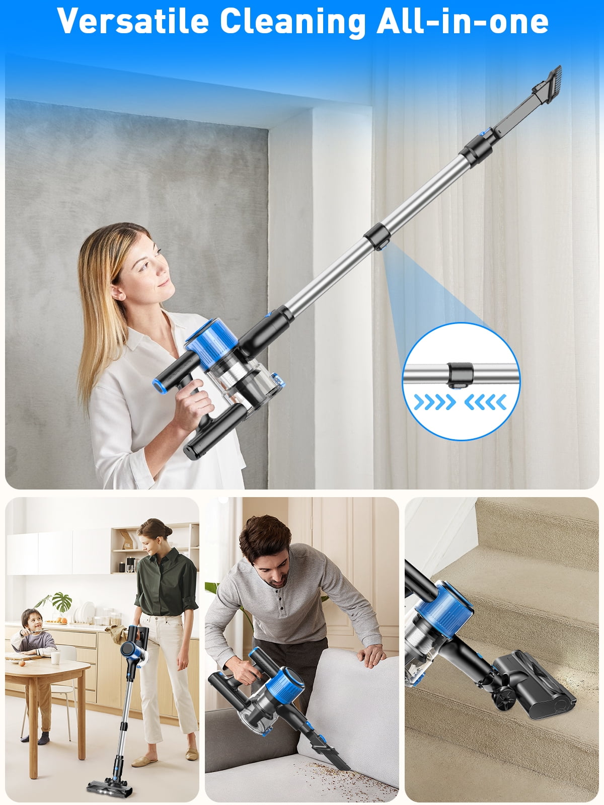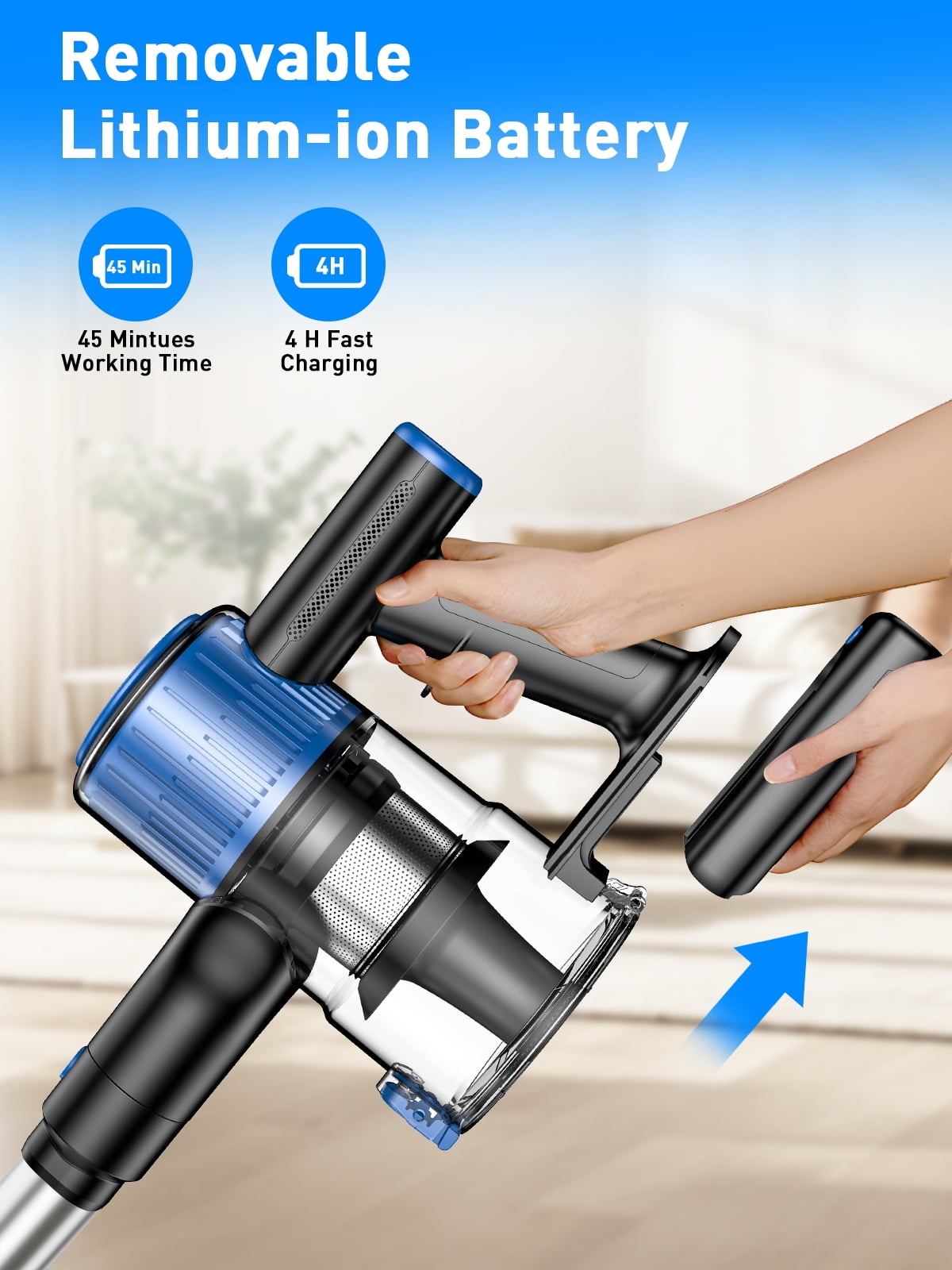 SUXIANGVAC Cordless Vacuum Cleaner, 28Kpa 8 in 1 Lightweight Stick Vacuum with Sofa Brush, 300W Motor, Anti-Tangle Vacuum, 40mins Runtime Rechargeable Vacuums for Home, Hardwood Floor, Carpet, Pet Hair, Blue Special Feature: Separate battery, charged independently Up to 40 minutes(Max) Washable HEPA filters keep stable suction performance Lightweight body with 180° rotatable LED brush head 1.5L big dust cup 8-in-1 handheld cordless stick vacuum great for hard floor & low pile carpet 3 modes suction with 300W high-performance cyclonic motor 99.98% effective filtration
