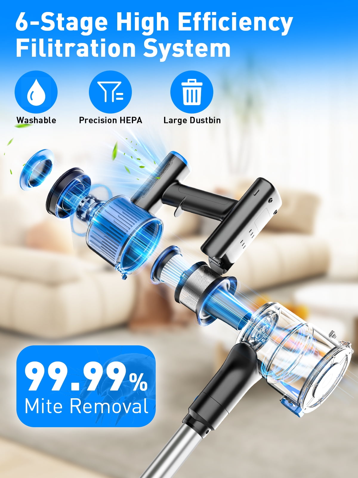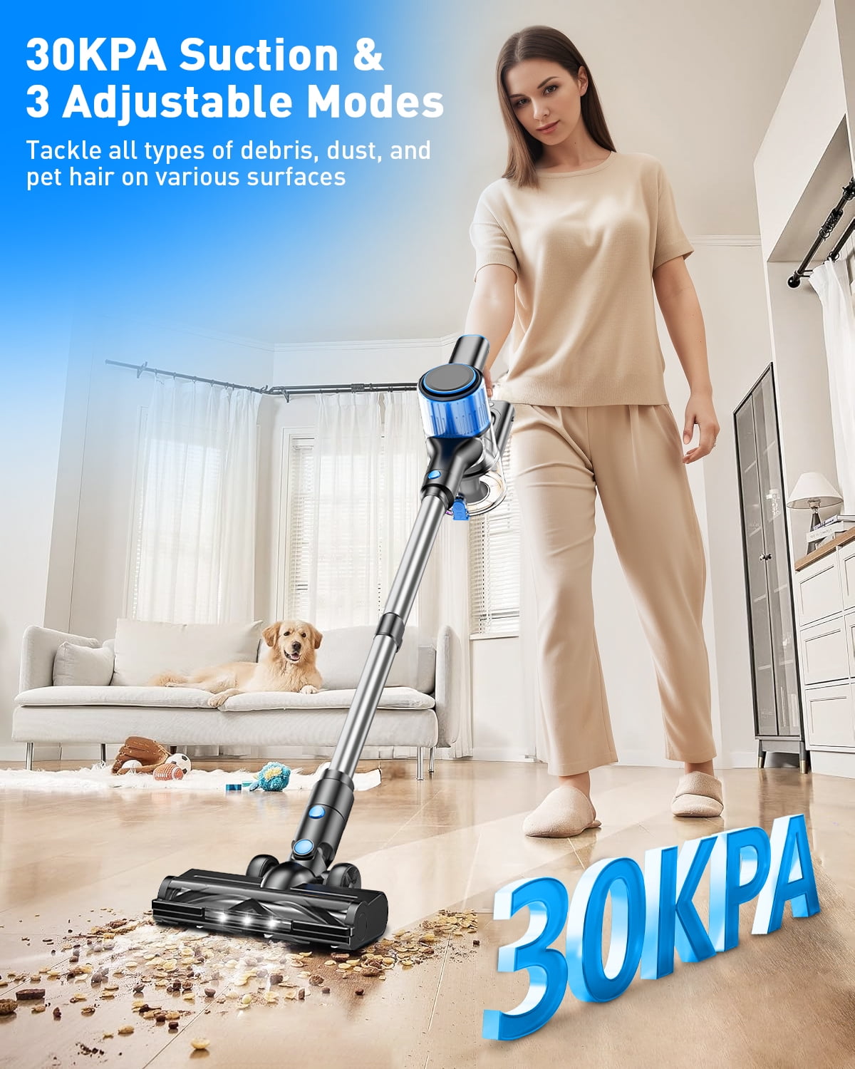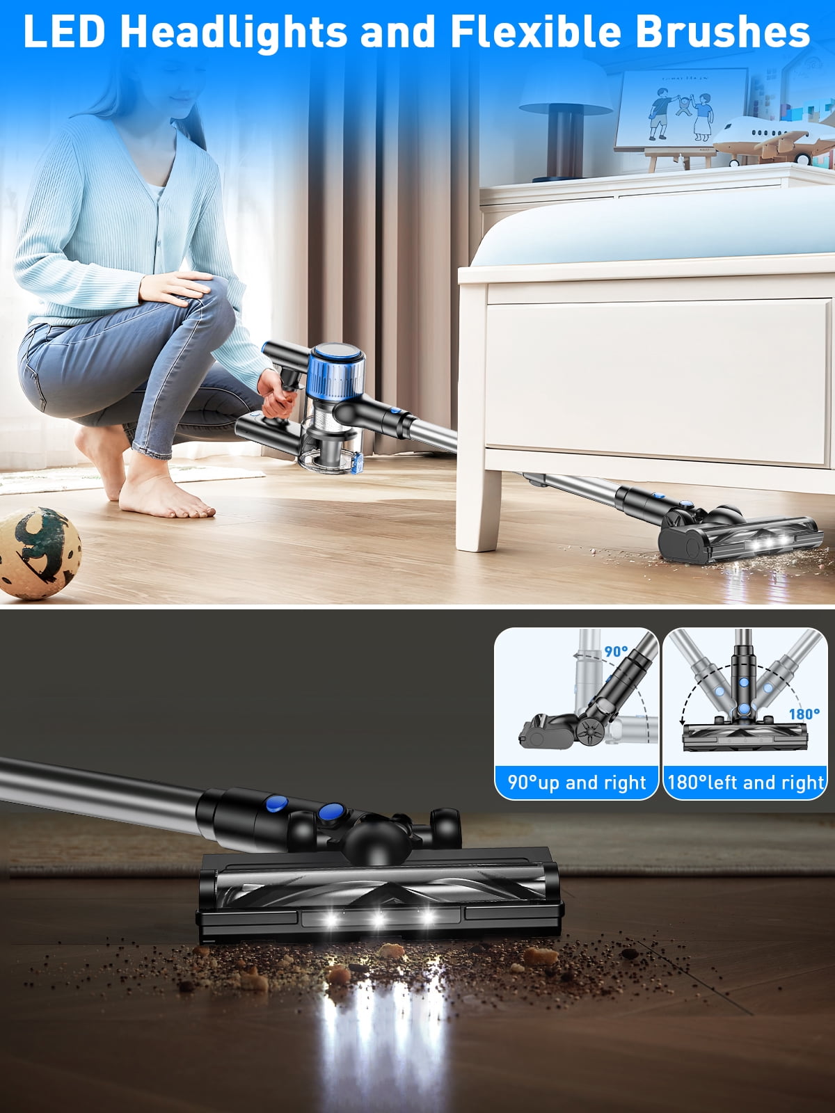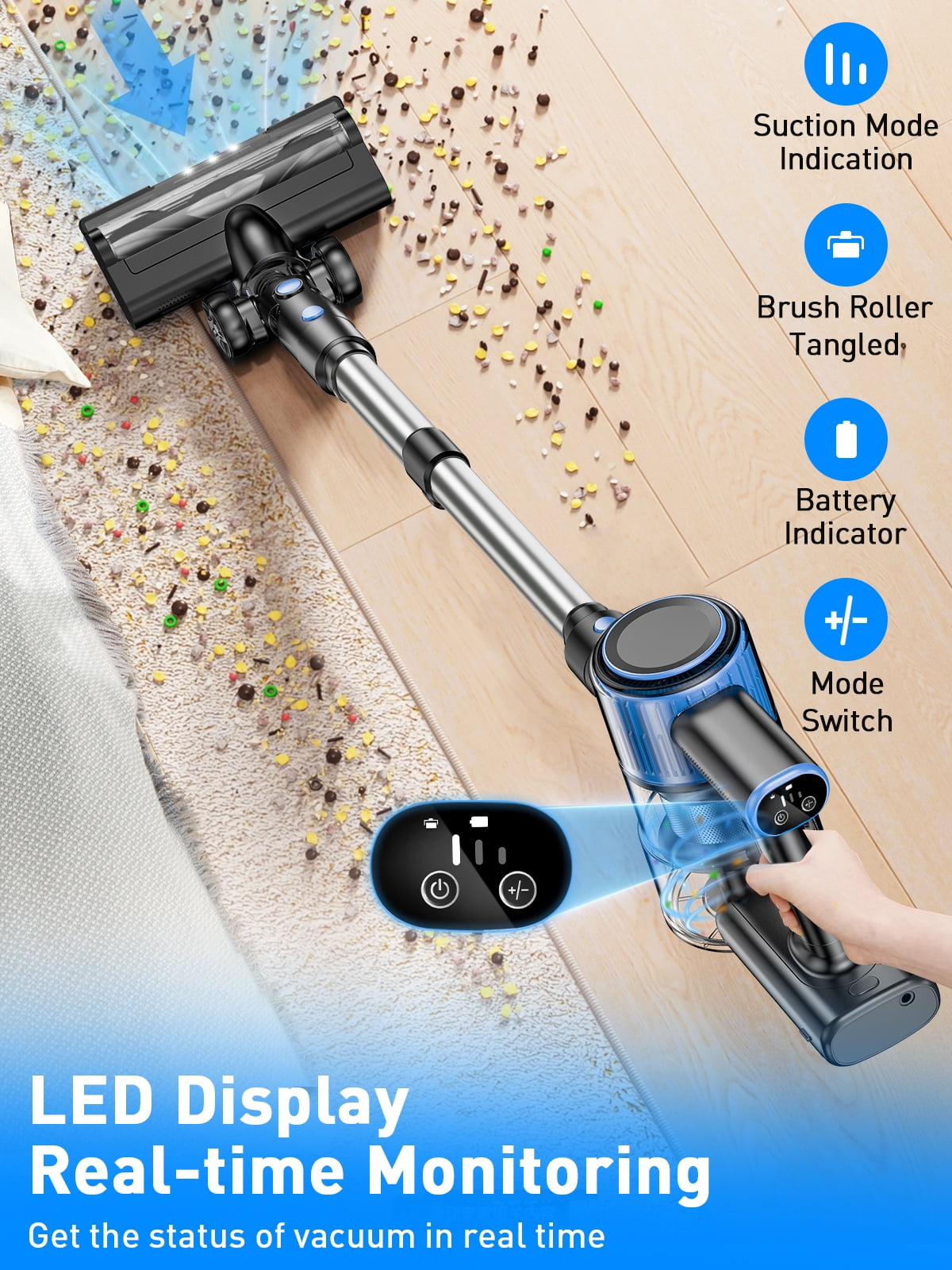 [Powerful 28Kpa Suction Power & Three Modes]: The cordless vacuum cleaner generates high-speed airflow with an upgraded 300W powerful motor, which is very energy-saving and efficient, generates less heat and makes less noise. 3 gears’ suction adjustment and provides up to 30Kpa suction in maximum mode. From deep cleaning carpet dust, cat litter, dog food crumbs, pet hair, and marble, tile, and hardwood floor. [LED Display A Glance]: The vacuum cleaner cordless is equipped with an LED display at a glance, which helps you know the current performance of the vacuum cleaner at a glance. The LED control panel allows you to easily adjust the vacuum power, which is more convenient and worry-free than traditional button operation. The control panel displays battery level, suction performance, brush clogged alarm and suction clogged alarm. [Efficient Filtration & Extra Filter]: Stick vacuum cleaner with all-new cyclone technology and high-density meshing. Captures the smallest particles on flat surfaces, with up to 99.99% efficiency of fine particles as small as 0.1um. Comes with 2 HEPA washable filters to prolong the life of the vacuum cleaner, effectively prevent dust accumulation and deliver fresh air, making your home more environmentally friendly. Detachable Battery & Long-lasting Runtime: The large-capacity detachable battery offers up to 40 minutes of cleaning in standard mode, perfect for larger areas without the need for frequent recharging. Choose from two charging options: charge the vacuum cleaner directly or charge the battery separately. Lightweight & Flexible LED Brush Head: Cordless stick vacuum illuminate dark corners with the LED brush head, ensuring no spot is missed. The flexible 180° swivel and 90° tilt allow for easy maneuvering under furniture and around obstacles, efficiently removing dust, debris, and hair. 8-in-1 Versatile Cleaning: This cordless vacuum includes a 2-in-1 brush, sofa brush, and extendable metal tube, converting into a handheld vacuum for stairs, sofas, desks, and cars. The extendable tube is ideal for high places like curtains and ceilings, offering effortless one-handed operation.