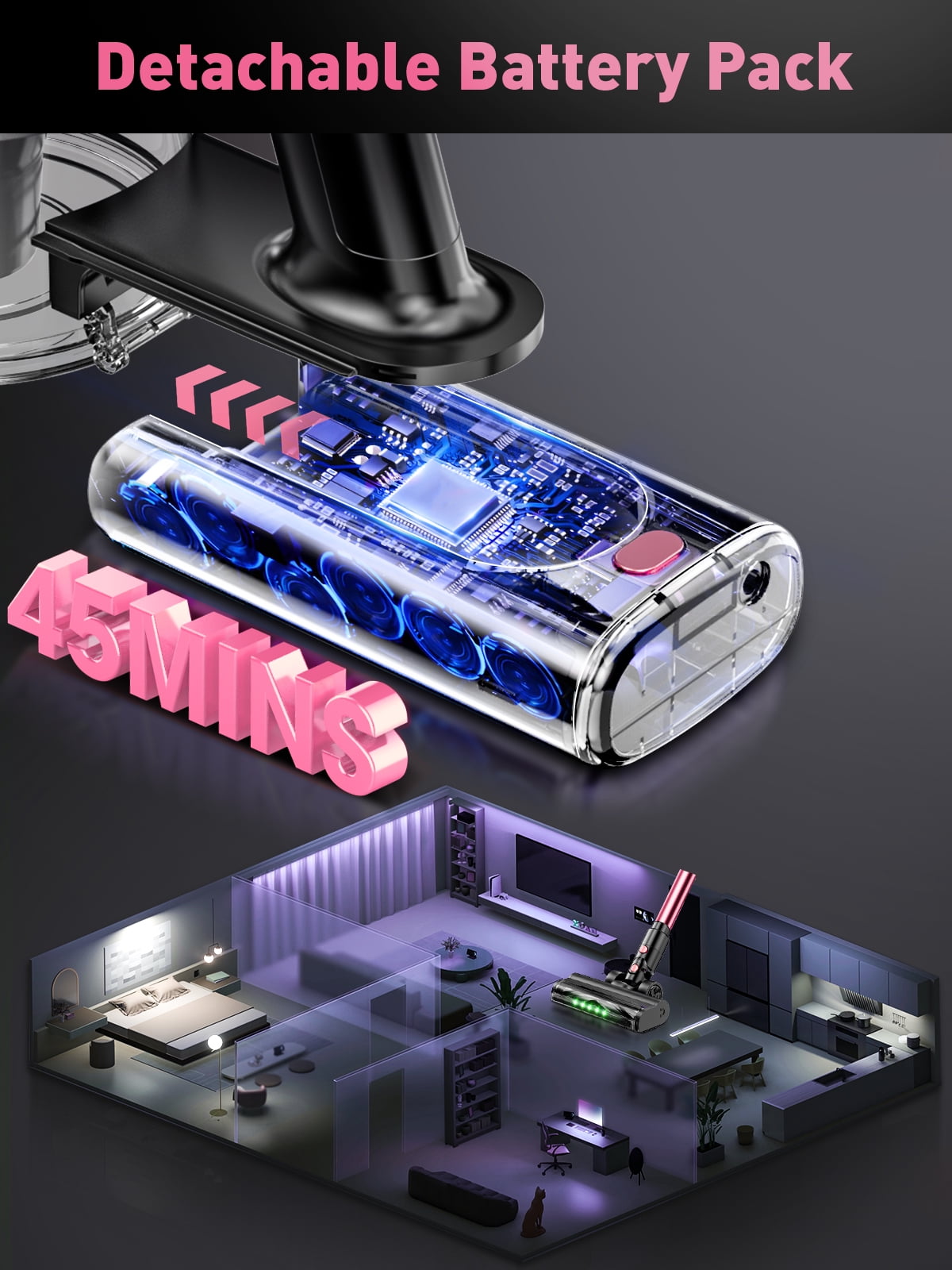 SUXIANGVAC Cordless Vacuum Cleaner, 33Kpa 8 in 1 Lightweight Stick Vacuum with Sofa Brush, 350W Motor, Anti-Tangle Brush with Green Light, 40mins Runtime Rechargeable Vacuums for Hardwood Floor, Carpet, Pet Hair, Pink