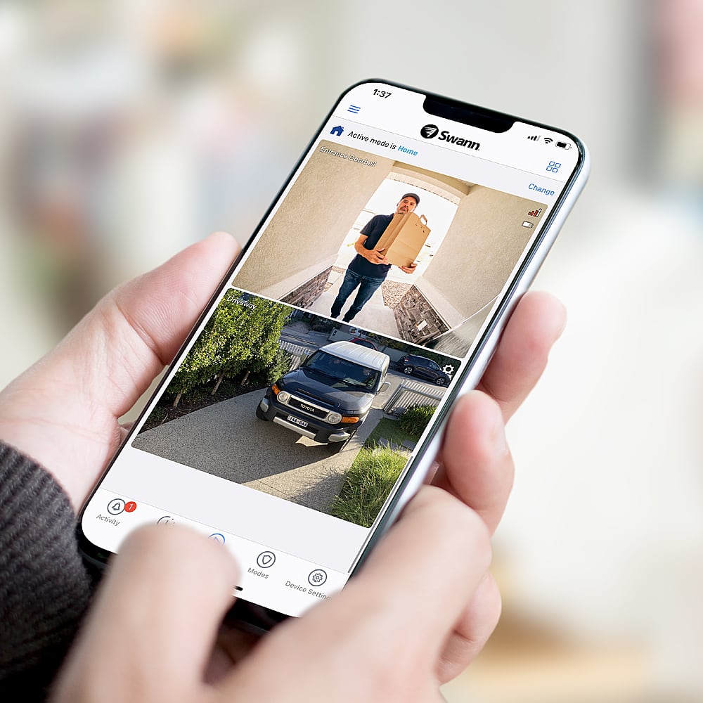 CoreCam Security Camera offers easy-to-install, completely wireless security. Featuring stunning 1080p Full HD vide in a modern design, it’s the perfect solution offering smart, convenient, and affordable surveillance. Best of all, CoreCam’s rechargeable lithium batteries are long-lasting. On a full charge enjoy up to 3 months of recordings (based on average usage; 20 x 15 second clips per day), so you can set and forget. Secure it with the screw-in mount to watch over any area from any angle. Mount the camera indoors or outdoors as the weatherproof design is built to withstand rain, snow and heat. CoreCam can even see in the dark up to 26ft (8m), with powerful infrared night vision that kicks in automatically! Sleep comfortably knowing the CoreCam Security Camera is looking out for you. Have a presence at your home with 2-way audio, giving you peace of mind while you’re away. You can check in on loved ones in need of care, communicate with delivery people remotely, even scare off intruders from your phone. Equipped with Swann’s True Detect, warm objects such as people, cars, and large animals trigger video recording and push notifications straight to you. Use voice commands via Alexa and Hey Google to see what’s happening hands-free! CoreCam has free storage allowing you to store thousands of clips onto the included 32GB Micro SD card, with greater storage available in Secure+ Member Plans. Expand your security by adding more Wi-Fi cameras and multi-camera Swann surveillance systems – and manage them all using the Swann Security App! Secure to the core with long battery life for extra convenience, let the CoreCam Security Camera look out for your family and property. It’s security made smarter, from Swann.